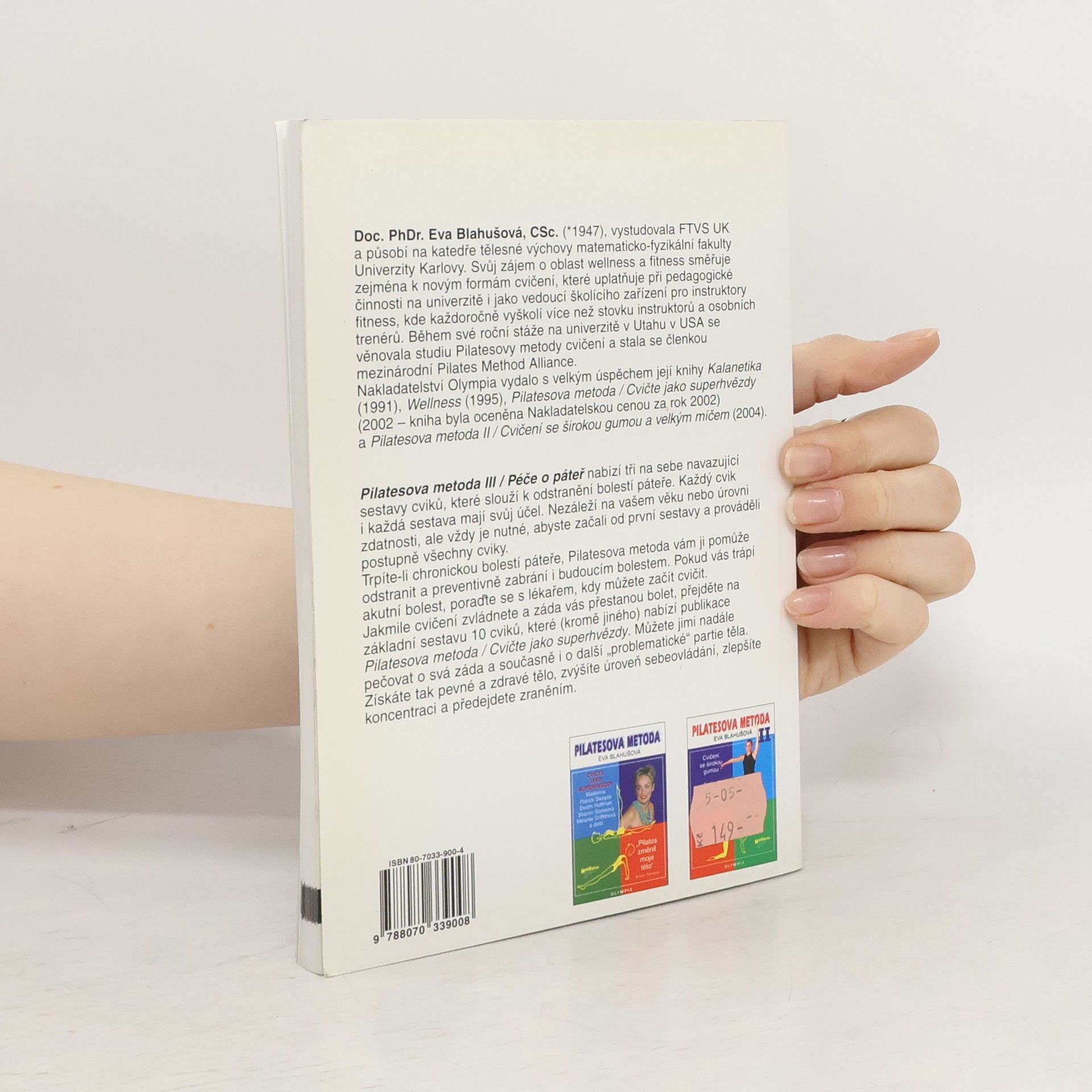 Cvičení . pro odstranění bolestí . pro redukci napětí . pro lepší držení těla . pro větší rozsah pohybu . pro zvětšení síly . pro lepší koordinaci . pro účinnější dýchání Pilatesova metoda III / Péče o páteř nabízí tři na sebe navazující sestavy cviků, které slouží k odstranění bolestí páteře. Každý cvik i každá sestava mají svůj účel. Nezáleží na vašem věku nebo úrovni zdatnosti, ale vždy je nutné, abyste začali od první sestavy a prováděli postupně všechny cviky. Trpíte-Ii chronickou bolestí páteře, Pilatesova metoda vám ji pomůže odstranit a preventivně zabrání i budoucím bolestem. Pokud vás trápí akutní bolest, poraďte se s lékařem, kdy můžete začít cvičit. Získáte pevné a zdravé tělo, zvýšíte úroveň sebeovládání, zlepšíte koncentraci a předejdete zraněním.