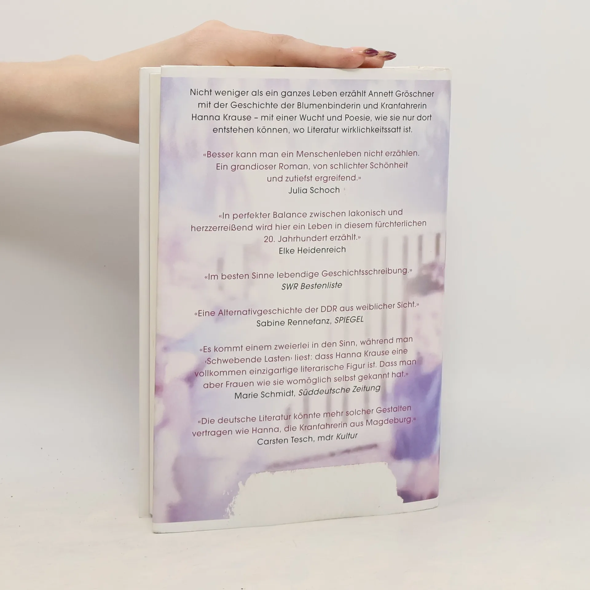 Nicht weniger als ein ganzes Leben erzählt Annett Gröschner mit der Geschichte der Blumenbinderin und Kranfahrerin Hanna Krause – mit einer Wucht und Poesie, wie sie nur dort entstehen können, wo die Literatur wirklichkeitssatt ist.Hanna Krause war Blumenbinderin, bevor das Leben sie zur Kranführerin machte. Sie hat zwei Revolutionen, zwei Diktaturen, einen Aufstand, zwei Weltkriege und zwei Niederlagen, zwei Demokratien, den Kaiser und andere Führer, gute und schlechte Zeiten erlebt, hat sechs Kinder geboren und zwei davon nicht begraben können, was ihr naheging bis zum Lebensende. Hatte später, nachdem ihr Blumenladen längst Geschichte war, von einem Kran in der Halle eines Schwermaschinenbaubetriebes in Magdeburg einen guten Überblick auf die Beziehungen der Menschen zehn Meter unter ihr und starb rechtzeitig, bevor sie die Welt nicht mehr verstand. Hanna Krause blieb bis zu ihrem Tod eine, die das Leben nimmt, wie es kommt. Ihr einziges anständig bleiben. Annett Gröschners Roman erzählt die Geschichte eines Jahrhunderts in einem einzigen Leben und gibt, mit Hanna, denen ein Gesicht, die zu oft unsichtbar bleiben. Ein Roman über das Ende des Industriezeitalters und seiner Heldinnen im Osten Deutschlands – und über eine gewöhnliche Frau in diesem unfassbaren 20. Jahrhundert.