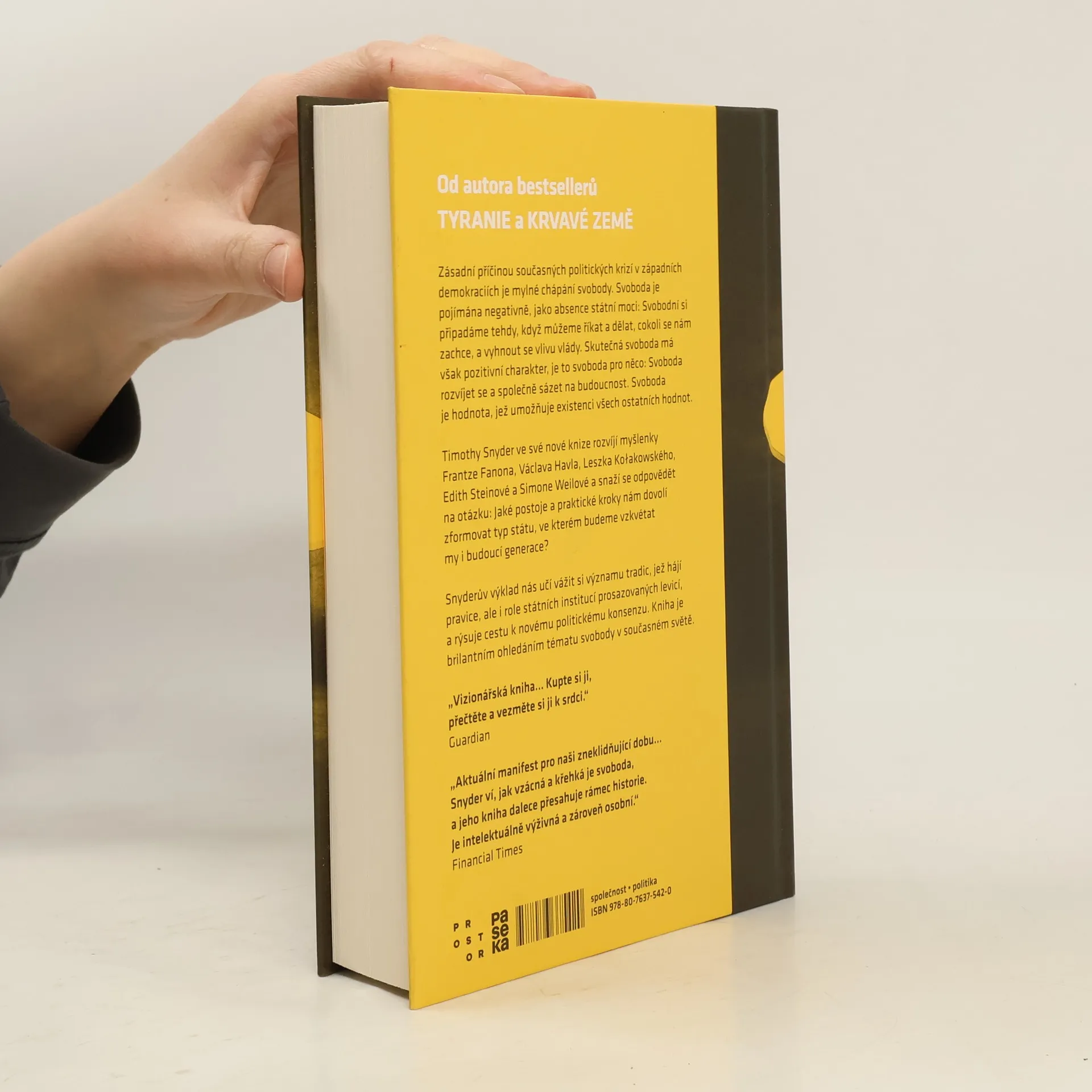 Zásadní příčinou současných politických krizí v západních demokraciích je mylné chápání svobody. Svoboda je pojímána negativně, jako absence státní moci: Svobodní si připadáme tehdy, když můžeme říkat a dělat, cokoli se nám zachce, a vyhnout se vlivu vlády. Skutečná svoboda mávšak pozitivní charakter, je to svoboda pro něco: Svoboda rozvíjet se a společně sázet na budoucnost. Svoboda je hodnota, jež umožňuje existenci všech ostatních hodnot. Timothy Snyder ve své nové knize rozvíjí myšlenky F. Fanona, V. Havla, L. Kołakowského, E. Steinové a S. Weilové. Kniha se snaží především odpovědět na otázku: Jaké postoje a praktické kroky nám dovolí zformovat typ státu, ve kterém budeme vzkvétat my i budoucí generace? Snyderův výklad nás učí vážit si významu tradic, jež hájí pravice, ale i role státních institucí prosazovaných levicí, a rýsuje cestu k novému politickému konsenzu. Kniha je brilantním ohledáním tématu svobody v současném světě.