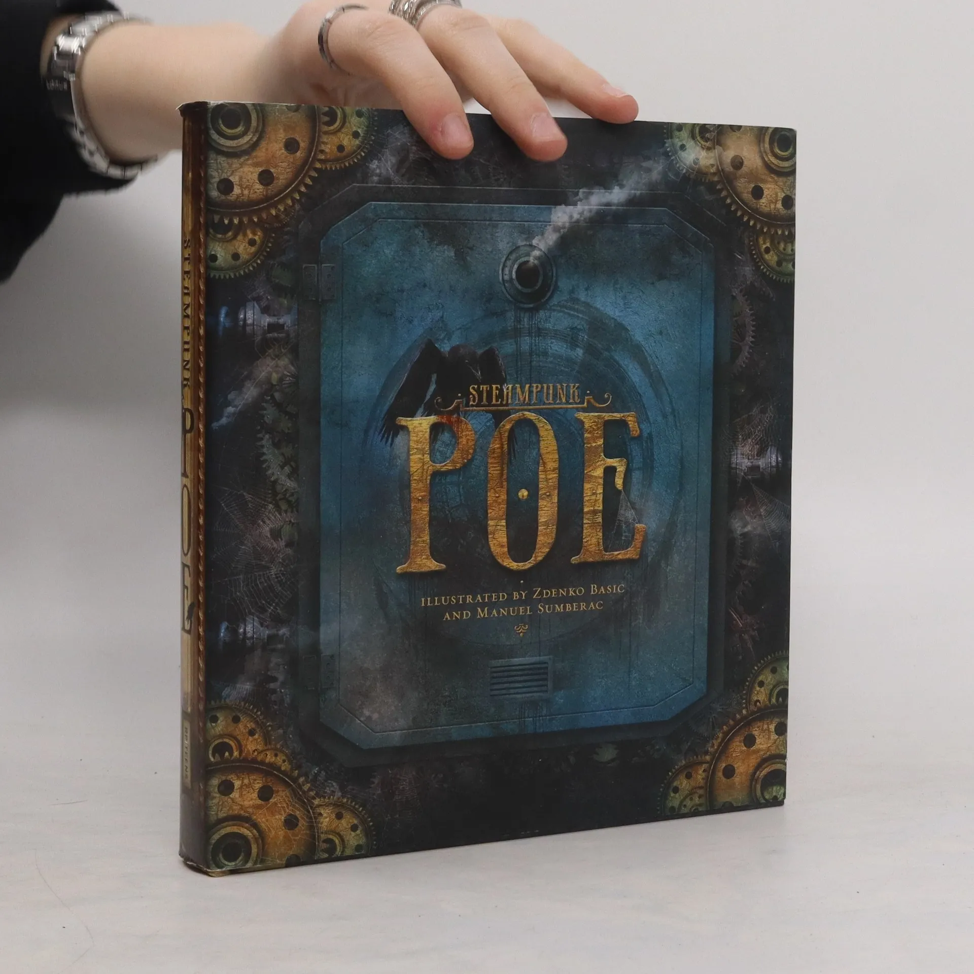 Presents a collection of Poe's short stories and poems, including "The Tell-Tale Heart," "The Fall of the House of Usher," and "The Raven," accompanied by steampunk-inspired illustrations.