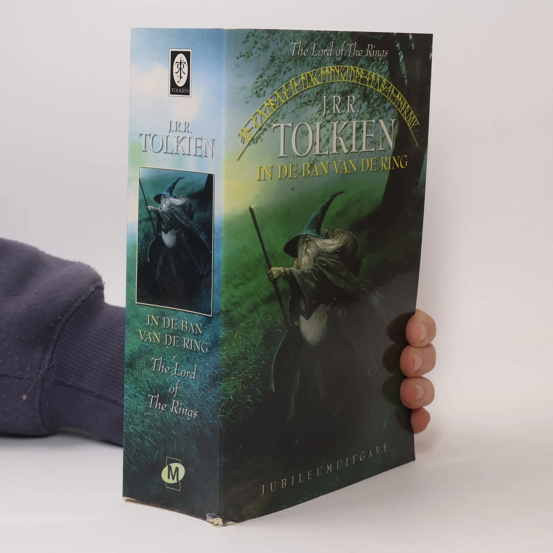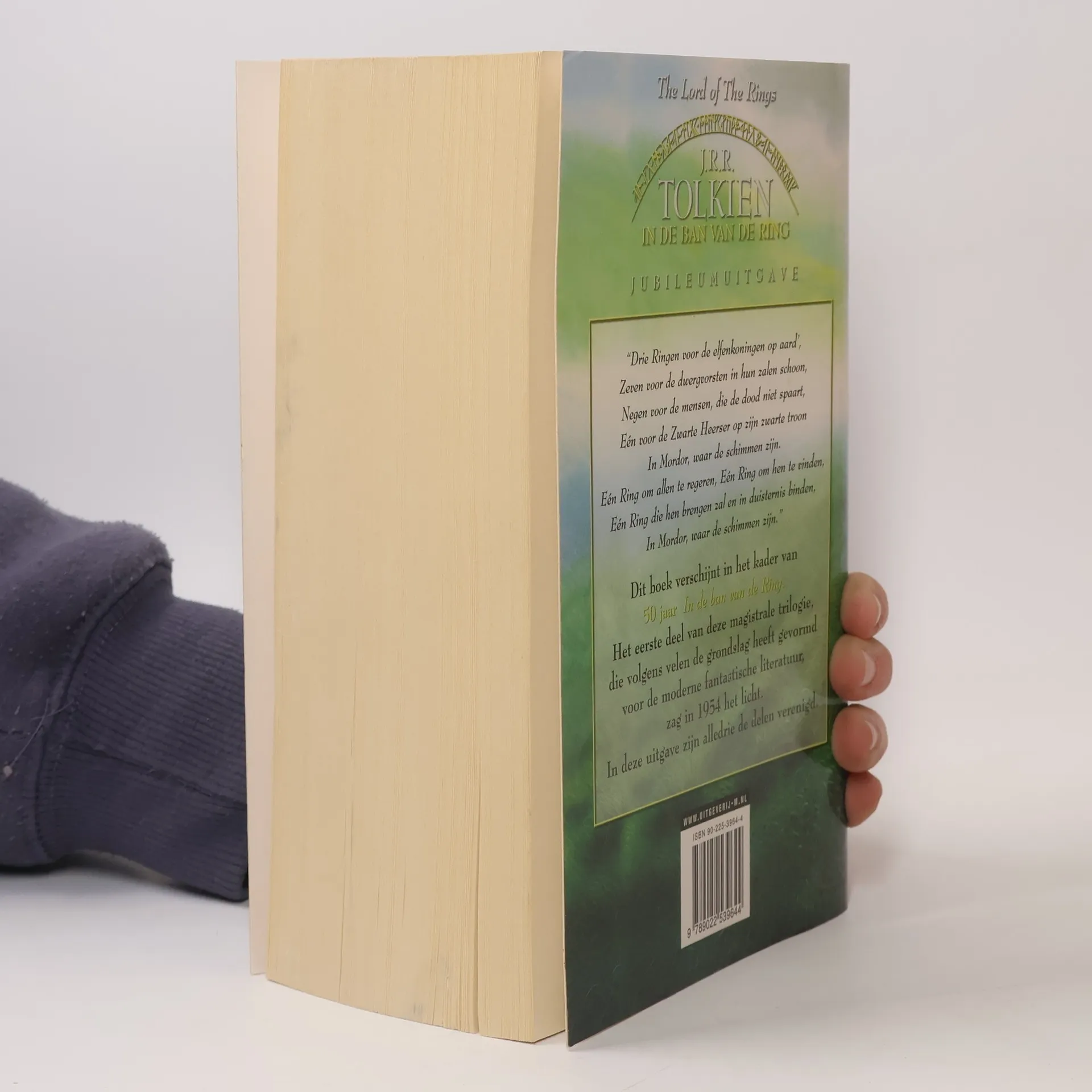 “Drie Ringen voor de elfenkoningen op aard’, Zeven voor de dwergvorsten in hun zalen schoon, Negen voor de mensen, die de dood niet spaart, Eén voor de Zwarte Heerser op zijn zwarte troon In Mordor, waar de schimmen zijn. Eén ring om allen te regeren, Eén ring om hen te vinden, Eén Ring die hen brengen zal en in duisternis binden, In Mordor, waar de schimmen zijn." Dit boek verschijnt in het kader van 50 jaar In de ban van de Ring. Het eerste deel van deze magistrale trilogie, die volgens velen de grondslag heeft gevormd voor de moderne fantastische literatuur, zag in 1954 het licht. In deze uitgave zijn alledrie de delen verenigd.