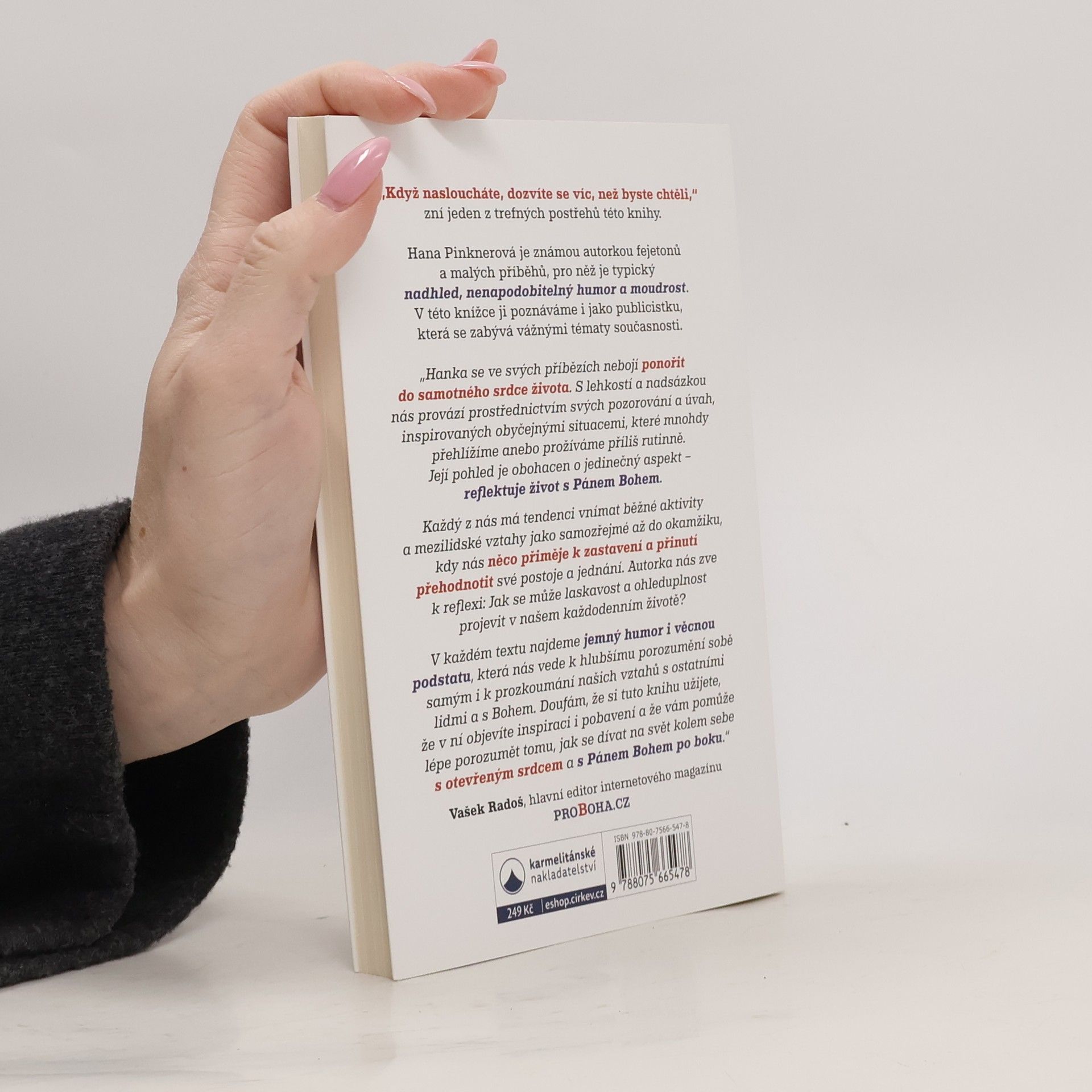 Když nasloucháte, dozvíte se víc, než byste chtěli,“ zní jeden z trefných postřehů této knihy. Hana Pinknerová je známou autorkou fejetonů a malých příběhů, pro něž je typický nadhled, nenapodobitelný humor a moudrost. V této knížce ji poznáváme i jako publicistku, která se zabývávážnými tématy současnosti. „Hanka se ve svých příbězích nebojí ponořit do samotného srdce života. S lehkostí a nadsázkou nás provází prostřednictvím svých pozorování a úvah, inspirovaných obyčejnými situacemi, které mnohdy přehlížíme anebo prožíváme příliš rutinně. Její pohled je obohacen o jedinečný aspekt – reflektuje život s Pánem Bohem. Každý z nás má tendenci vnímat běžné aktivity a mezilidské vztahy jako samozřejmé až do okamžiku, kdy nás něco přiměje k zastavení a přinutí přehodnotit své postoje a jednání. Autorka nás zve k reflexi: Jak se může laskavost a ohleduplnost projevit v našem každodenním životě? V každém textu najdeme jemný humor i věcnou podstatu, která nás vede k hlubšímu porozumění sobě samým i k prozkoumání našich vztahů s ostatními lidmi a s Bohem. Doufám, že si tuto knihu užijete, že v ní objevíte inspiraci i pobavení a že vám pomůže lépe porozumět tomu, jak se dívat na svět kolem sebe s otevřeným srdcem a s Pánem Bohem po boku.“ Vašek Radoš, hlavní editor internetového magazínu PROBOHA.CZ