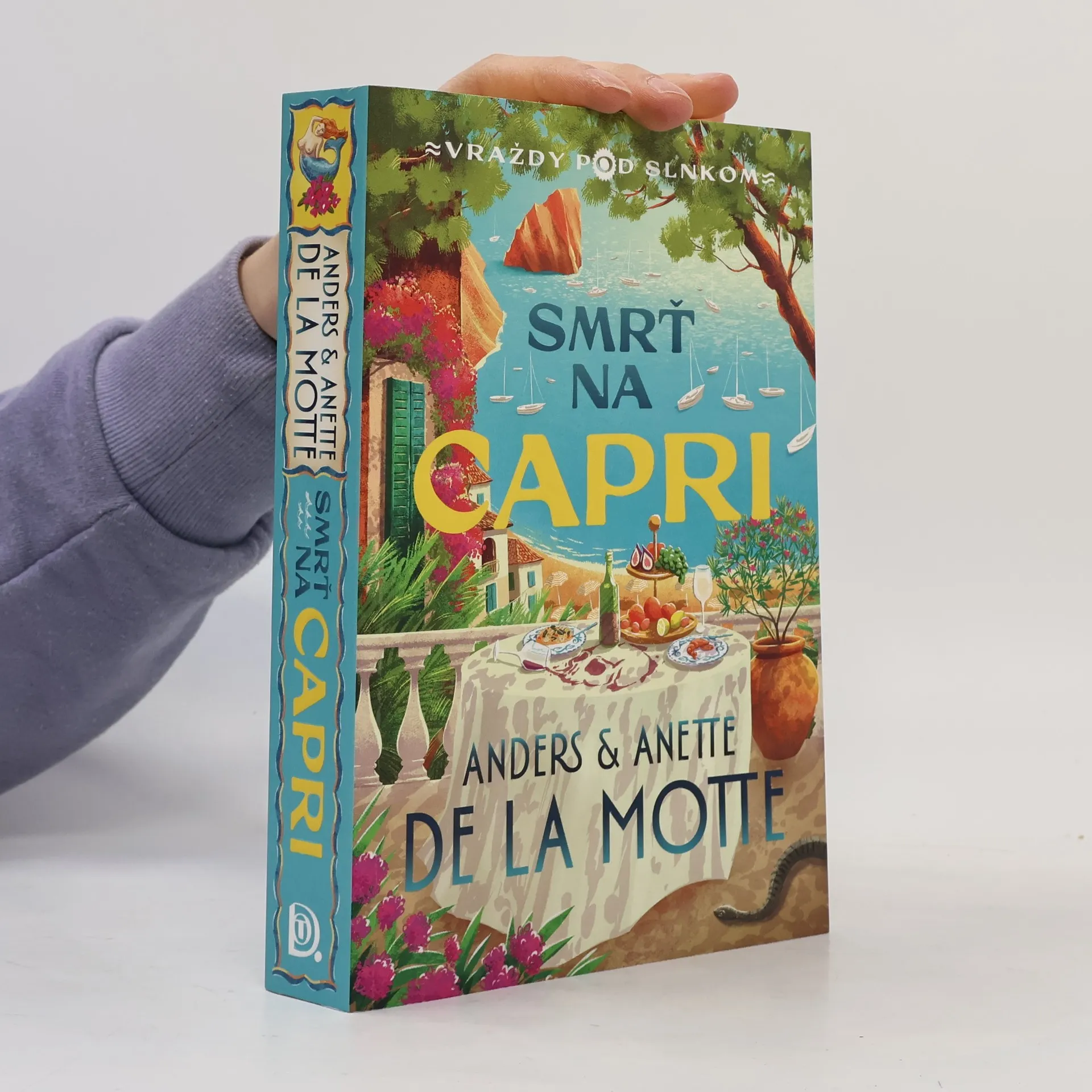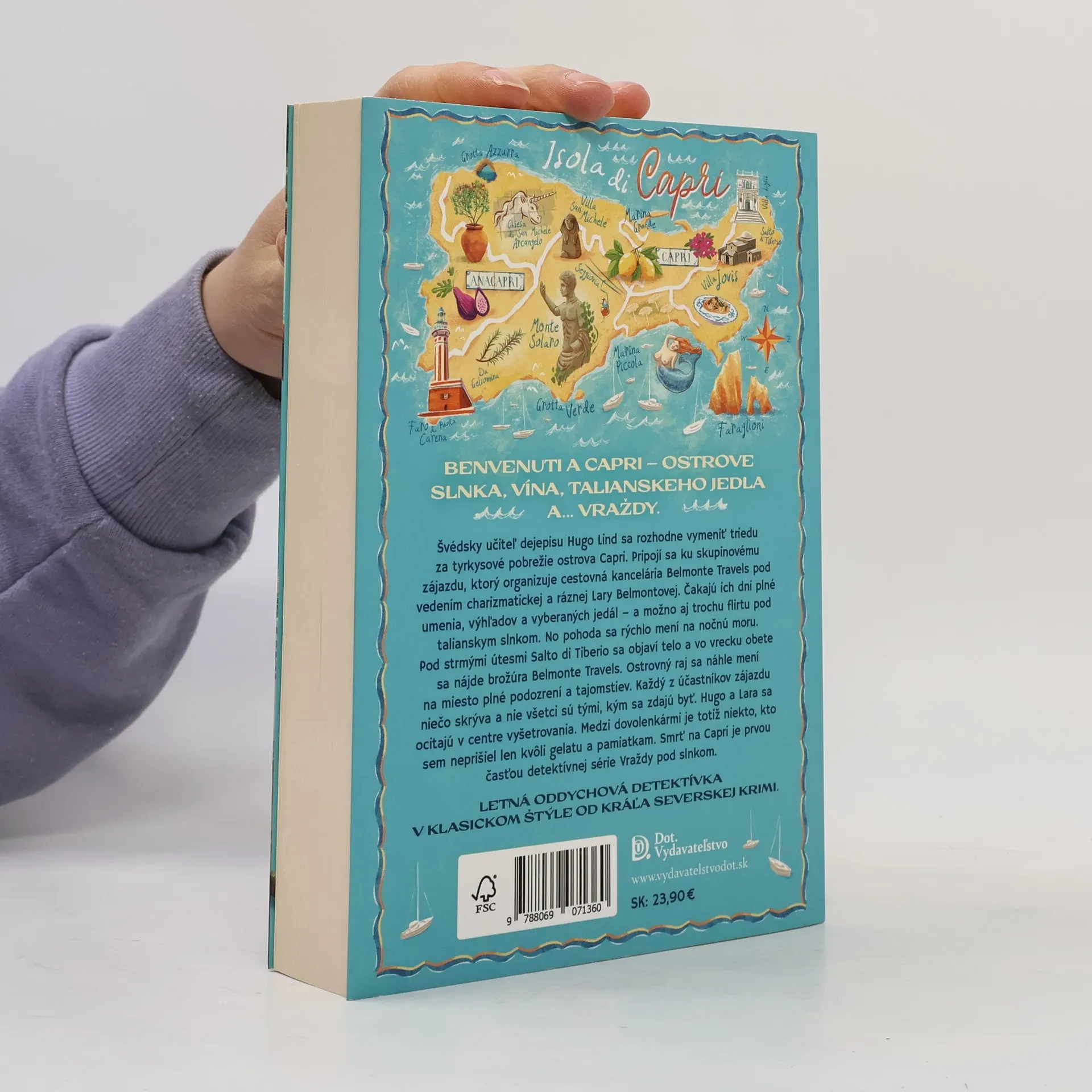 Švédsky učiteľ dejepisu Hugo Lind sa rozhodne vymeniť triedu za tyrkysové pobrežie ostrova Capri. Pripojí sa ku skupinovému zájazdu, ktorý organizuje cestovná kancelária Belmonte Travels pod vedením charizmatickej a ráznej Lary Belmontovej. Čakajú ich dni plné umenia, výhľadov a vyberaných jedál – a možno aj trochu flirtu pod talianskym slnkom.No pohoda sa rýchlo mení na nočnú moru. Pod strmými útesmi Salto di Tiberio sa objaví telo a vo vrecku obete sa nájde brožúra Belmonte Travels. Ostrovný raj sa náhle mení na miesto plné podozrení a tajomstiev. Každý z účastníkov zájazdu niečo skrýva a nie všetci sú tými, kým sa zdajú byť.Hugo a Lara sa ocitajú v centre vyšetrovania. Medzi dovolenkármi je totiž niekto, kto sem neprišiel len kvôli gelatu a pamiatkam.Smrť na Capri je prvou časťou detektívnej série Vraždy pod slnkom.