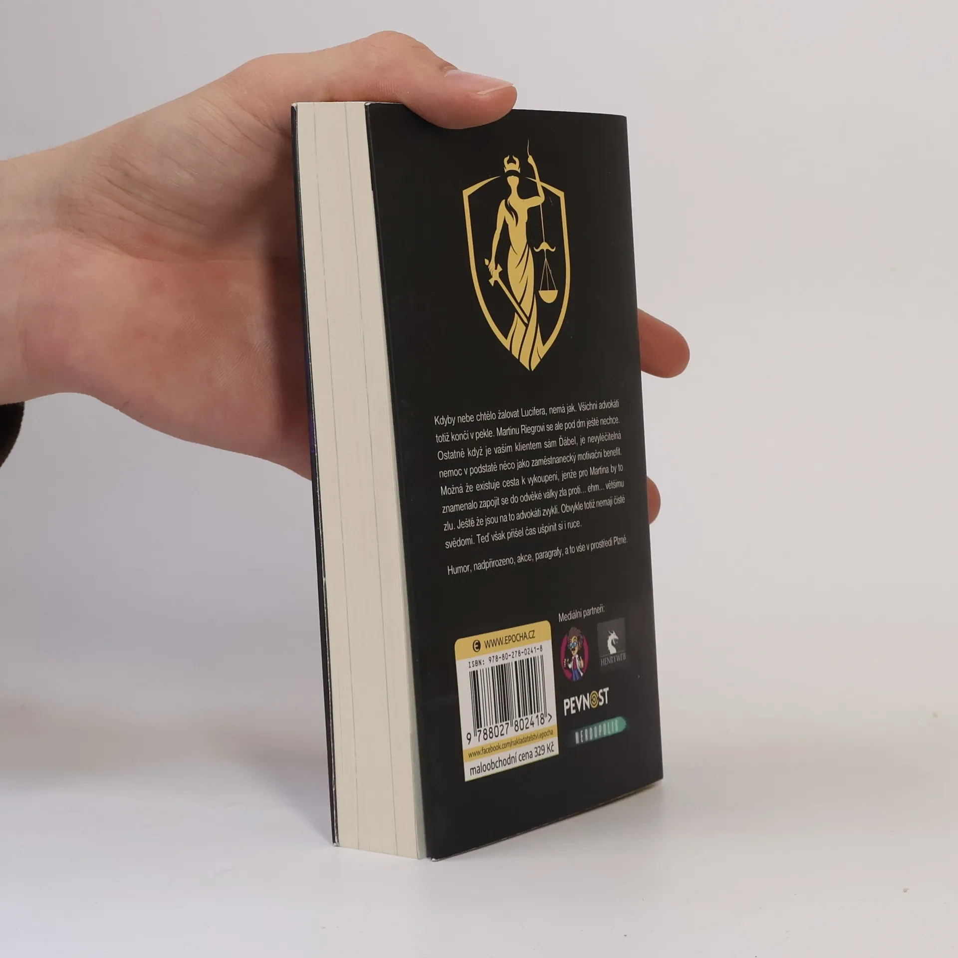 Kdyby nebe chtělo žalovat Lucifera, nemá jak. Všichni advokáti totiž končí v pekle. Martinu Riegrovi se ale pod drn ještě nechce. Ostatně když je vaším klientem sám Ďábel, je nevyléčitelná nemoc v podstatě něco jako zaměstnanecký motivační benefit. Možná že existuje cesta k vykoupení, jenže pro Martina by to znamenalo zapojit se do odvěké války zla proti… ehm… většímu zlu. Ještě že jsou na to advokáti zvyklí. Obvykle totiž nemají čisté svědomí. Teď však přišel čas ušpinit si i ruce.Humor, nadpřirozeno, akce, paragrafy, a to vše v prostředí Plzně.