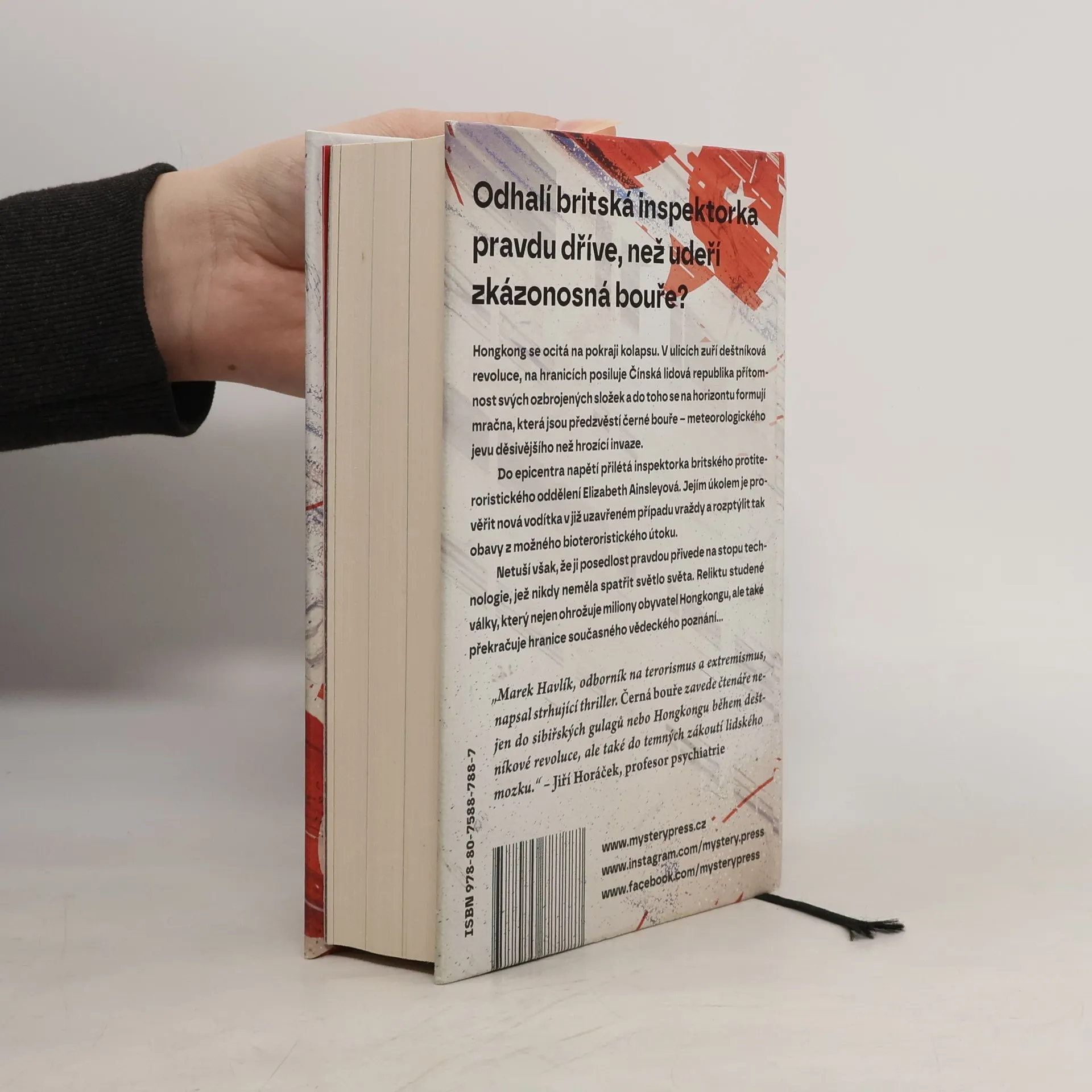ODHALÍ BRITSKÁ INSPEKTORKA PRAVDU DŘÍVE, NEŽ UDEŘÍ ZKÁZONOSNÁ BOUŘE? Hongkong se ocitá na pokraji kolapsu. V ulicích zuří deštníková revoluce, na hranicích posiluje Čínská lidová republika přítomnost svých ozbrojených složek a do toho se na horizontu formují mračna, která jsou předzvěstí černé bouře – meteorologického jevu děsivějšího než hrozící invaze. Do epicentra napětí přilétá inspektorka britského protiteroristického oddělení Elizabeth Ainsleyová. Jejím úkolem je prověřit nová vodítka v již uzavřeném případu vraždy a rozptýlit tak obavy z možného bioteroristického útoku. Netuší však, že ji posedlost pravdou přivede na stopu technologie, jež nikdy neměla spatřit světlo světa. Reliktu studené války, který nejen ohrožuje miliony obyvatel Hongkongu, ale také překračuje hranice současného vědeckého poznání… __ „Marek Havlík, odborník na terorismus a extremismus, napsal strhující thriller. Černá bouře zavede čtenáře nejen do sibiřských gulagů nebo Hongkongu během deštníkové revoluce, ale také do temných zákoutí lidského mozku.“ – Jiří Horáček, profesor psychiatrie