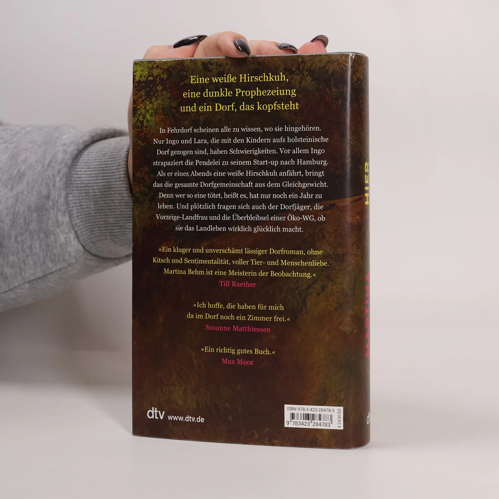 Eine weiße Hirschkuh, eine dunkle Prophezeiung und ein Dorf, das kopfstehtIn Fehrdorf scheinen alle zu wissen, wo sie hingehören. Nur Ingo und Lara, die mit den Kindern von der Großstadt aufs holsteinische Dorf gezogen sind, haben Schwierigkeiten. Vor allem Ingo strapaziert die Pendelei zu seinem Start-Up nach Hamburg. Als er eines Abends eine weiße Hirschkuh anfährt, bringt das die gesamte Dorfgemeinschaft aus dem Gleichgewicht. Denn wer so eine tötet, heißt es, hat nur noch ein Jahr zu leben. Und plötzlich fragen sich auch der Dorfjäger, die Vorzeige-Landfrau und die Überbleibsel einer Öko-WG, ob sie das Landleben wirklich glücklich macht.