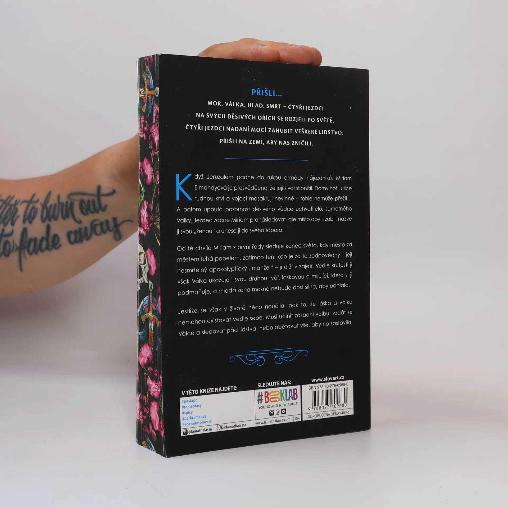 Přišli na zemi - Mor, Válka, Hlad a Smrt - čtyři Jezdci apokalypsy, kteří se na svých hrůzostrašných ořích rozjeli po světě nadáni mocí zahubit veškeré lidstvo. Když Jeruzalém padne do rukou armády nájezdníků, Miriam Elmahdyová je přesvědčená, že její život skončil. Domy hoří, ulice rudnou krví a vojáci masakrují nevinné - tohle nemůže přežít… A potom upoutá pozornost děsivého vůdce uchvatitelů, samotného Války. Jezdec se vydá Miriam pronásledovat, ale místo aby ji zabil, nazve ji svou „manželkou" a unese ji do svého tábora. Od té chvíle mladá žena z první řady sleduje konec světa, kdy město za městem lehá popelem, zatímco ten, kdo je za to zodpovědný - její nesmrtelný apokalyptický „manžel" - ji drží v zajetí. Vedle krutosti jí však Válka ukazuje i svou druhou tvář, laskavou a milující, která si ji podmaňuje, a Miriam možná nebude dost silná, aby odolala. Jestliže se však v životě něco naučila, pak to, že láska a válka nemohou existovat vedle sebe. Musí učinit zásadní volbu: vzdát se Válce a sledovat pád lidstva, nebo obětovat vše, aby ho zastavila.