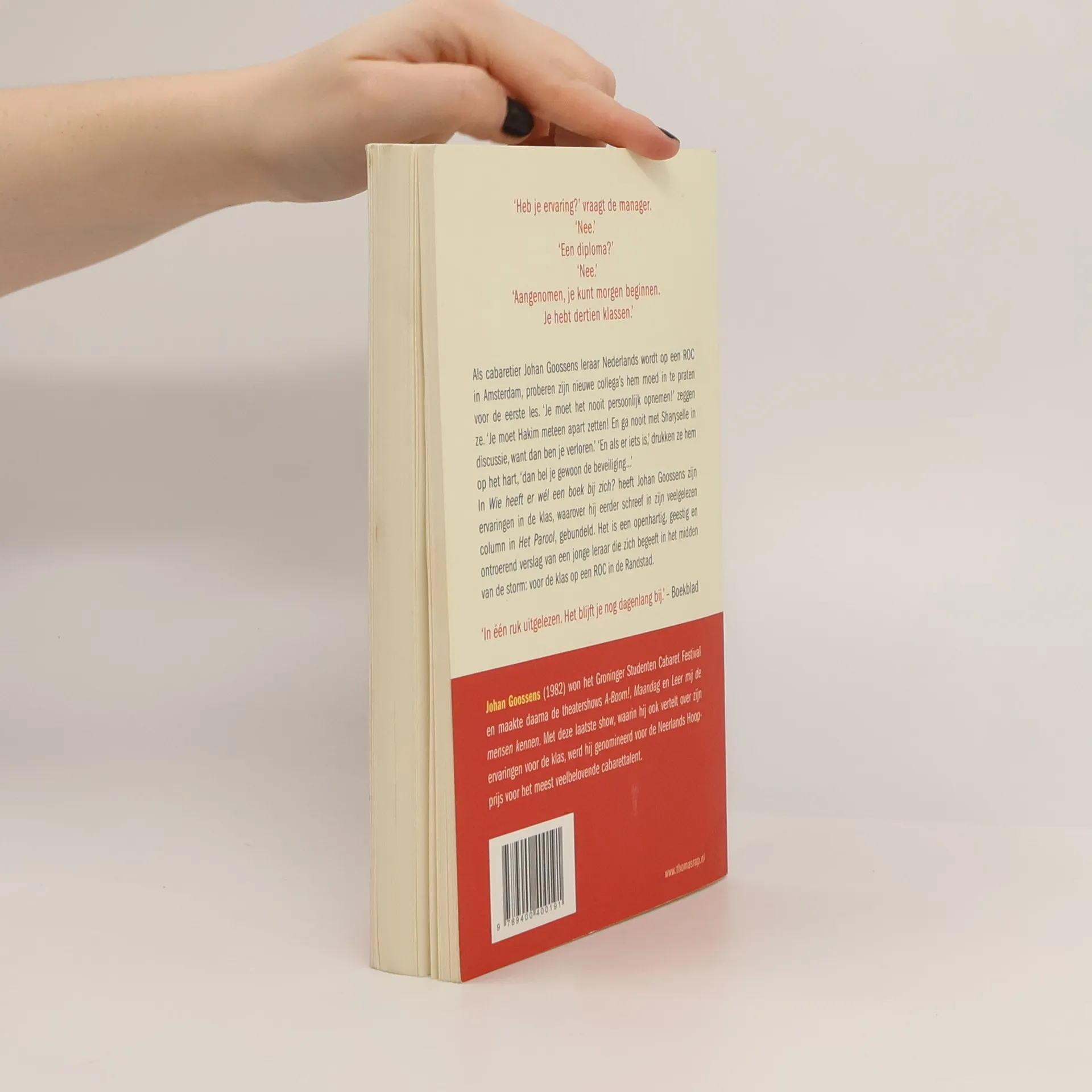 ‘Heb je ervaring?’ vraagt de manager. ‘Nee.’ ‘Een diploma?’ ‘Nee.’ ‘Aangenomen, je kunt morgen beginnen. Je hebt dertien klassen.’ Als cabaretier Johan Goossens leraar Nederlands wordt op een ROC in Amsterdam, proberen zijn nieuwe collega’s hem moed in te praten voor de eerste les: ‘Je moet het nooit persoonlijk opnemen!’ zeggen ze. ‘Je moet Hakim meteen apart zetten! En ga nooit met Sharyselle in discussie, want dan ben je verloren.’ ‘En als er iets is,’ drukken ze hem op het hart, ‘dan bel je gewoon de beveiliging...’ In Wie heeft er wél een boek bij zich? heeft Johan Goossens zijn ervaringen in de klas, waarover hij eerder schreef in zijn veelgelezen column in Het Parool, gebundeld. Het is een openhartig, geestig en ontroerend verslag van een jonge leraar die zich begeeft in het oog van de storm: voor de klas op een ROC in de Randstad.