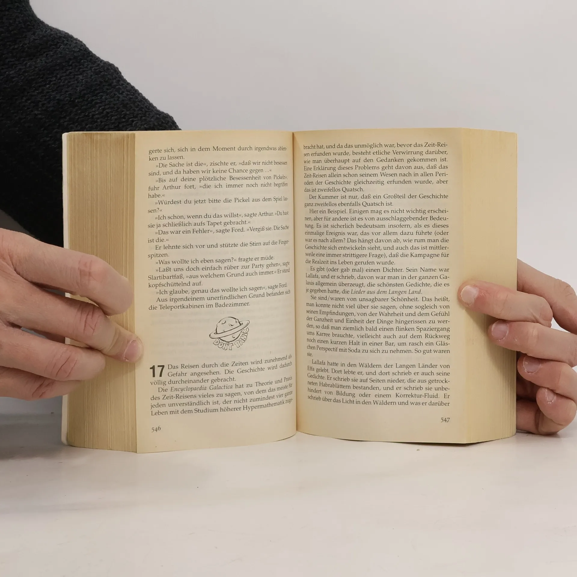 Vor 30 Jahren wurde von einem der größten Verlage Ursa Minors (und der Erde) das bemerkenswerteste Buch, das je veröffentlicht wurde, der Menschheit zugänglich gemacht: Per Anhalter durch die Galaxis. Für Arthur Dent ist es ein ganz normaler Donnerstag, bis sein Haus von Planierraupen niedergewalzt wird. Kurz darauf wird allerdings auch die gesamte Erde von einem vogonischen Bautrupp plattgemacht, weil sie einer Hyperraum-Umgehungsstraße weichen muss. Aber da hat sich Arthurs bester Freund schon längst als Alien entpuppt, und sie sausen durchs Weltall mit nichts als ihren Badetüchern und einem harmlos wirkenden Buch, auf dem in großen, freundlichen Buchstaben »KEINE PANIK« steht. Und dabei hat das Wochenende gerade erst angefangen…