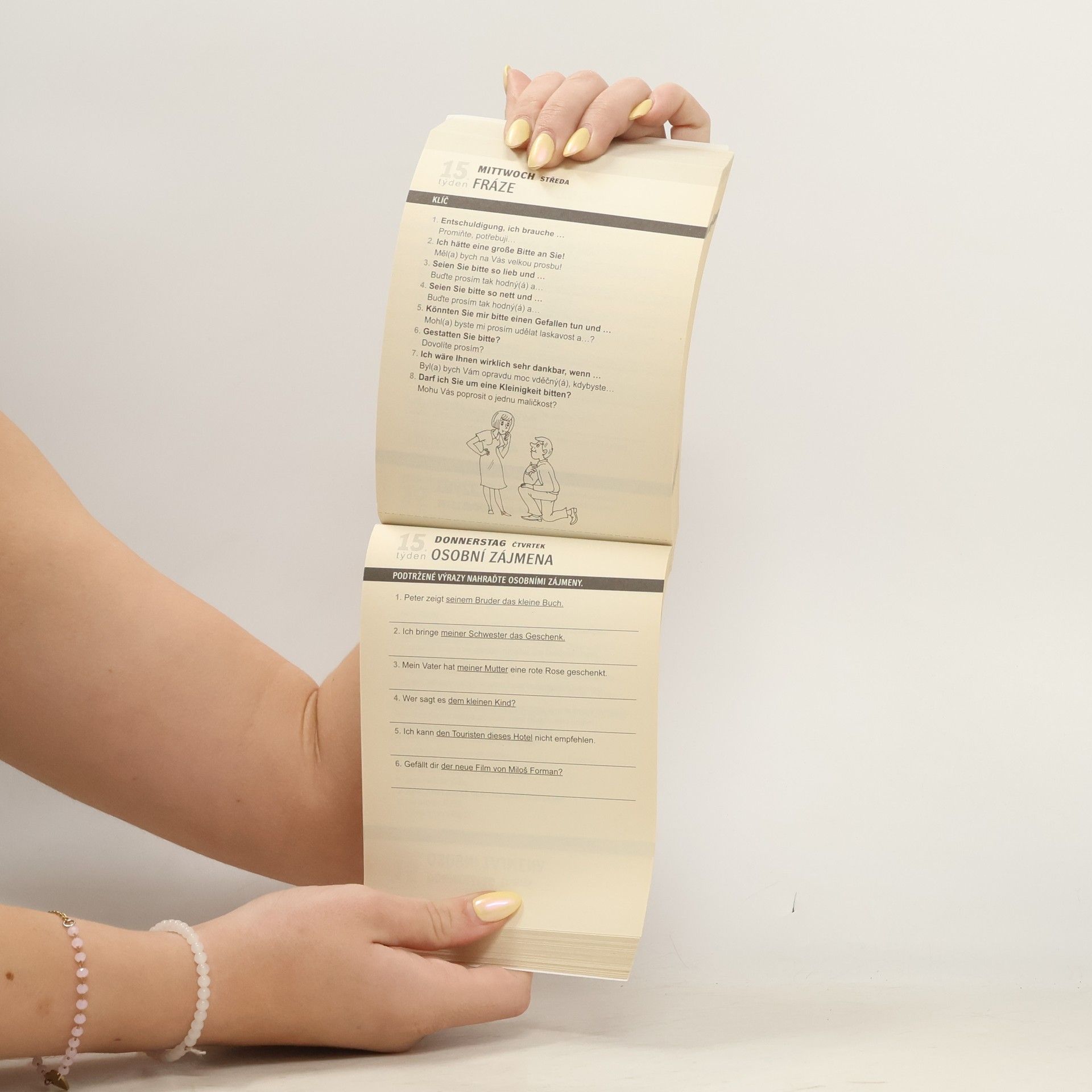 Každý den vytrhněte jeden list a ve volné chvíli vyluštěte křížovku, vyplňte cvičení nebo si přečtěte zajímavý text. Poté list otočte a zkontrolujte si své odpovědi nebo si ověřte, zda jste správně porozuměli. Mírně pokročilí a falešní začátečníci si tak upevní dosavadní znalosti a navíc si rozšíří slovní zásobu o praktická slovíčka. Vaše němčina se tak bude den po dni zlepšovat.