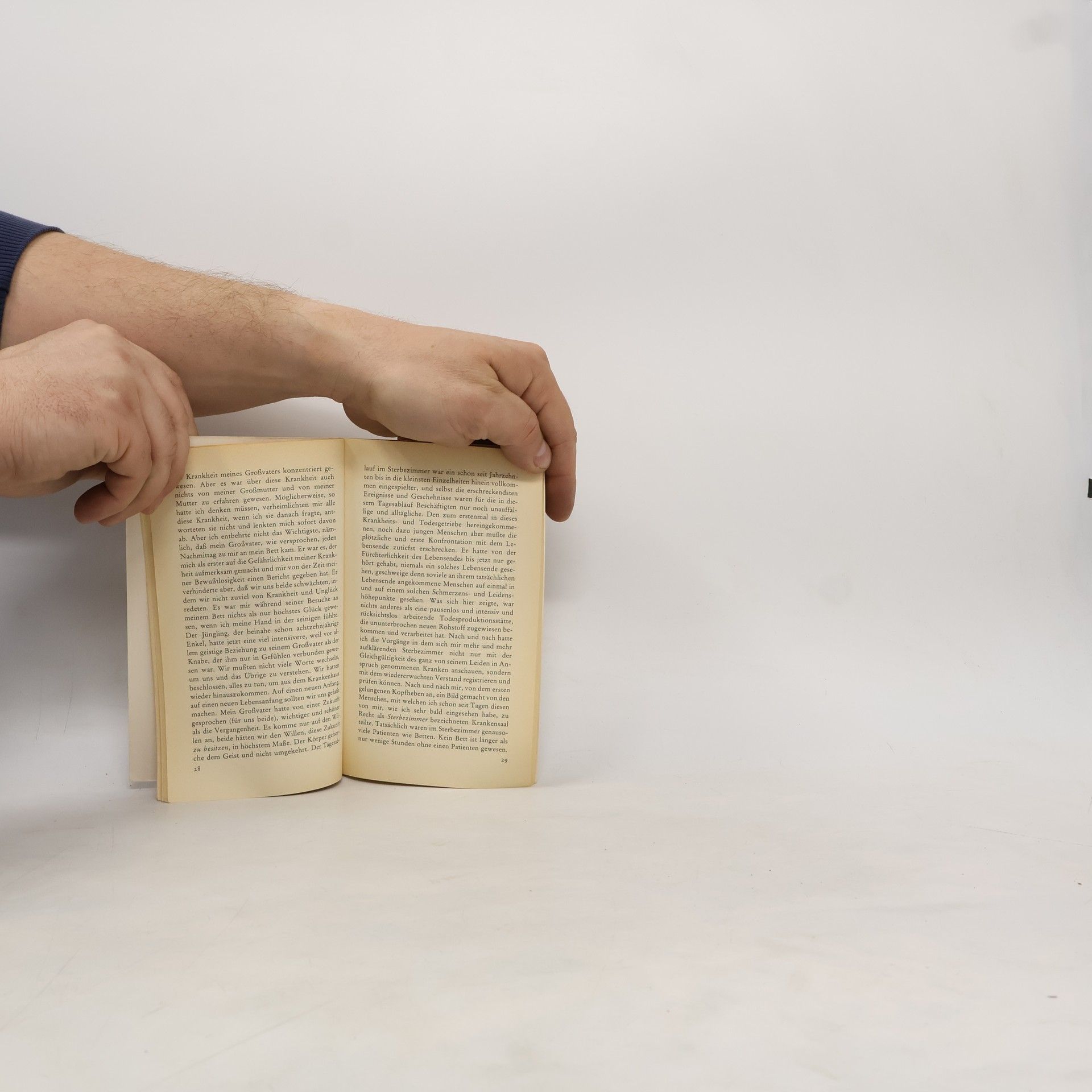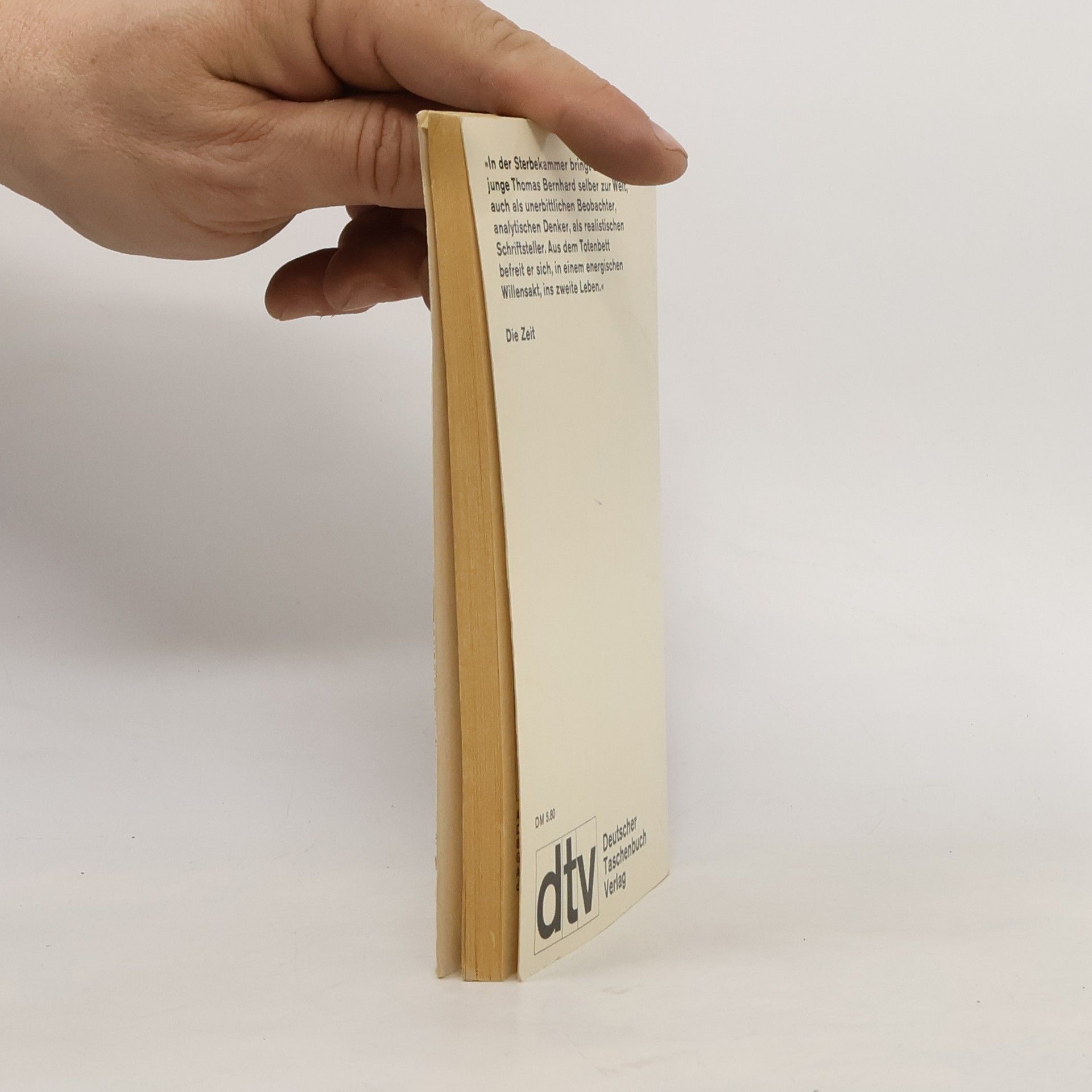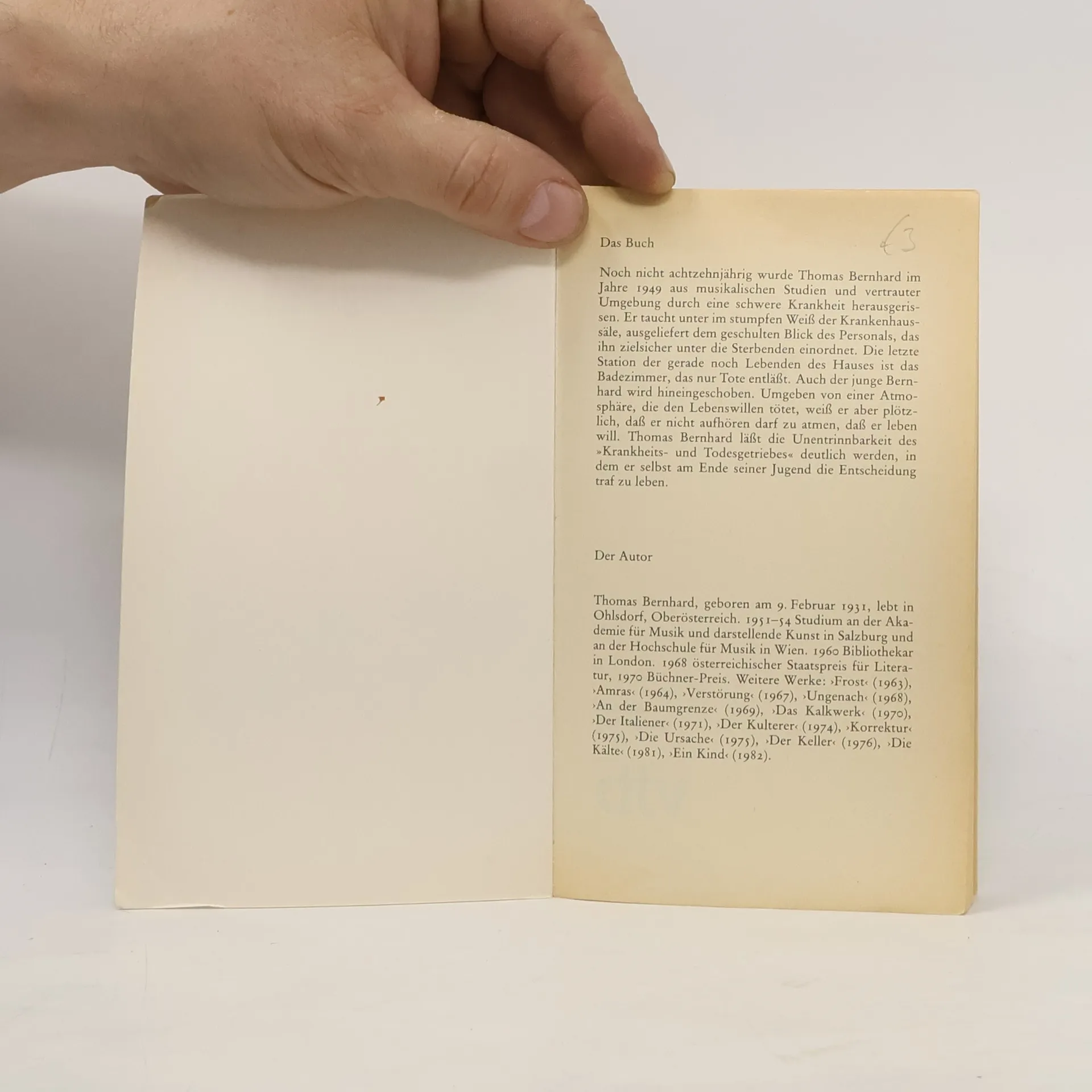 Nicht einmal achtzehnjährig wurde Thomas Bernhard im Jahre 1949 aus seinem musikalischen Studien durch eine schwere Krankheit herausgerissen. Er versinkt im stumpfen Weiß der Krankenhaussäle, dem geschulten Blick des Personals ausgeliefert, das ihn zielsicher unter die Sterbenden einordnet. Die letzte Station des gerade noch Lebenden ist das Badezimmer, aus dem nur die Toten wieder herauskommen. Umgeben von dieser Atmosphäre, die den Lebenswillen tötet, weiß er aber plötzlich, daß er nicht aufhören darf zu atmen, daß er leben will.