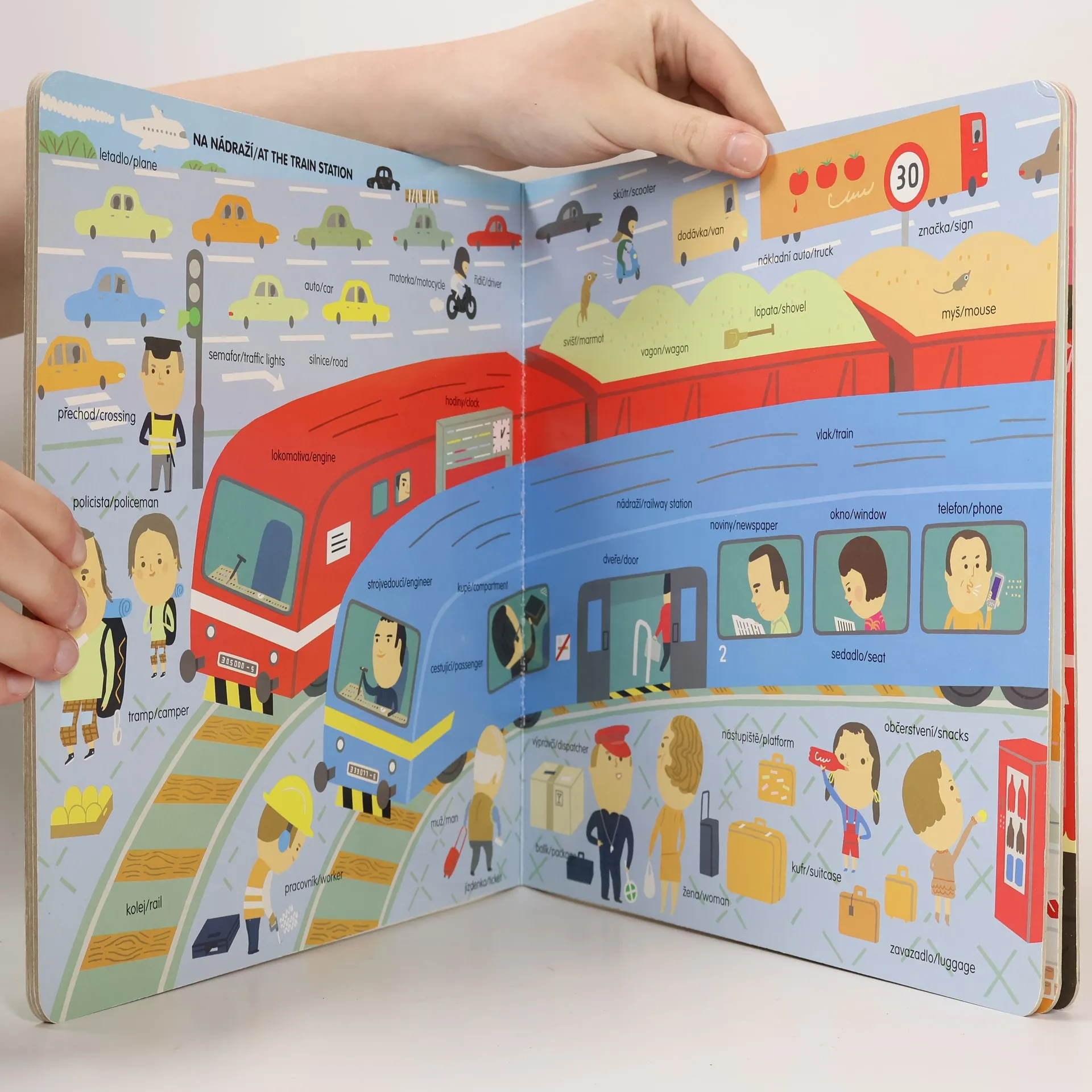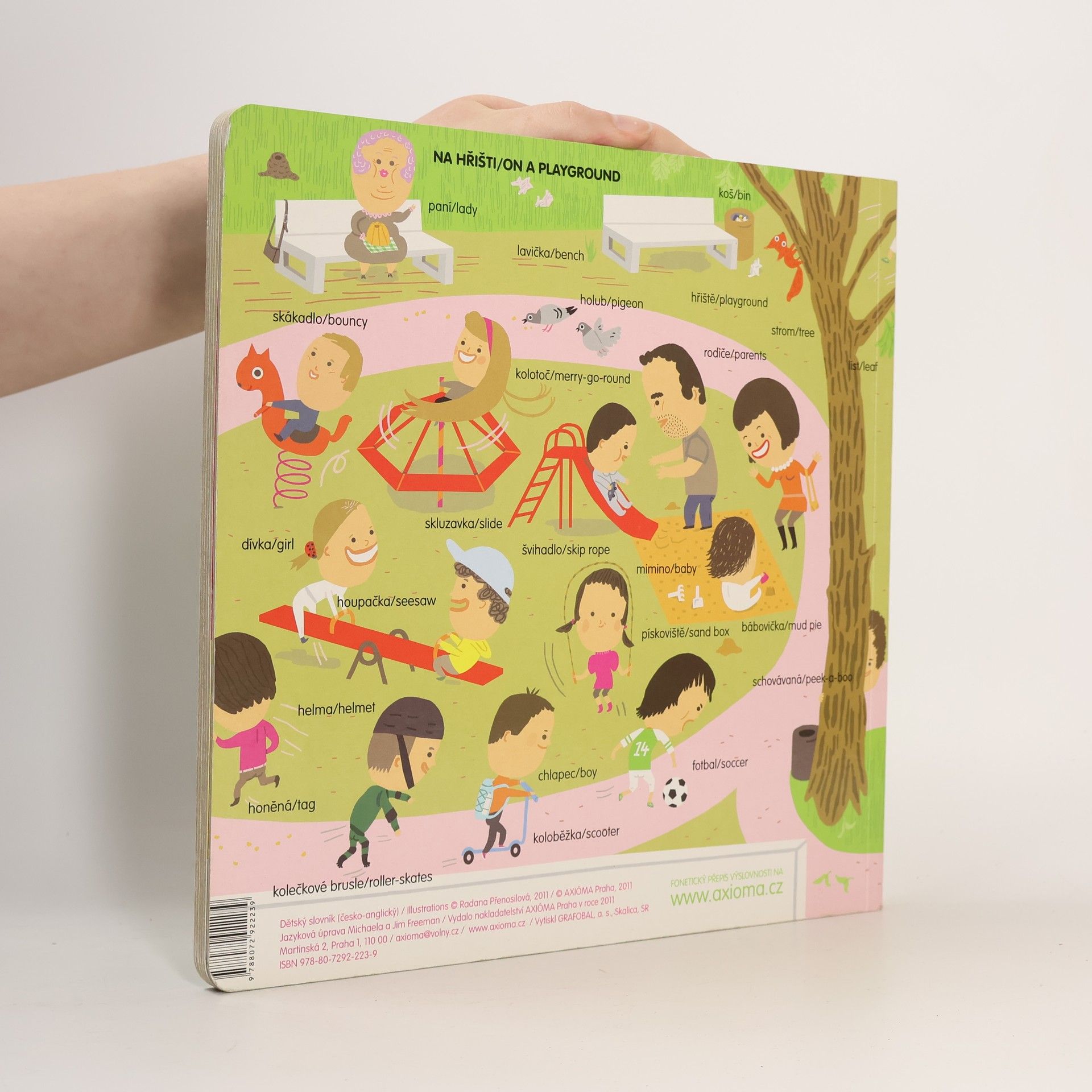 Dětský slovník česko-anglický. Obrázkový slovník seznamuje nejmenší děti s pojmenováním věcí, které se kolem nich vyskytují v různých prostředích: na hřišti, na oslavě narozenin, na návštěvě, u lékaře, na nádraží, v restauraci, v divadle, v obchodě. Každé slovo je opatřeno českým a anglickým názvem. Na našich webových stránkách je také možné si stáhnout foneticky přepis všech slov.