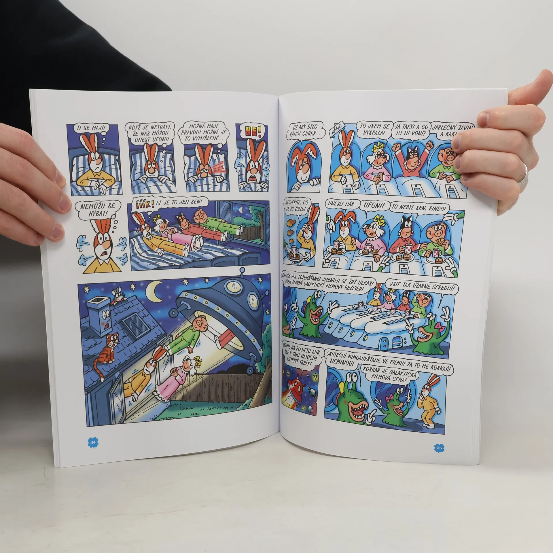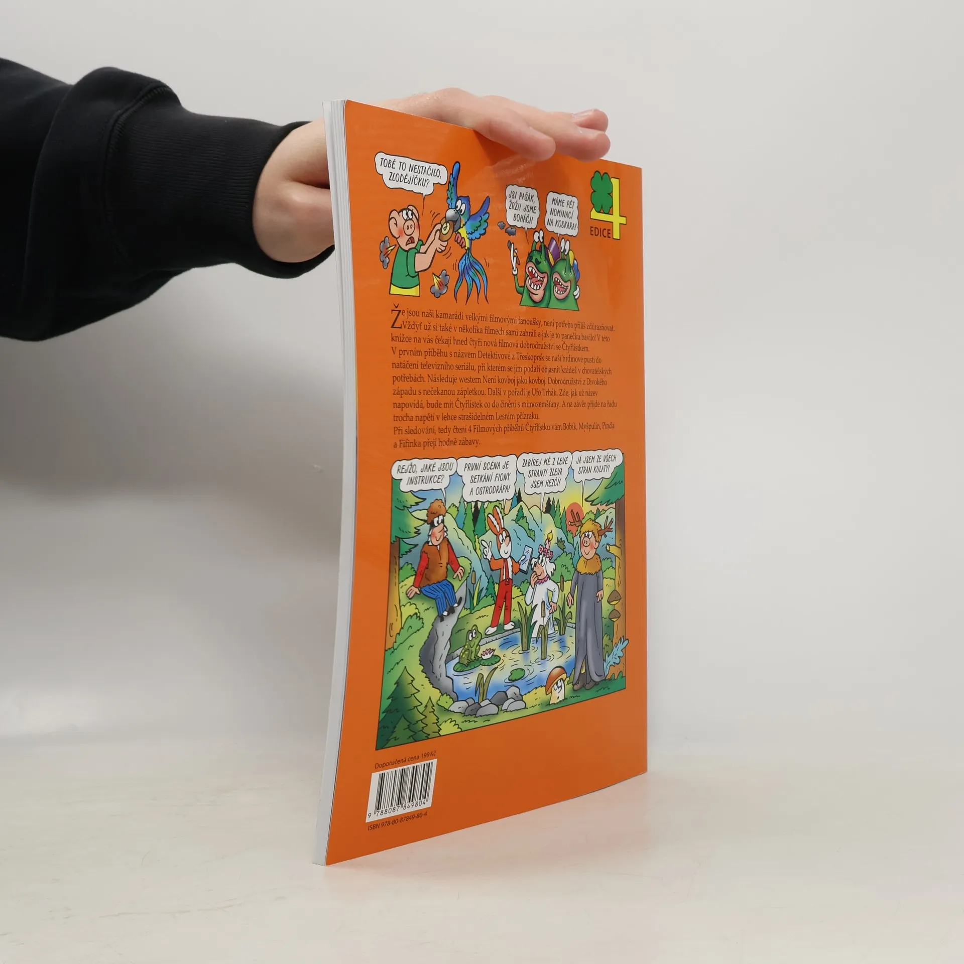 Nová komiksová kniha z oblíbené edice čtyř příběhů přináší další dobrodružství veselé party ze Čtyřlístku. Fifinka, Bobík, Pinďa a Myšpulín v ní zažijí příběhy tentokrát na filmové téma. V prvním příběhu s názvem Detektivové z Třeskoprsk se naši hrdinové pustí do natáčení vlastního detektivního seriálu, při kterém se jim podaří objasnit krádež v chovatelských potřebách. Následuje dobrodružství Není kovboj jako kovboj, v němž se Čtyřlístek po vítězství ve filmové soutěži podívá do pravého westernového městečka. Napětí a trochu strachu přinese Lesní přízrak. Zde se role režiséra ujme Pinďa, který se s ostatními kamarády rozhodne natočit horor. Poslední z příběhů je Ufo Trhák. A jak už název napovídá, bude zde mít Čtyřlístek co do činění s mimozemšťany.