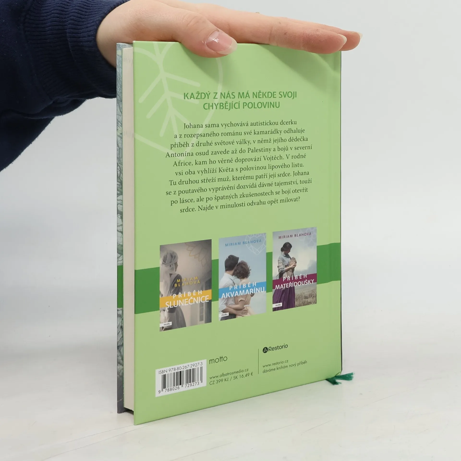Každý z nás má někde svoji chybějící polovinu. Miriam Blahová opět kombinuje emotivní příběh ze současnosti s poutavou historickou linkou. Grafička Johana sama vychovává autistickou dceru a po zklamání nemá na nový vztah náladu ani čas. Její pozornost se marně snaží upoutat Aleš, který má se synem stejnou zkušenost. Johana však nedokáže čelit realitě a raději uniká k rozepsaného románu své kamarádky Mariky, v němž jejího dědečka Antonína osud během druhé světové války zavede až do Palestiny a bojů v severní Africe, kam ho věrně doprovází přítel Vojtěch. V rodné vsi oba vyhlíží Květa s polovinou lipového listu. Tu druhou střeží muž, kterému patří její srdce. Johana se z vyprávění dozvídá dávné tajemství, touží po lásce, ale bojí se otevřít srdce. Najde v minulosti odvahu opět milovat a završí tak příběh s vůní lípy?