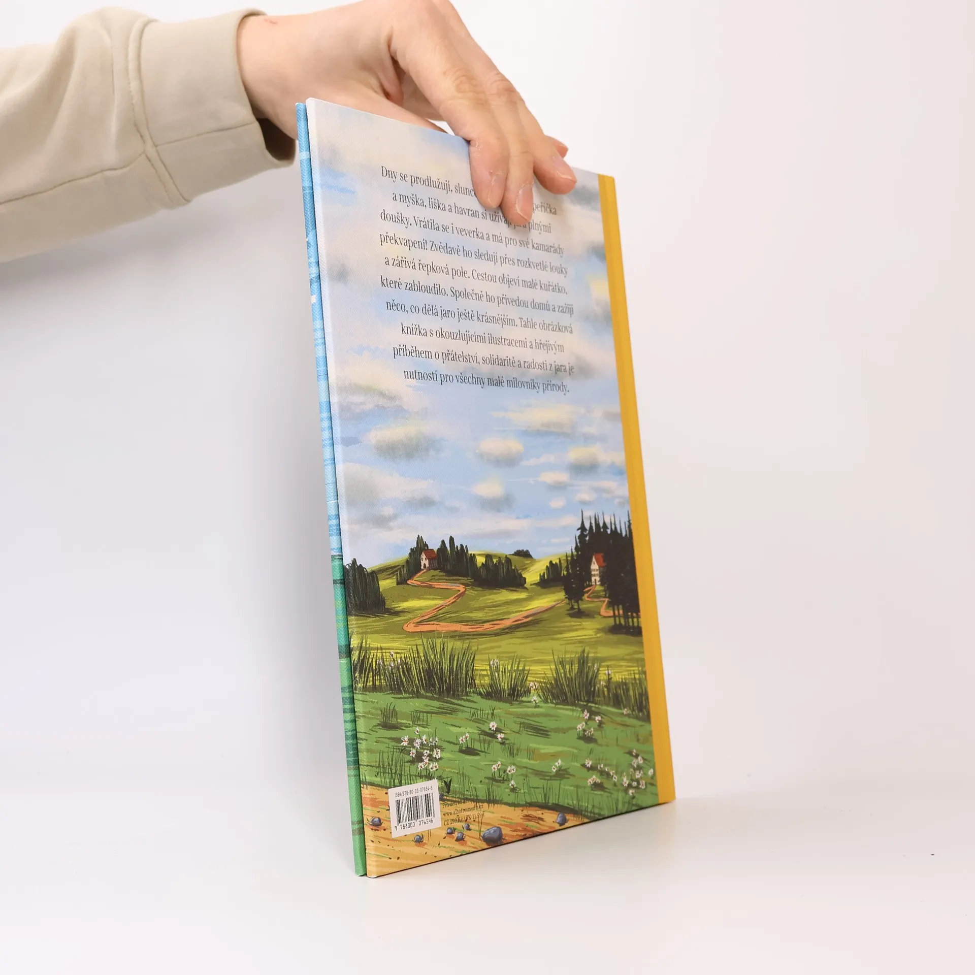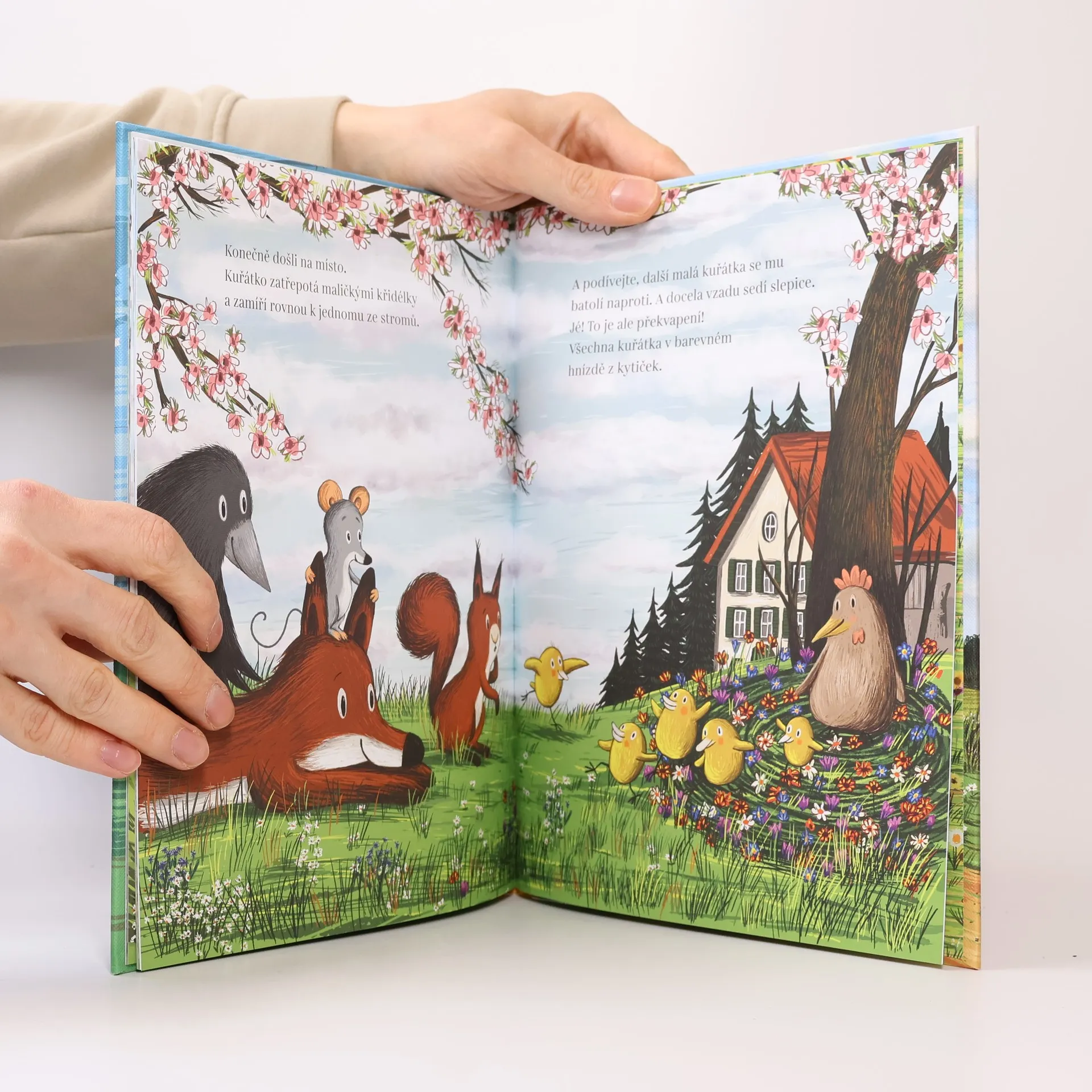Dny se prodlužují, slunce hřeje kožíšky a peříčka a myška, liška a havran si užívají jara plnými doušky. Vrátila se i veverka a má pro své kamarády překvapení! Zvědavě ho sledují přes rozkvetlé louky a zářivá řepková pole. Cestou objeví malé kuřátko, které zabloudilo. Společně ho přivedou domů a zažijí něco, co dělá jaro ještě krásnějším. Tahle obrázková knížka s okouzlujícími ilustracemi a hřejivým příběhem o přátelství, solidaritě a radosti z jara je nutností pro všechny malé milovníky přírody.