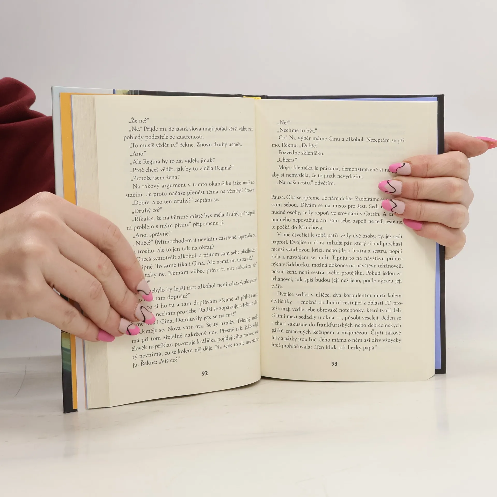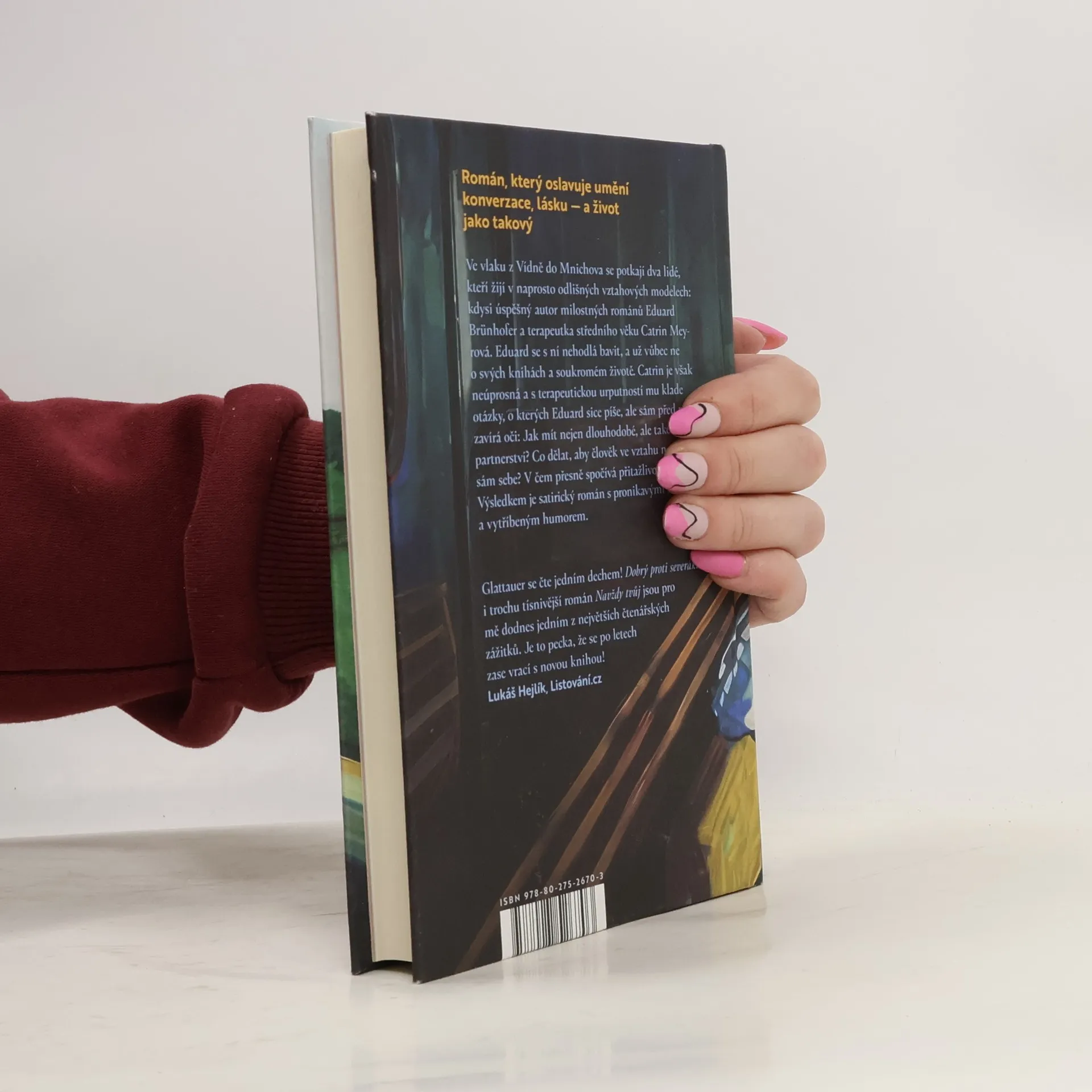 Román, který oslavuje umění konverzace, lásku — a život jako takový Ve vlaku z Vídně do Mnichova se náhodou potkají dva lidé, kteří žijí v naprosto odlišných vztahových modelech: kdysi úspěšný autor milostných románů Eduard Brünhofer a terapeutka středního věku Catrin Meyrová. Eduard se s ní nehodlá bavit, a už vůbec ne o svých knihách a milostném životě. Catrin je však neúprosná a s terapeutickou urputností mu klade otázky, o kterých Eduard sice píše, ale sám před nimi zavírá oči: Jak spolu zůstat nejen dlouho, ale také šťastní? Co dělat, aby člověk ve vztahu neztratil sám sebe? V čem přesně spočívá přitažlivost nevěry? Výsledkem je satirický román s pronikavými pointami a vytříbeným humorem.