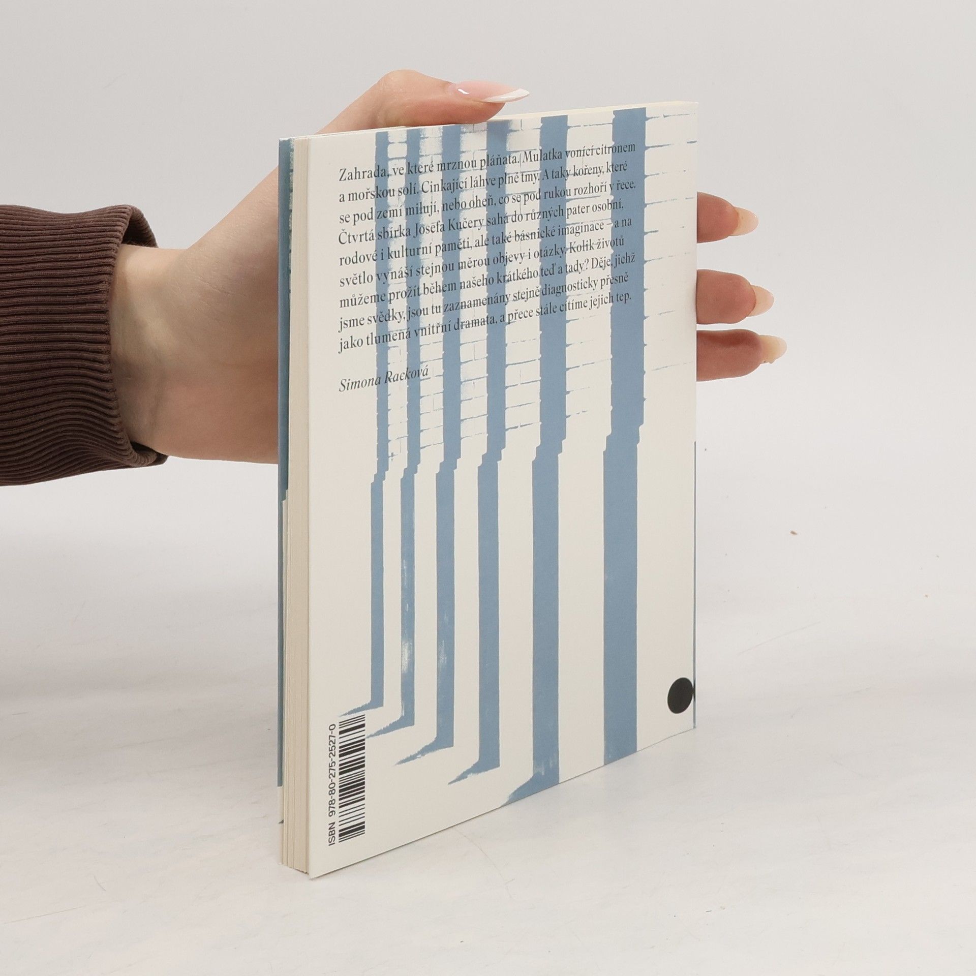 Zahrada, ve které mrznou pláňata. Mulatka vonící citronem a mořskou solí. Cinkající láhve plné tmy. A taky kořeny, které se pod zemí milují, nebo oheň, co se pod rukou rozhoří v řece. Čtvrtá sbírka Josefa Kučery sahá do různých pater osobní, rodové i kulturní paměti, ale také básnické imaginace – a na světlo vynáší stejnou měrou objevy i otázky. Kolik životů můžeme prožít během našeho krátkého teď a tady? Děje, jichž jsme svědky, jsou tu zaznamenány stejně diagnosticky přesně jako tlumená vnitřní dramata, a přece stále cítíme jejich tep.
