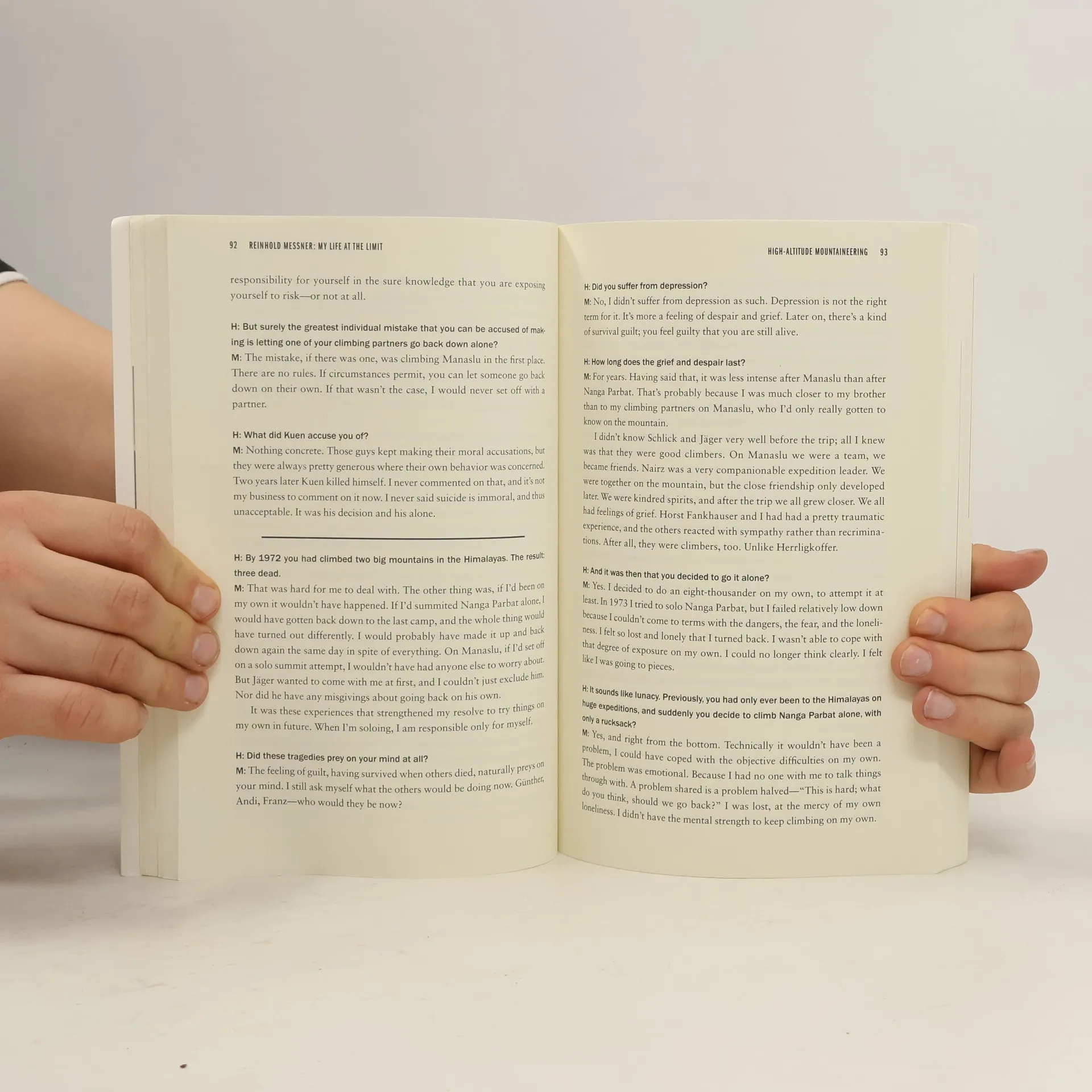 Reinhold Messner: My Life at the Limit, the newest book by the famed mountaineer, is a conversation between Messner and interviewer Thomas Huetlin, an award-winning German journalist. It reveals a more thoughtful and conversational Messner than one finds in his previous books, with the talk between Messner and Huetlin covering not only the highlights of Messner's climbing career, but also his treks across Tibet, the Gobi, and Antarctica; his five-year-stint as a member of the European Parliament; his encounter with and study of the yeti; his thoughts on traditional male/female roles; and much more. Readers learn about Messner's childhood, his thoughts about eating ice cream with girls (against), politics (mostly liberal), and his technique for killing chickens (sharp scissors). Messner is known as one of history's greatest Himalayan mountaineers, a man who pushed back the frontiers of the possible for a whole generation of climbers