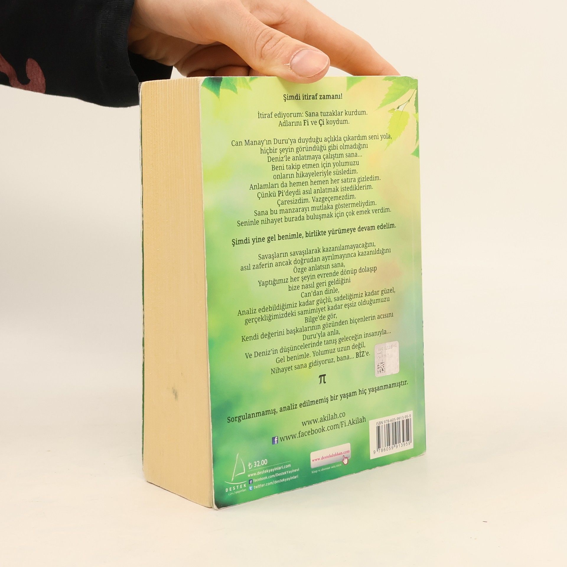 Şimdi itiraf zamanı! İtiraf ediyorum: Sana tuzaklar kurdum. Adlarını Fi ve Çi koydum. Can Manay'ın Duru'ya duyduğu açlıkla çıkardım seni yola, Hiçbir şeyin göründüğü gibi olmadığını Deniz'le anlatmaya çalıştım sana… Beni takip etmen için yolumuzu onların hikâyeleriyle süsledim. Anlamları da hemen hemen her satıra gizledim. Çünkü Pi'deydi asıl anlatmak istediklerim. Çaresizdim. Vazgeçemezdim. Sana bu manzarayı mutlaka göstermeliydim. Seninle nihayet burada buluşmak için çok emek verdim. Şimdi yine gel benimle, birlikte yürümeye devam edelim. Savaşların savaşılarak kazanılamayacağını, asıl zaferin ancak doğrudan ayrılmayınca kazanıldığını Özge anlatsın sana, Yaptığımız her şeyin evrende dönüp dolaşıp bize nasıl geri geldiğini Can'dan dinle, Analiz edebildiğimiz kadar güçlü, sadeliğimiz kadar güzel, gerçekliğimizdeki samimiyet kadar eşsiz olduğumuzu Bilge'de gör, Kendi değerini başkalarının gözünden biçenlerin acısını Duru'yla anla, Ve Deniz'in düşüncelerinde tanış geleceğin insanıyla… Gel benimle. Yolumuz uzun değil, Nihayet sana gidiyoruz, bana… BİZ'e. Sorgulanmamış, analiz edilmemiş bir yaşam hiç yaşanmamıştır.
