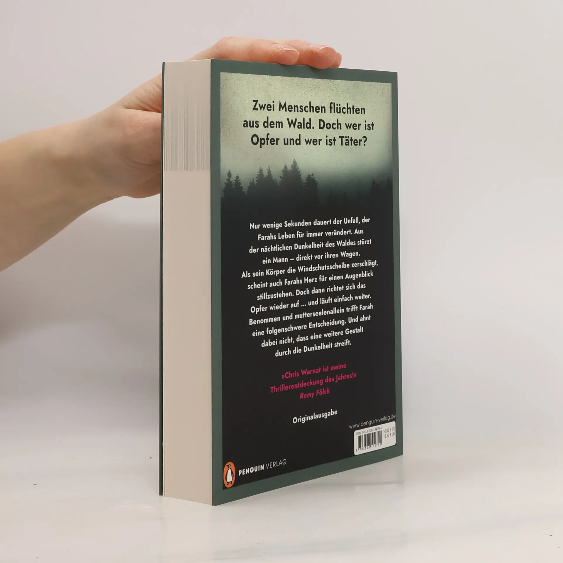 Zwei Menschen flüchten aus dem Wald. Doch wer ist Opfer und wer ist Täter? Nur wenige Sekunden dauert der Unfall, der Farahs Leben für immer verändert. Inmitten der nächtlichen Dunkelheit stürzt ein Mann aus dem Wald – und direkt vor ihren Wagen. Als sein Körper die Windschutzscheibe zerschlägt, scheint auch Farahs Herz für einen Augenblick stillzustehen. Doch dann richtet sich das Opfer wieder auf … und läuft einfach weiter. Benommen folgt Farah ihm in die Finsternis. Nicht ahnend, dass noch jemand anderes ganz in der Nähe ist …