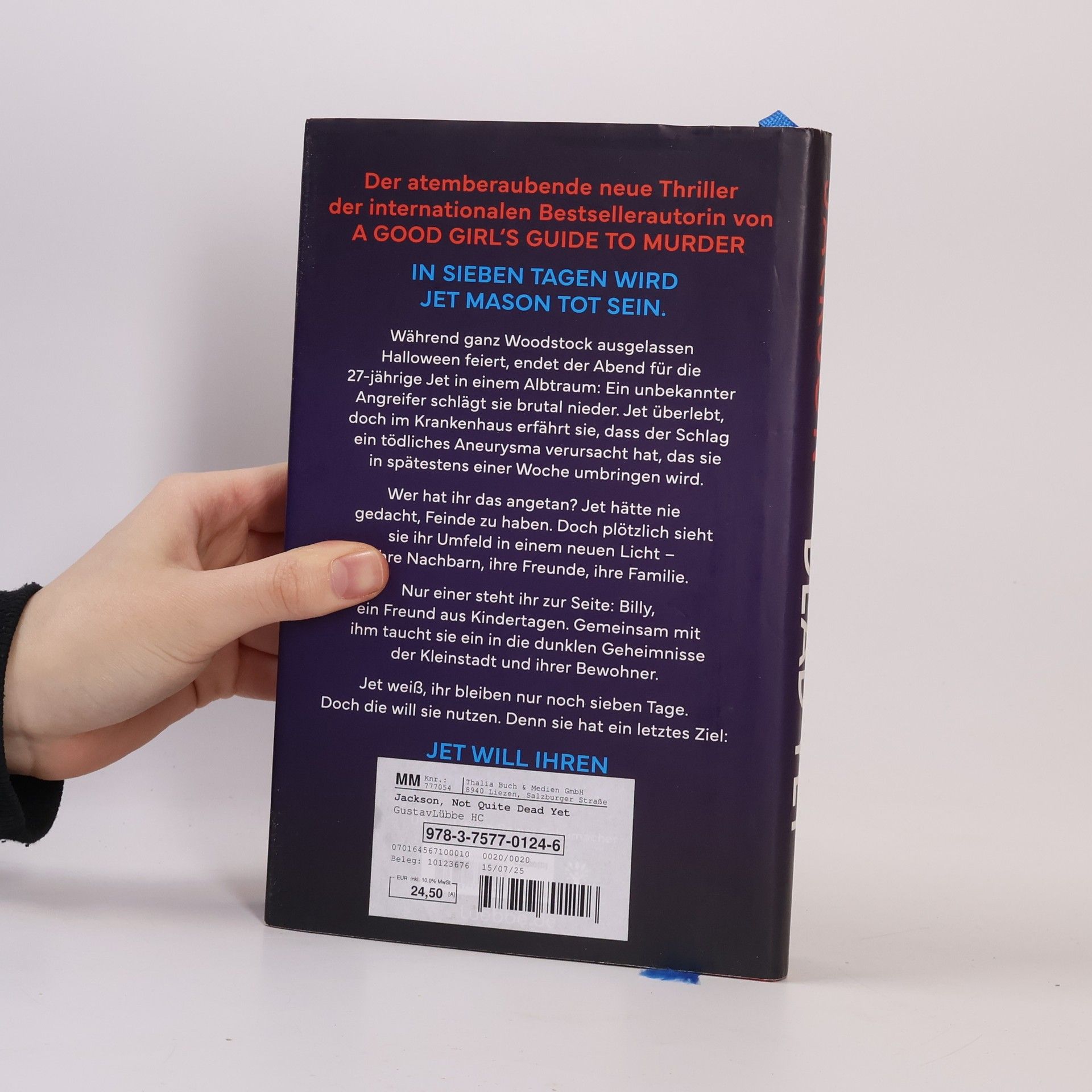 Die Nr.1-NEW YORK TIMES-Bestsellerautorin von A GOOD GIRL'S GUIDE TO MURDER - aktuell ein Serienhit bei Netflix - veröffentlicht ihren ersten Roman für Erwachsene: einen atemberaubenden Thriller über eine junge Frau, die versucht, ihren eigenen Mord aufzuklären In sieben Tagen wird Jet Mason tot sein. Jet ist die Tochter einer der reichsten Familien in Woodstock, Vermont. Mit 27 Jahren wartet sie immer noch darauf, dass ihr Leben endlich beginnt. "Das kann ich später noch machen", sagt sie immer. Denn Jet hat Zeit. Bis zu jener Halloween-Nacht, als sie von einem unsichtbaren Eindringling brutal angegriffen wird. Dabei erleidet Jet eine schwere Kopfverletzung, und die Ärzte sind sich sicher: In spätestens einer Woche wird ein tödliches Aneurysma Jet umbringen. Jet hätte nie gedacht, dass sie Feinde hat. Doch plötzlich sieht sie alle Menschen in ihrem Umfeld in einem neuen Licht: ihre Familie, ihre ehemalige beste Freundin, die jetzt ihre Schwägerin ist, ihren Ex-Freund. Sie weiß, ihr bleiben höchstens sieben Tage. Tage, in denen sich ihr Zustand verschlechtert und nur Billy, ein Freund aus Kindertagen, an ihrer Seite ist. Dennoch ist sie fest entschlossen, endlich etwas zu Ende zu bringen: Jet wird ihren eigenen Mord aufklären.