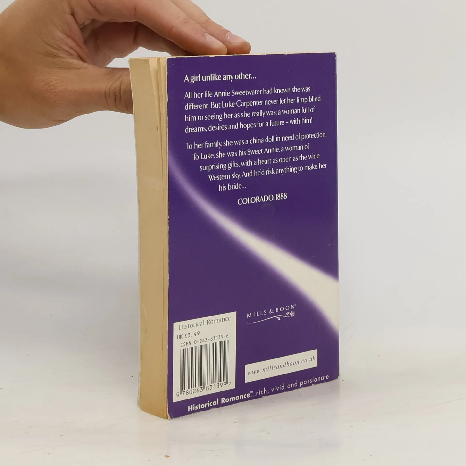 Annie Sweetwater Wasn't Like Other GirlsAll her life everyone she'd ever known had told her so. Except Luke Carpenter, who never let her limp blind him to seeing her as she really was: a woman grown, full of dreams, desires and hopes for a future—with him!Luke couldn't remember a time when he hadn't loved herTo her family, she was a Dresden doll in a wheelchair. To Luke, she was his Sweet Annie, a woman of surprising gifts, with a heart as open as the wide Western sky. And he'd risk anything to make her his bride!
