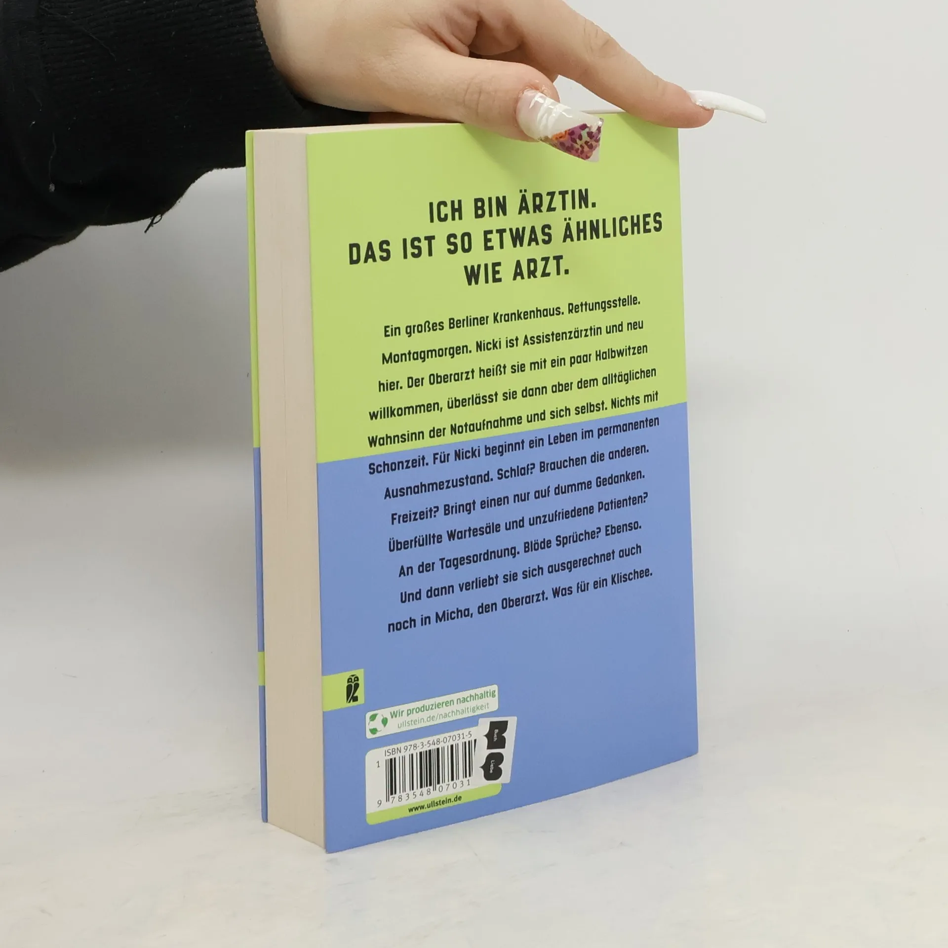 ICH BIN ÄRZTIN. DAS IST SO ETWAS ÄHNLICHES WIE ARZT. Ein großes Berliner Krankenhaus. Rettungsstelle. Montagmorgen. Nicki ist Assistenzärztin und neu hier. Der Oberarzt heißt sie mit ein paar Halbwitzen willkommen, überlässt sie dann aber dem alltäglichen Wahnsinn der Notaufnahme und sich selbst. Nichts mit Schonzeit. Für Nicki beginnt ein Leben im permanenten Ausnahmezustand. Schlaf? Brauchen die anderen. Freizeit? Bringt einen nur auf dumme Gedanken. Überfüllte Wartesäle und unzufriedene Patienten? An der Tagesordnung. Blöde Sprüche? Ebenso. Und dann verliebt sie sich ausgerechnet auch noch in Micha, den Oberarzt. Was für ein Klischee.