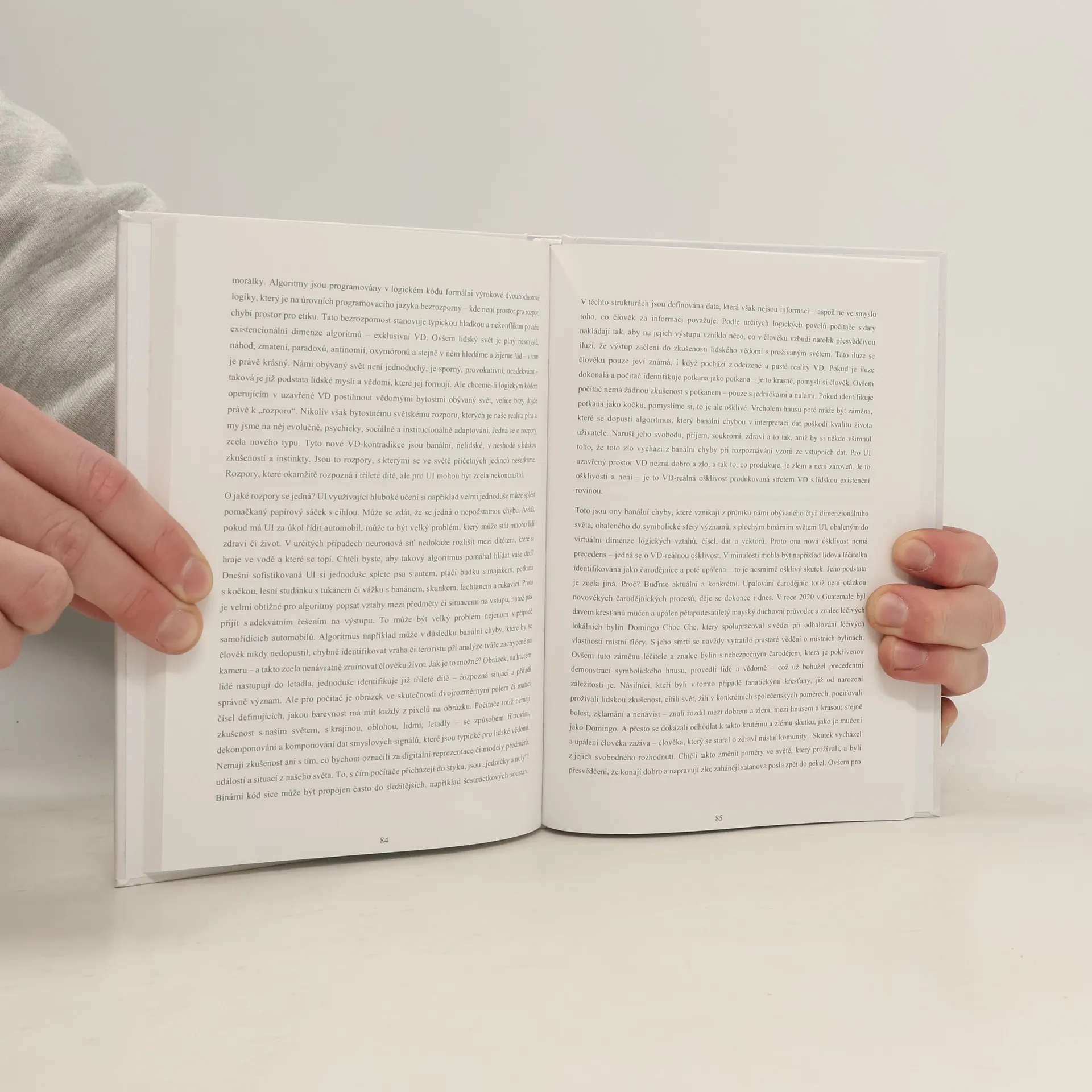 Kniha se zaměřuje na vztah umělé inteligence k našemu prožitému světu a iluzím, které v nás vyvolává. Prozkoumává roli počítačových algoritmů v naší symbolické a konceptuální realitě, kde se digitální technologie staly běžnou součástí života. V posledních dvaceti pěti letech přidává lidstvo do této složité sítě virtuální dimenzi, která nám otevírá nové možnosti manipulace s realitou. Tato dimenze, zprostředkovaná digitálními technologiemi, nám nabízí okamžité extatické zážitky a algoritmy hrají klíčovou roli v udržení naší globálně-virtuální civilizace. Kniha zkoumá vztah umělé inteligence k nám a naší interakci s ní, stejně jako vztah virtuální dimenze k vesmírné a společenské dimenzi. Neposkytuje závazná řešení, ale vede čtenáře k interpretaci a reinterpretaci skrytých významů v naší společnosti. Etika a pojetí dobra a zla v tomto novém světě jsou klíčovými tématy. První kapitola se věnuje založení oboru umělé inteligence a potřebě dynamického etického rámce. Druhá kapitola se zaměřuje na algoritmickou etiku a fenomén chatbotů. Třetí kapitola se zabývá bezpečností algoritmů a potřebou spolupráce mezi různými vědními obory pro efektivní řešení.