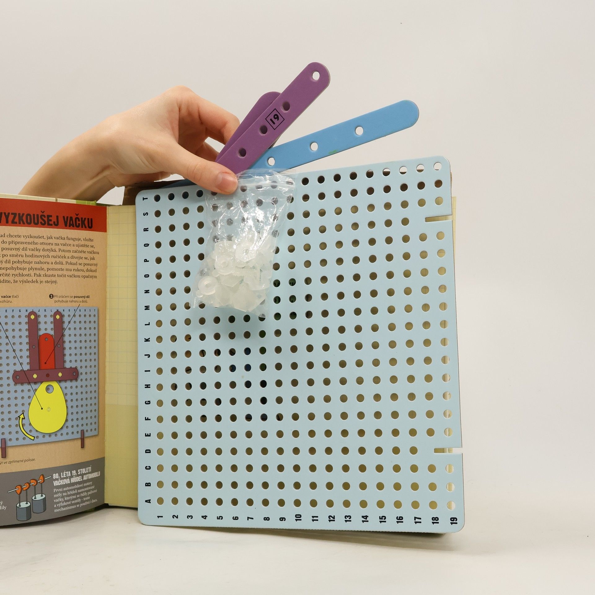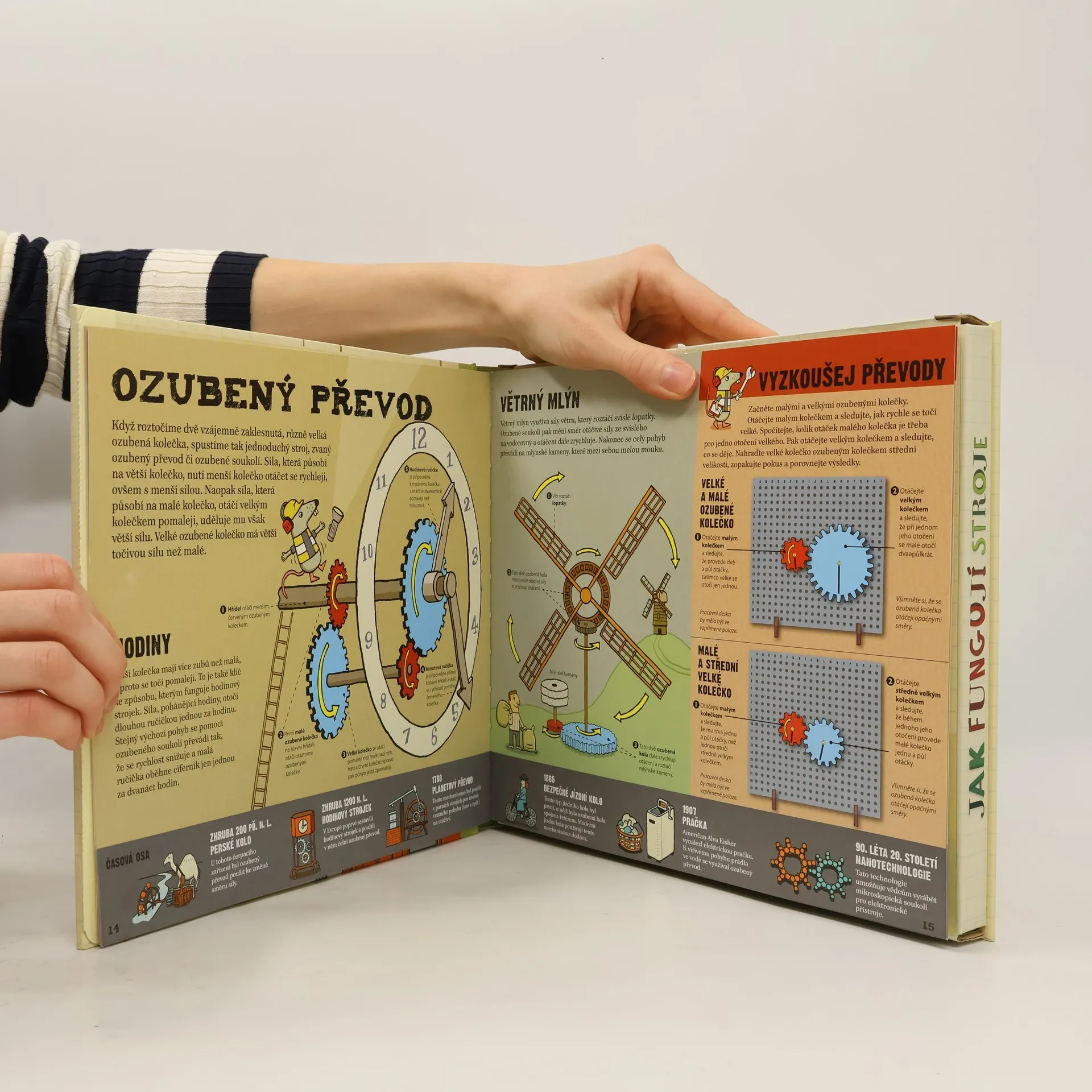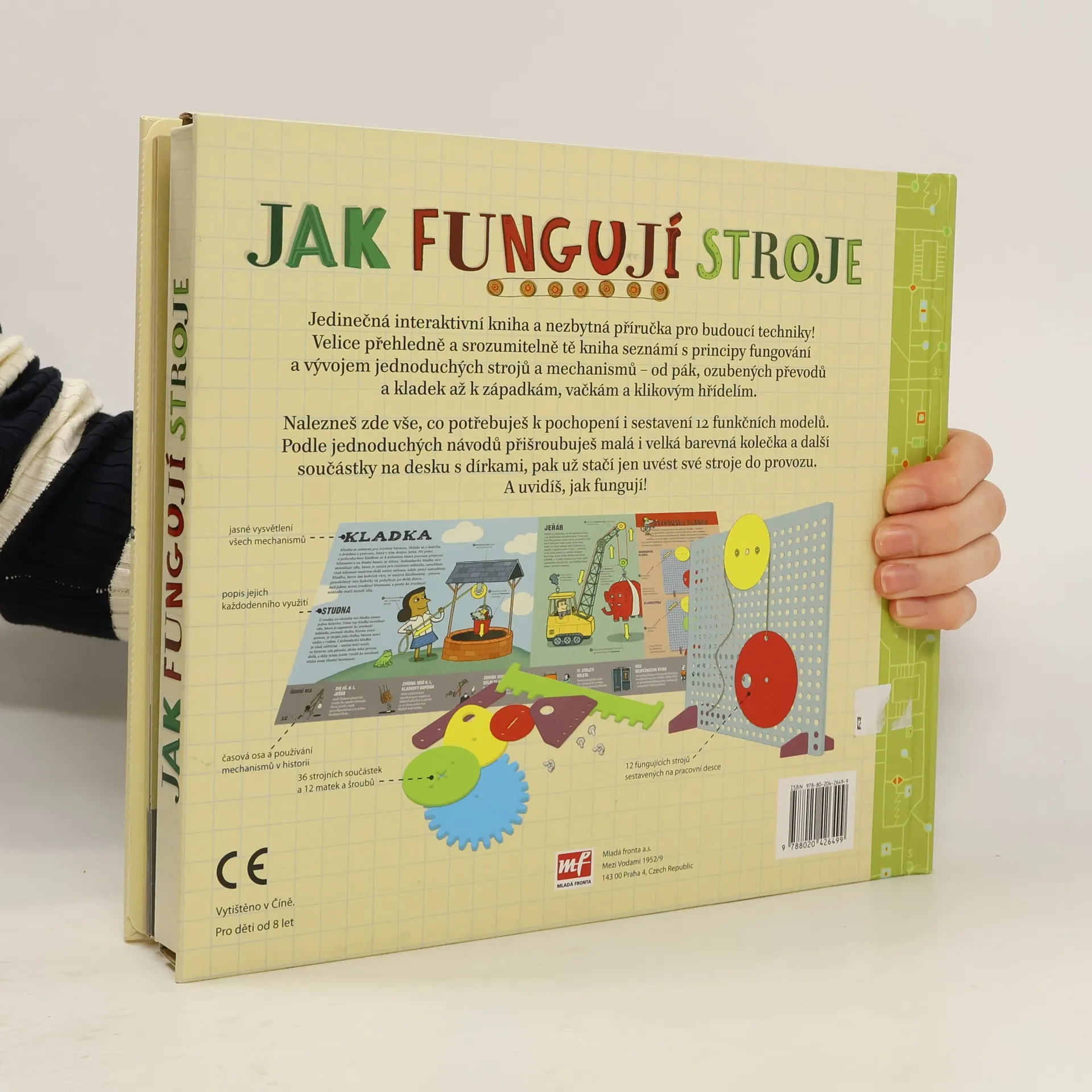 Kniha velice přehledně a srozumitelně seznamuje s principy fungování a vývojem jednoduchých strojů a mechanismů – od pák, ozubených převodů a kladek až k západkám, vačkám a klikovým hřídelím. Každý mechanismus je názorně popsán a vysvětlen a nechybí zde ani časová osa znázorňující proměny využití jednotlivých principů síly v čase. Součástí knihy je praktická část – 12 funkčních modelů, které si čtenáři mohou sami sestavit. Podle jednoduchých návodů lze přišroubovat malá i velká barevná kolečka a další součástky na desku s dírkami, a pak už stačí jen uvést své stroje do provozu.