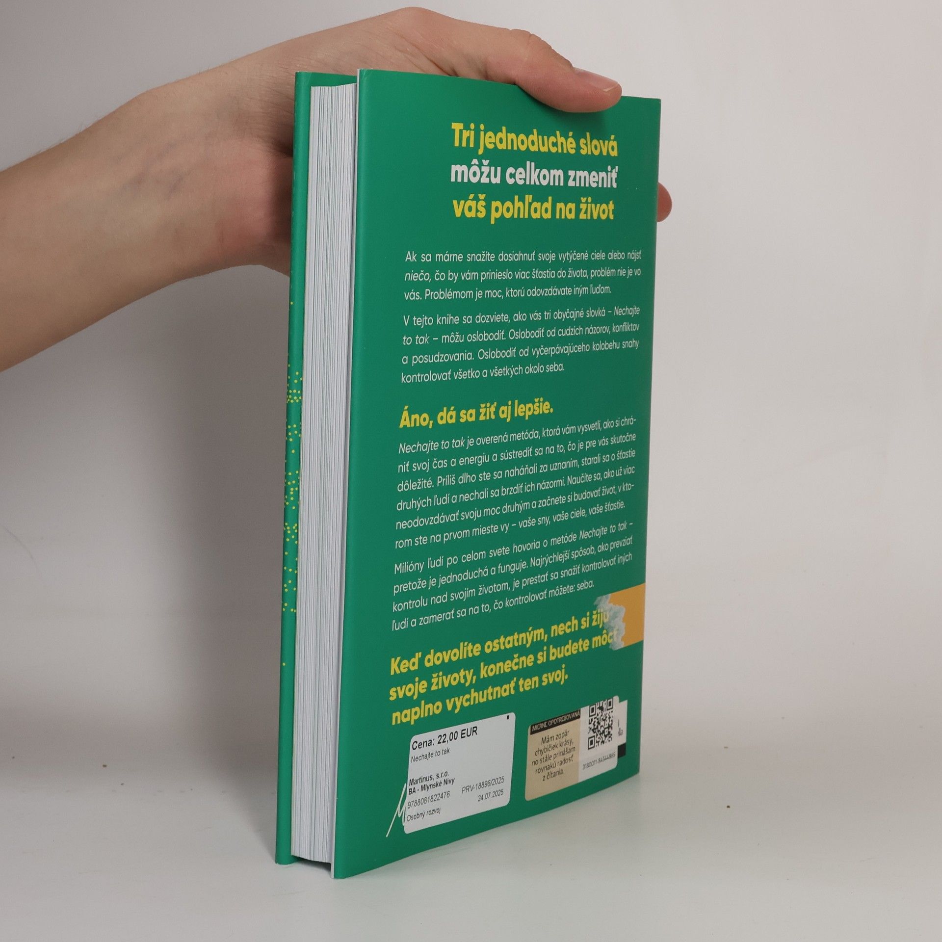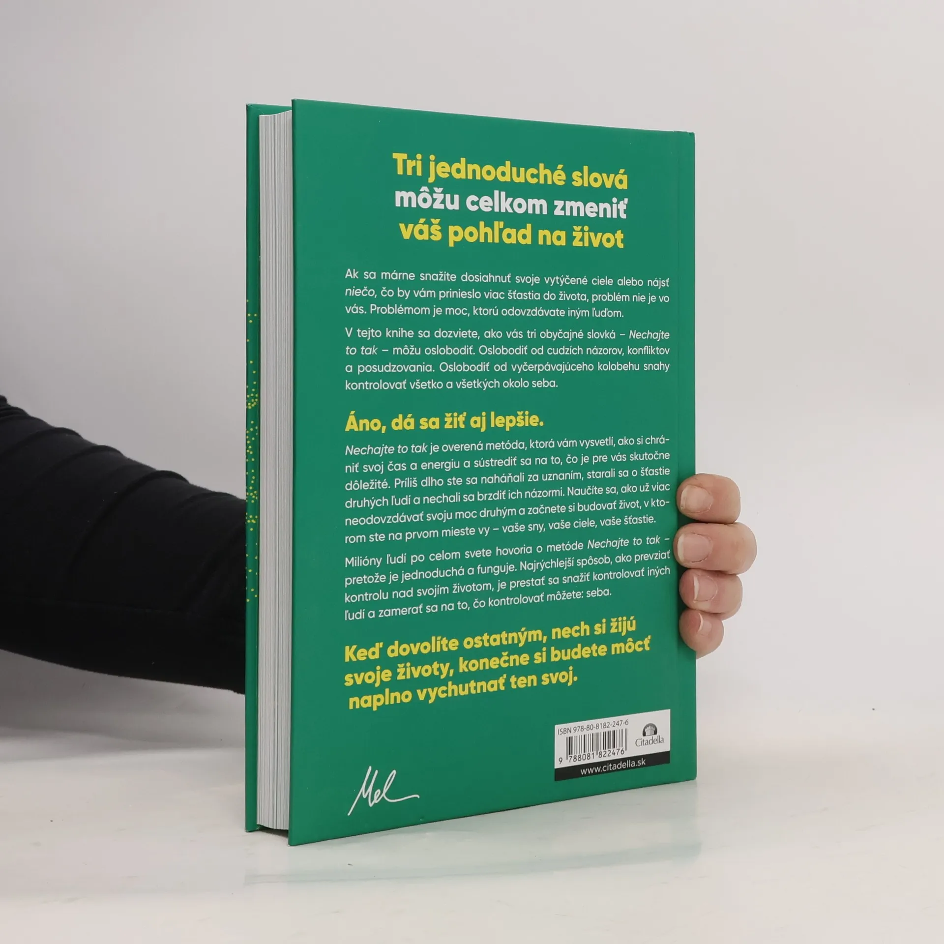 Tri jednoduché slová môžu celkom zmeniť váš pohľad na život Ak sa márne snažíte dosiahnuť svoje vytýčené ciele alebo nájsť niečo, čo by vám prinieslo viac šťastia do života, problém nie je vo vás. Problémom je moc, ktorú odovzdávate iným ľuďom. V tejto knihe sa dozviete, ako vás tri obyčajné slovká – Nechajte to tak – môžu oslobodiť. Oslobodiť od cudzích názorov, konfliktov a posudzovania. Oslobodiť od vyčerpávajúceho kolobehu snahy kontrolovať všetko a všetkých okolo seba. Áno, dá sa žiť aj lepšie. Nechajte to tak je overená metóda, ktorá vám vysvetlí, ako si chrániť svoj čas a energiu a sústrediť sa na to, čo je pre vás skutočne dôležité. Príliš dlho ste sa naháňali za uznaním, starali sa o šťastie druhých ľudí a nechali sa brzdiť ich názormi. Naučíte sa, ako už viac neodovzdávať svoju moc druhým a začnete si budovať život, v ktorom ste na prvom mieste vy – vaše sny, vaše ciele, vaše šťastie. Milióny ľudí po celom svete hovoria o metóde Nechajte to tak – pretože je jednoduchá a pretože funguje. Najrýchlejší spôsob, ako prevziať kontrolu nad svojím životom, je prestať sa snažiť kontrolovať iných ľudí a zamerať sa na to, čo kontrolovať môžete: na seba. Keď dovolíte ostatným, nech si žijú svoje životy, konečne si budete môcť naplno vychutnať ten svoj.