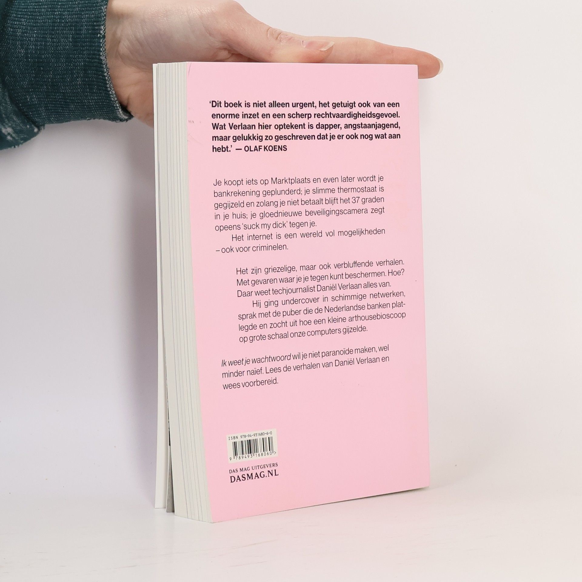 Je koopt iets op Marktplaats en even later wordt je bankrekening geplunderd; je slimme thermostaat is gegijzeld en zolang je niet betaalt blijft het 37 graden in je huis; je gloednieuwe beveiligingscamera zegt opeens 'suck my dick' tegen je.Het internet is een wereld vol mogelijkheden - ook voor criminelen.Het zijn griezelige, maar ook verbluffende verhalen. Met gevaren waar je je tegen kunt beschermen. Hoe? Daar weet techjournalist Daniël Verlaan alles van.Hij ging undercover in schimmige netwerken, sprak met de puber die de Nederlandse banken platlegde en zocht uit hoe een kleine arthousebioscoop op grote schaal onze computers gijzelde.Ik weet je wachtwoord wil je niet paranoïde maken, wel minder naïef. Lees de verhalen van Daniël Verlaan en wees voorbereid.Daniël Verlaan (1989) is een van de belangrijkste techjournalisten van het moment. Hij werkt voor RTL Nieuws. Vorig jaar ontving hij de Loep, de prijs voor de beste onderzoeksjournalistiek, en de Tegel, de belangrijkste journalistieke prijs van Nederland.