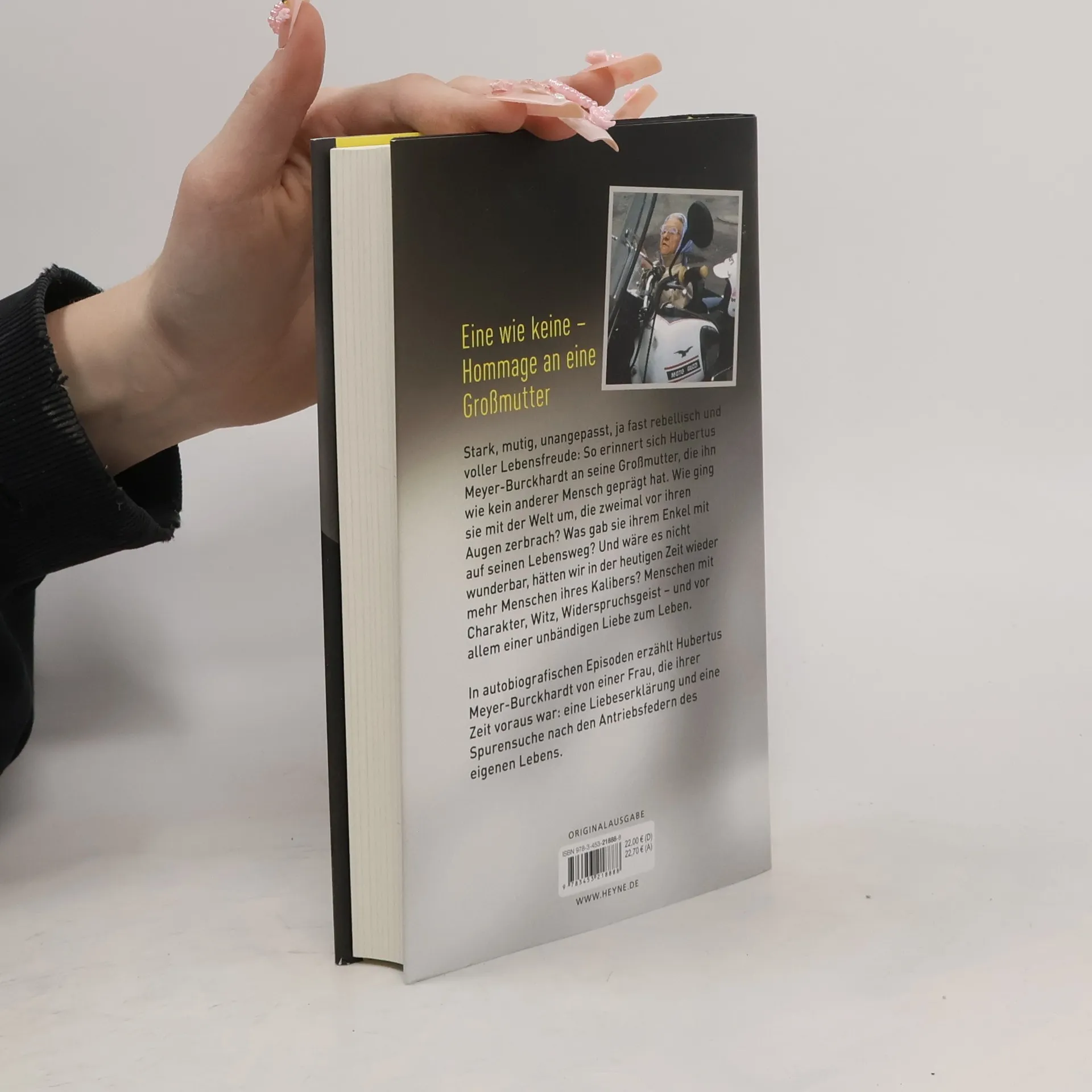 »Wenn Sie unbedingt auf Ihr Volk stolz sein möchten, empfehle ich Ihnen den Beruf des Imkers.« Mit diesem Satz prostete Christel Vollbrecht, Jahrgang 1898 und die Großmutter von Hubertus Meyer-Burckhardt, ihrem Gegenüber in der Weinstube Boos zu, wo sie nahezu jeden Abend saß. Wenn sie nicht gerade im Beiwagen einer Moto Guzzi kauerte und dem Fahrer befahl: »Schneller. Fahren Sie doch bitte endlich schneller!« Ein Leben auf der Überholspur, rebellisch, unangepasst, voller Lebensfreude und unglaublich stark und mutig: So erinnert sich Hubertus Meyer-Burkhardt - TV-Produzent, Bestsellerautor und Gastgeber der NDR-Talkshow - an seine geliebte Großmutter, die ihn wie kein anderer Mensch geprägt hat. Wie ging sie mit der Welt um, die zweimal vor ihren Augen zerbrach? Was gab sie ihrem Enkel mit auf seinen Lebensweg? Und wäre es nicht wunderbar, hätten wir in der heutigen Zeit wieder mehr Menschen ihres Kalibers? Menschen mit einer unbedingten Liebe zum Leben, mit Witz, Widerspruchsgeist und Charakter. Hubertus Meyer-Burckhardt erzählt in autobiographischen Episoden von einer Frau, die ihrer Zeit voraus war: eine zärtliche Liebeserklärung und eine Spurensuche nach den Antriebsfedern des eigenen Lebens. Ausstattung: Mit Fotos