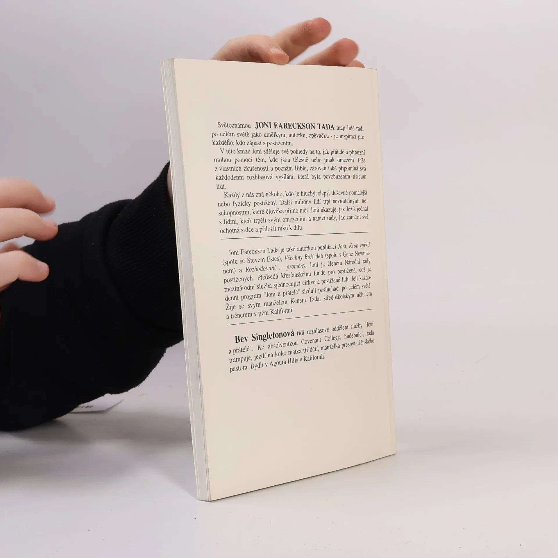 Světoznámou Joni Eareckson Tada mají lidé rádi po celém světě jako umělkyni, autorku, zpěvačku - je inspirací pro každého, kdo zápasí s postižením. V této knize Joni sděluje své pohledy těm, kde jsou tělesně nebo jinak omezeni. Píše z vlastních zkušeností a poznání Bible, zároveň také připomíná svá každodenní rozhlasová vysílání, která byla povzbuzením tisícům lidí. Každý z nás zná někoho, kdo je hluchý, slepý, duševně pomalejší nebo fyzicky postižený. Další milióny lidí trpý neviditelnými neschopnostmi, které člověka přímo ničí. Joni ukazuje, jak Ježíš jednal s lidmi, kteří trpěli svým omezením, a nabízí rady, jak zaměřit svá ochotná srdce a přiložit ruku k dílu.