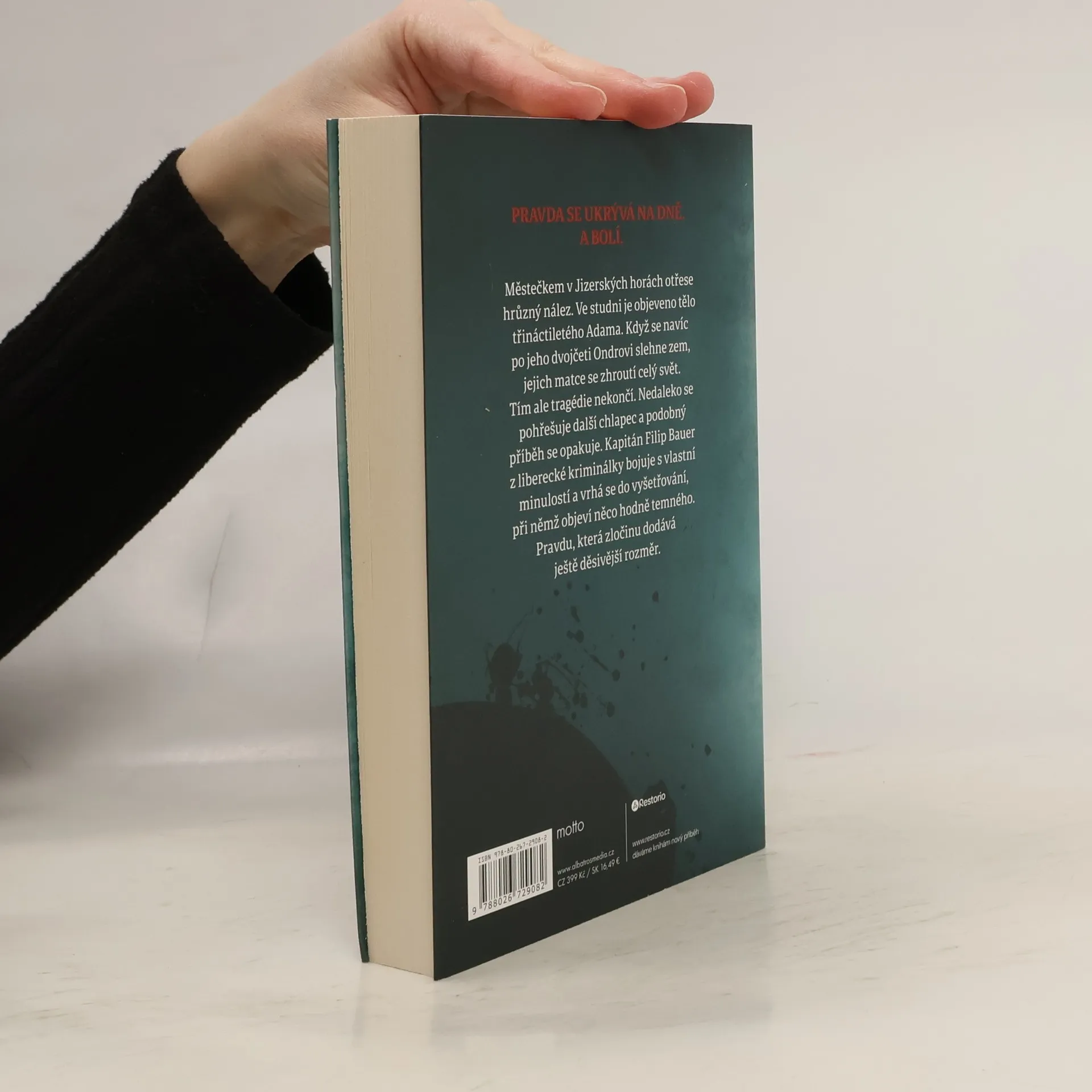 Městečkem v Jizerských horách otřese hrůzný nález. Ve studni je objeveno tělo třináctiletého Adama. Když se navíc po jeho dvojčeti Ondrovi slehne zem, jejich matce se zhroutí celý svět. Tím ale tragédie nekončí. Nedaleko se pohřešuje další chlapec a podobný příběh se opakuje. Kapitán Filip Bauer z liberecké kriminálky bojuje s vlastní minulostí a vrhá se do vyšetřování, při němž objeví něco hodně temného. Pravdu, která zločinu dodává ještě děsivější rozměr.