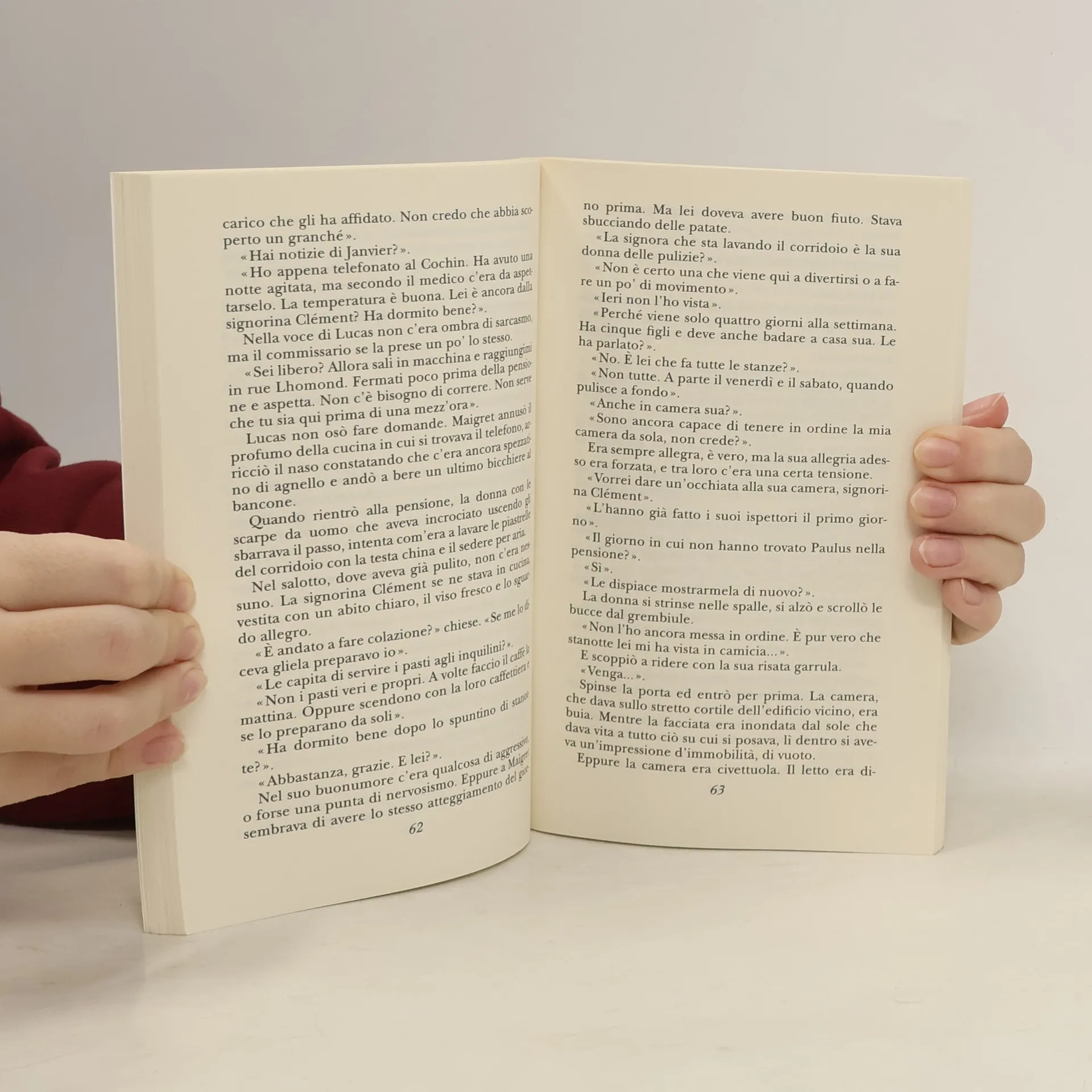 A tutta prima aveva creduto che fosse un po' svitata. Ora si chiedeva se quella esuberanza non fosse dovuta al fatto che lei recitava, non solo per ingannarlo, non solo per nascondergli qualcosa, ma per il puro piacere di interpretare un ruolo. «Si diverte molto, signorina Clément?». «Mi diverto sempre, commissario». Questa volta lo guardò con tutto il suo ritrovato candore. Nelle scuole femminili c'è quasi sempre almeno una ragazzina di una spanna più alta delle altre e con quelle stesse forme prosperose. A tredici o quattordici anni assomigliano a enormi bambole di pezza, con gli occhi chiari che non vedono niente della vita e un sorriso trasognato sulle labbra. Ma era la prima volta che Maigret ne conosceva una di quarant'anni.