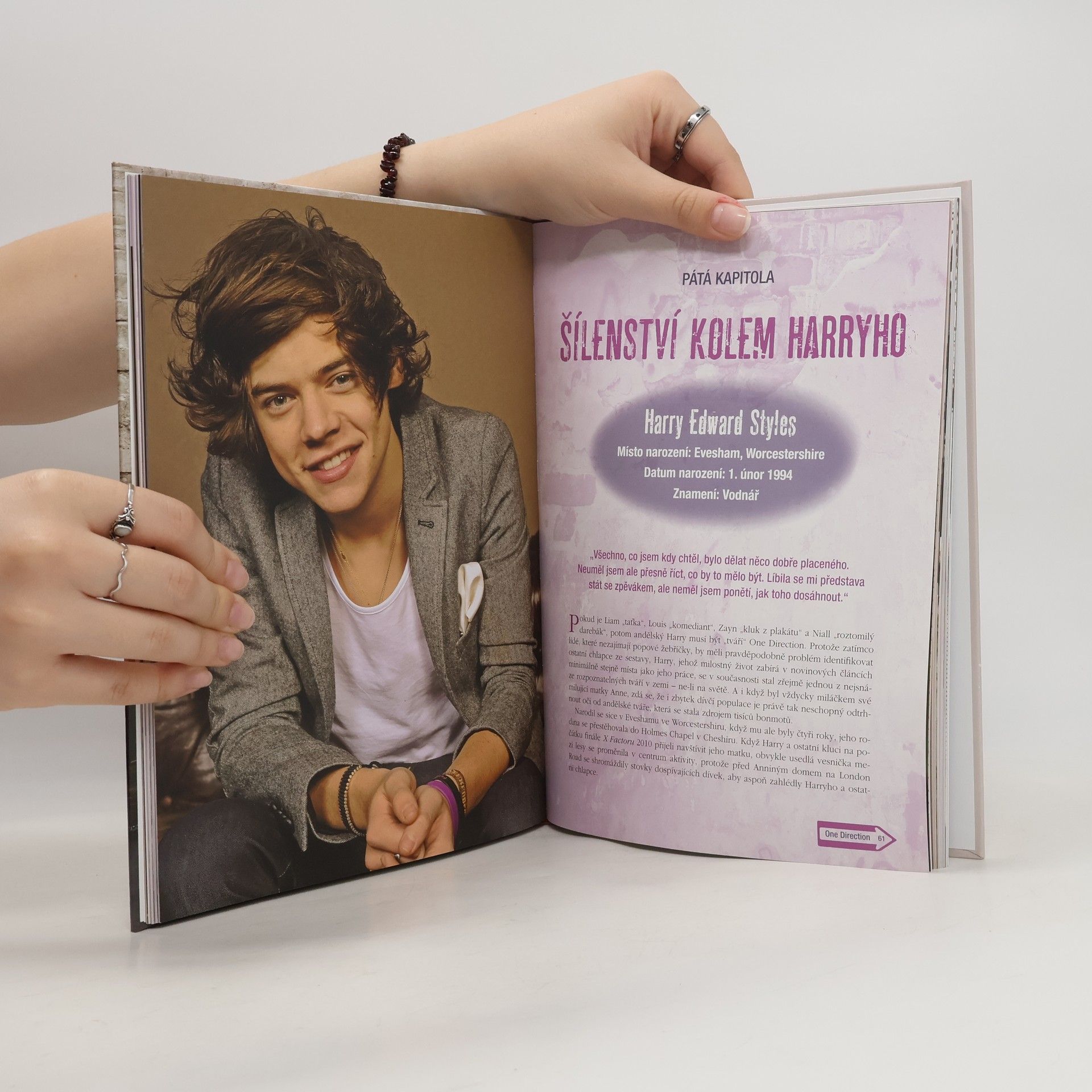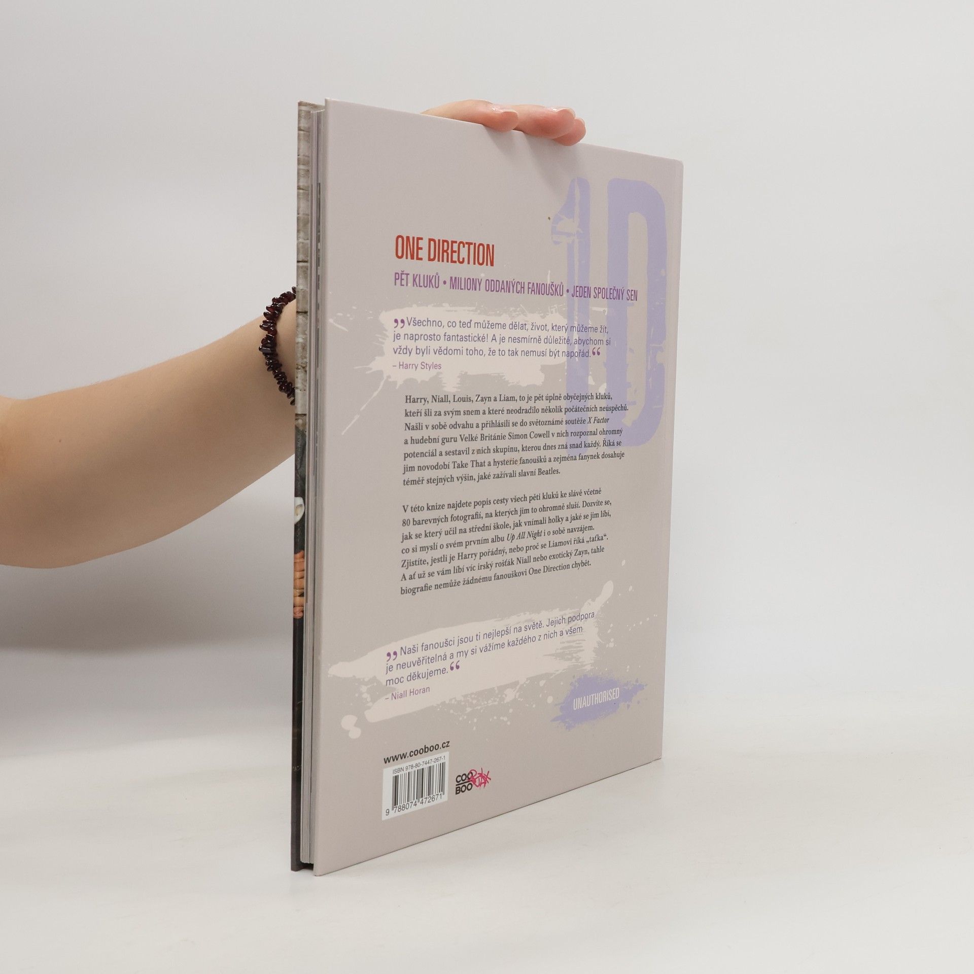 Harry, Niall, Louis, Zayn a Liam je pětice úplně obyčejných kluků, kteří šli za svým snem a které neodradilo pár prvních neúspěchů. Našli v sobě odvahu a přihlásili se do konkurzu světoznámé soutěže X Factor a hudební guru Velké Británie Simon Cowell v nich rozpoznal ohromný potenciál a sestavil z nich skupinu, kterou dnes zná snad každý. Říká se jim novodobí Take That a hysterie fanoušků a zejména fanynek dosahuje téměř stejných výšin, jaké zažívali slavní Beatles. V této knize najdete cestu všech pěti kluků ke slávě včetně 80 barevných fotografií, kde jim to ohromně sluší. Dozvíte se, jak se který učil na střední škole, jak vnímali holky a jaký typ se jim líbí, co si myslí o svém prvním albu Up All Night i o sobě navzájem. Zjistíte, jestli je Harry pořádný, nebo proč se Liamovi říká „taťka“. A ať už se vám líbí víc irský rošťák Niall nebo exotický Zayn, tahle biografie nemůže žádnému fanouškovi One Direction chybět.