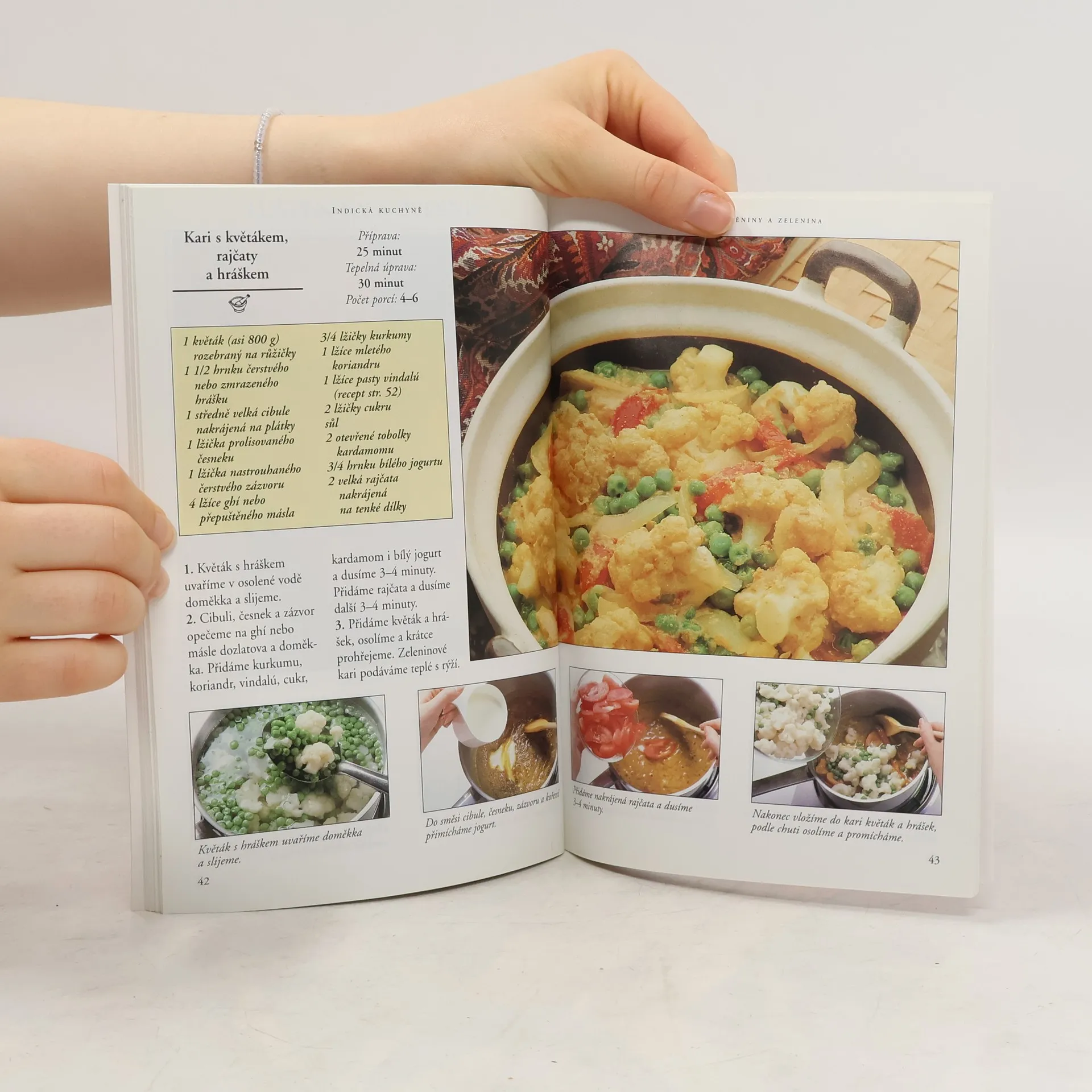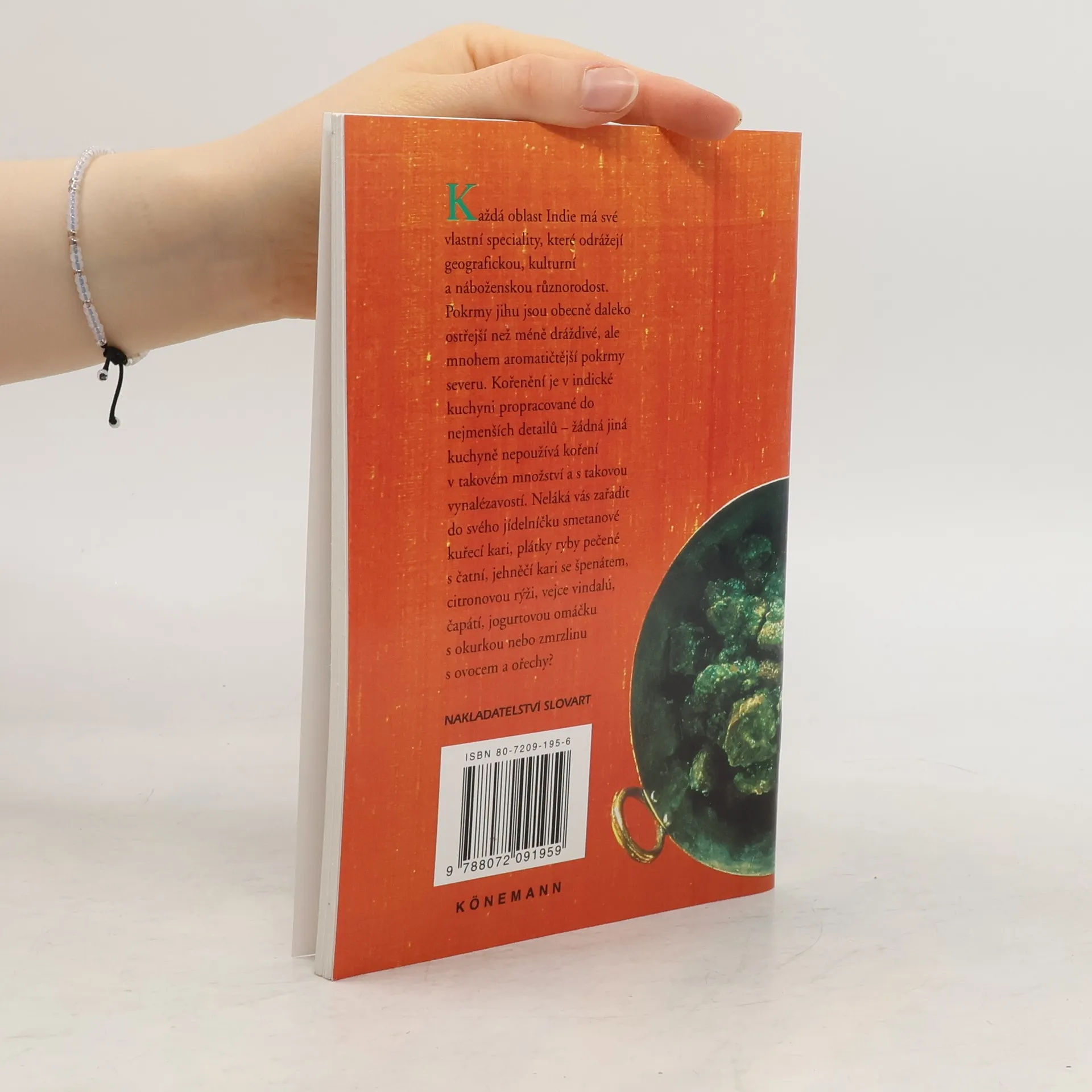 Formát A5. Obsah jednotlivých kapitol: Polévky a předkrmy, Kuřata, ryby a plody moře, Pokrmy z masa, Luštěniny a zelenina, Přílohy, Dezerty. Ke každému receptu je fotografie hotového pokrmu a čtyři malé fotografie s jednotlivými fázemi přípravy. V závěru knihy je malý slovníček indických pokrmů.