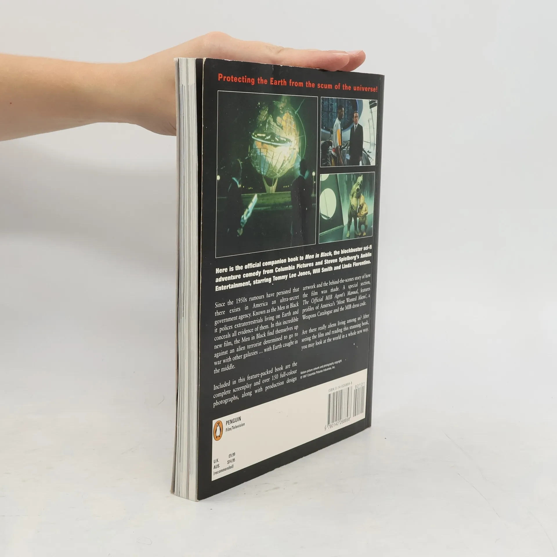 The official companion book to the sci-fi comedy adventure. Included in this book are the complete Ed Solomon screenplay and more than 150 full-color photos, along with production design artwork and the behind-the-scenes story of how the film was made. A special bonus section, The Official MIB Agent's Manual, features profiles of America's "Most Wanted Aliens," a Weapons Catalog, a Field Placement Evaluation for new recruits, and the MIB Dress Code. 150 color photos, drawings. The Newmarket Pictorial Moviebooks, official companions to films, large format (8 3/8 x 10 7/8), heavily illustrated throughout, with color photographs, details on the making of the film, background on the filmmakers and cast.