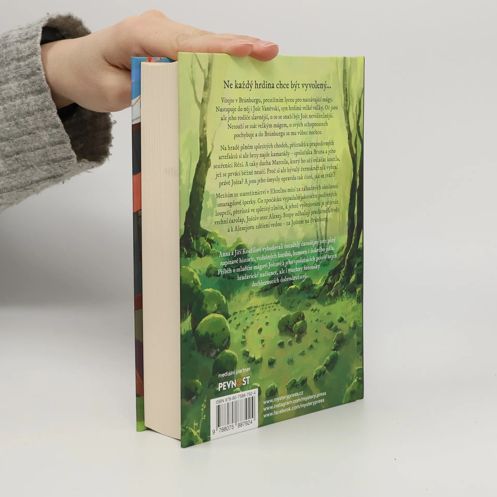 NE KAŽDÝ HRDINA CHCE BÝT VYVOLENÝ…Vítejte v Brünburgu, prestižním lyceu pro nastávající mágy. Nastupuje do něj i Jošt Vaněvski, syn hrdinů velké války. Oč jsou ale jeho rodiče slavnější, o to se snaží být Jošt neviditelnější. Netouží se stát velkým mágem, o svých schopnostech pochybuje a do Brünburgu se mu vůbec nechce.Na hradě plném spletitých chodeb, přízraků a prapodivných artefaktů si ale brzy najde kamarády – spolužáka Bruna a jeho sestřenici Rézi. A taky ducha Marcela, který ho učí ovládat kouzla, jež se prváci běžně neučí. Proč si ale bývalý černokněžník vybral právě Jošta? A jsou jeho úmysly opravdu tak čisté, jak se tváří?Mezitím ze starožitnictví v Ehzelnu mizí za záhadných okolností smaragdové šperky. Co zpočátku vypadalo jako série podivných loupeží, přerůstá ve spletitý zločin, k jehož vyšetřování je přizván vrchní čarolap, Joštův otec Alexej. Stopy odhalují pradávné křivdy a k Alexejovu zděšení vedou – za Joštem na Brünburg._____Anna a Jiří Kouřilovi vybudovali rozsáhlý čarodějný svět plný napínavé historie, vzdušných korábů, humoru i dobrého jídla. Příběh o mladém mágovi Joštovi a jeho spolužácích potěší nejen bradavické nadšence, ale i všechny fanoušky dechberoucích dobrodružství.