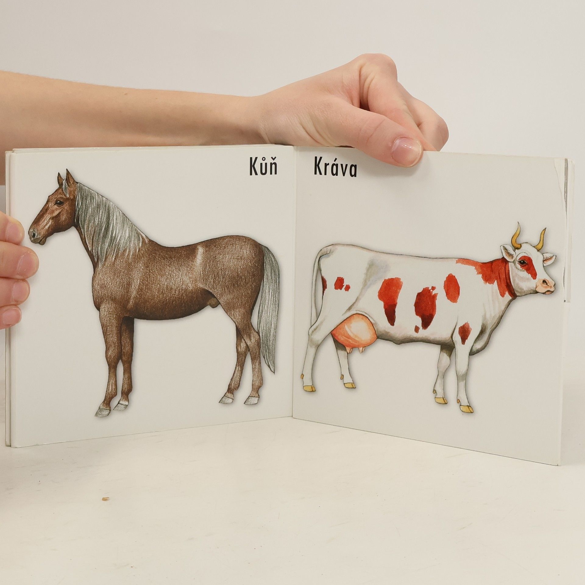 Domácí zvířata Poznávací leporelo bez textu – pouze názvy u obrázků. Základní domácí zvířata v realistické výrazné kresbě (pes, kočka, koza, kráva, ovce, králík, slepice…). Malý formát, určeno nejmenším dětem, a hlavně městským, které mohou potkat živého psa nebo kočičku, ale pro mnohé je pojem kráva nebo prase zcela nepředstavitelný.