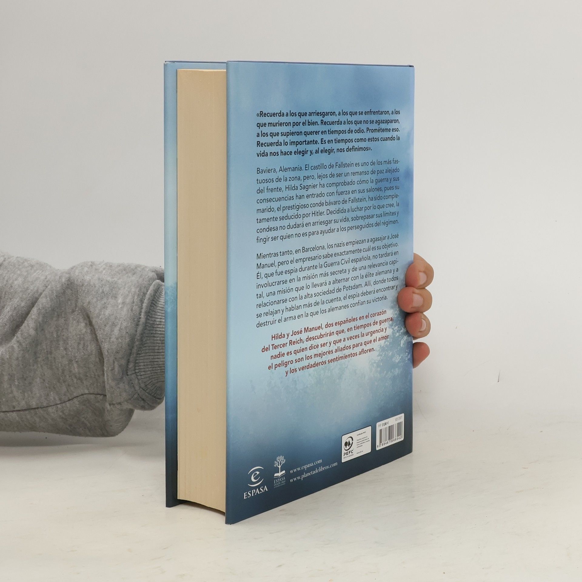 «Recuerda a los que arriesgaron, a los que se enfrentaron, a los que murieron por el bien. Prométeme eso. Recuerda lo importante. Es en tiempos como estos cuando la vida nos hace elegir y, al elegir, nos definimos». En Baviera, el castillo de Fallstein, lujoso pero marcado por la guerra, se convierte en el escenario de la lucha de Hilda Sagnier. Su esposo, el conde bávaro, ha caído bajo la influencia de Hitler, y Hilda, decidida a defender sus creencias, arriesgará su vida y se hará pasar por alguien más para ayudar a los perseguidos del régimen. Mientras tanto, en Barcelona, José Manuel, un empresario y exespía de la Guerra Civil española, se ve envuelto en una misión secreta de gran importancia. Atraído por los nazis, pronto se relacionará con la élite alemana en Postdam, donde deberá descubrir y destruir el arma que los alemanes consideran clave para su victoria. Hilda y José Manuel, dos españoles en el corazón del Tercer Reich, aprenderán que en tiempos de guerra, las identidades se difuminan y que el peligro puede ser un aliado inesperado para el amor y los sentimientos verdaderos.