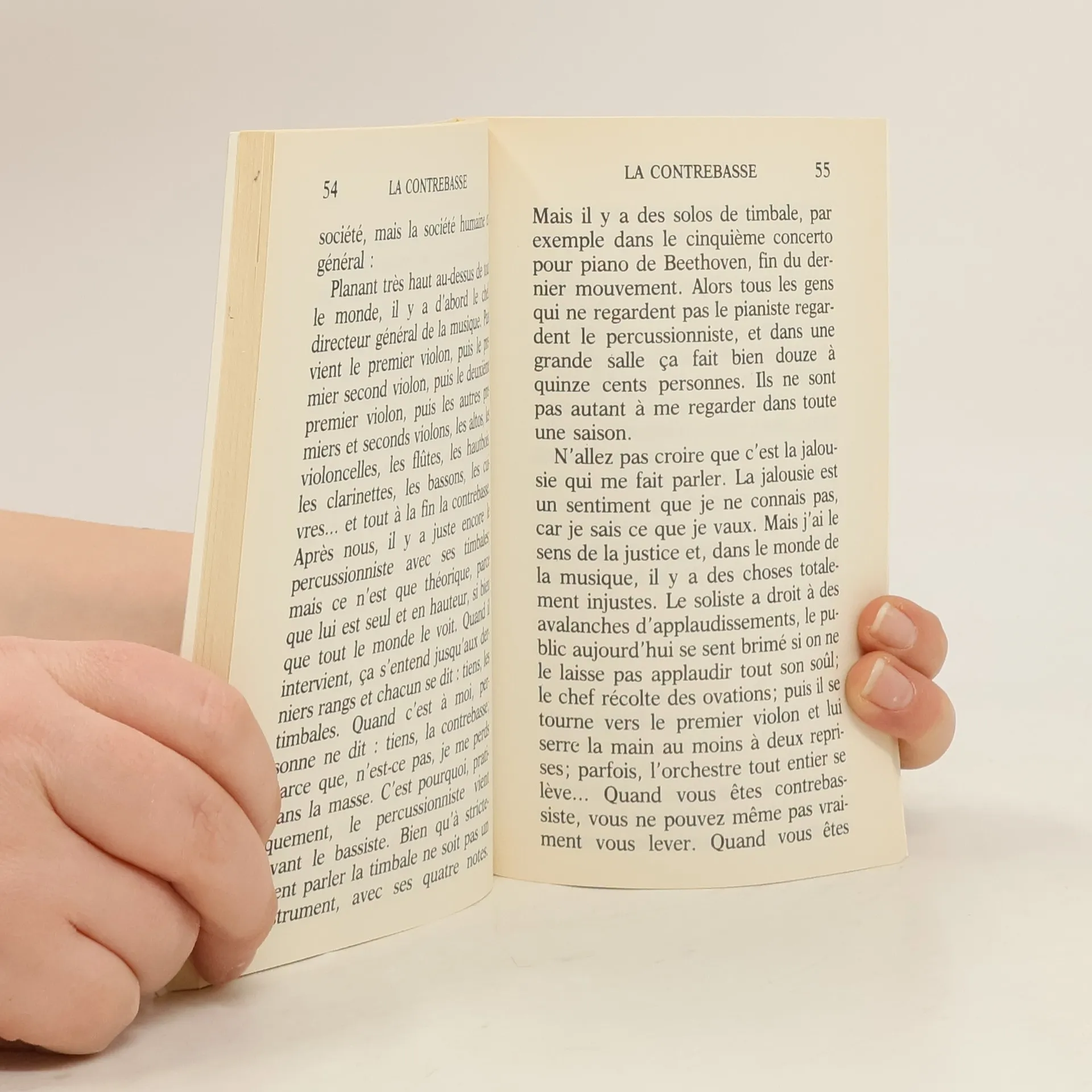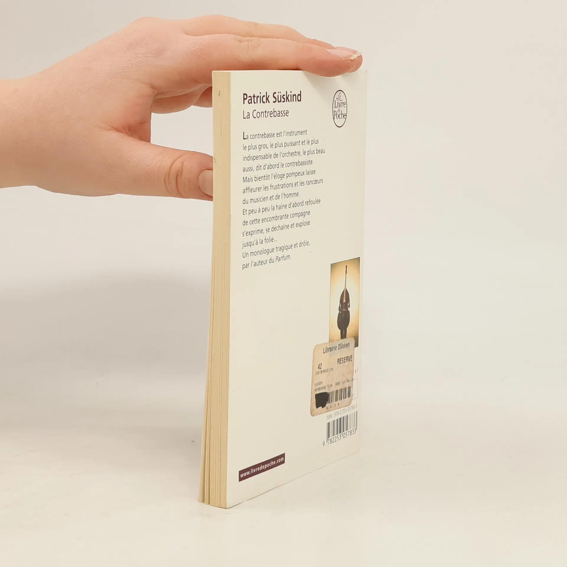 La contrebasse est l'instrument le plus gros, le plus puissant et le plus indispensable de l'orchestre, le plus beau aussi, dit d'abord le contrebassiste. Mais bientôt l'éloge pompeux laisse affleurer les frustrations et les rancoeurs du musicien et de l'homme. Et peu à peu la haine d'abord refoulée de cette encombrante compagne s'exprime, se déchaîne et explose jusqu'à la folie... Ce monologue tragique et drôle, par l'auteur du best-seller Le Parfum, tient l'affiche en Allemagne depuis des années. Interprété à Paris par Jacques Villeret, il a reçu un accueil triomphal.
