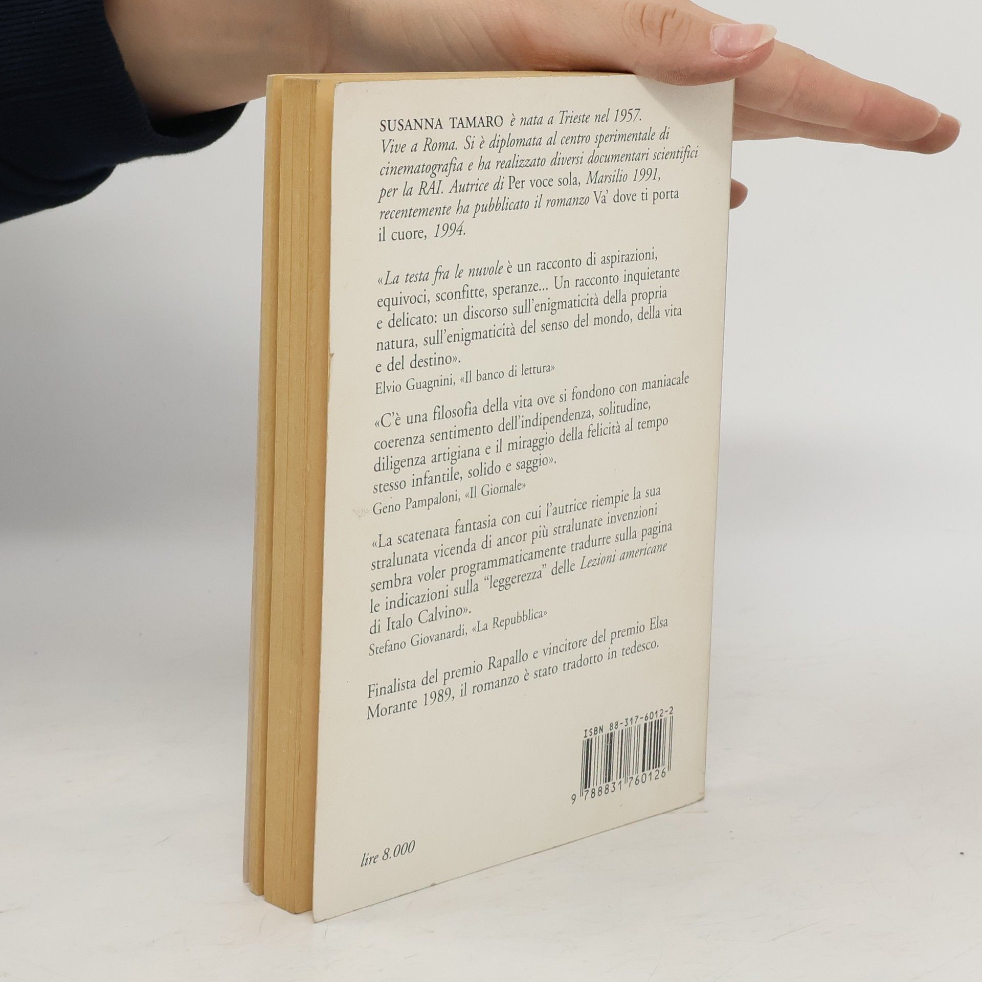 "La scatenata fantasia con cui l'autrice riempie la sua stralunata vicenda di ancor più stralunate invenzioni sembra voler programmaticamente tradurre sulla pagina le indicazioni sulla 'leggerezza' delle Lezioni americane di Italo Calvino." (Stefano Giovanardi). Con La testa fra le nuvole Susanna Tamaro ha vinto il Premio Elsa Morante.