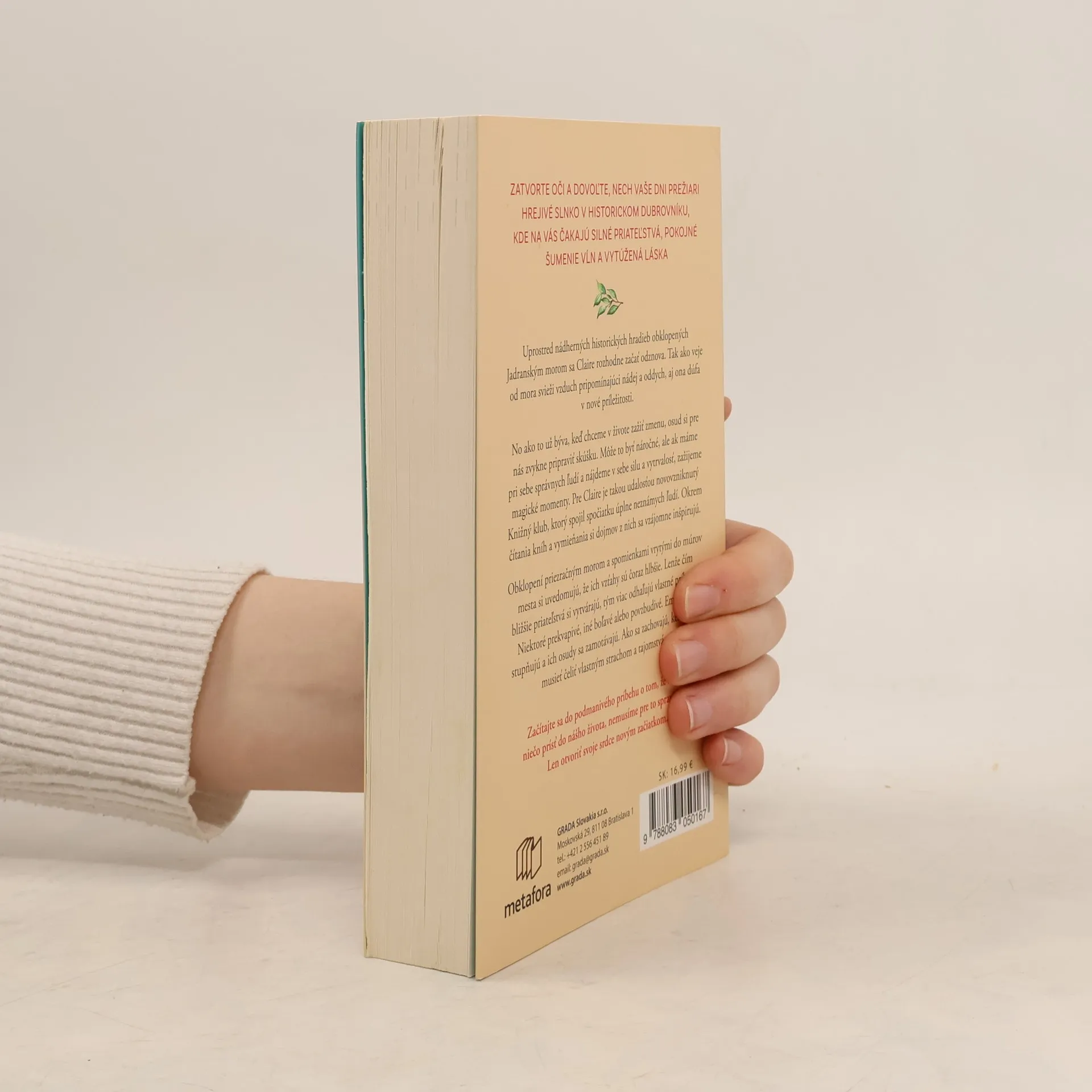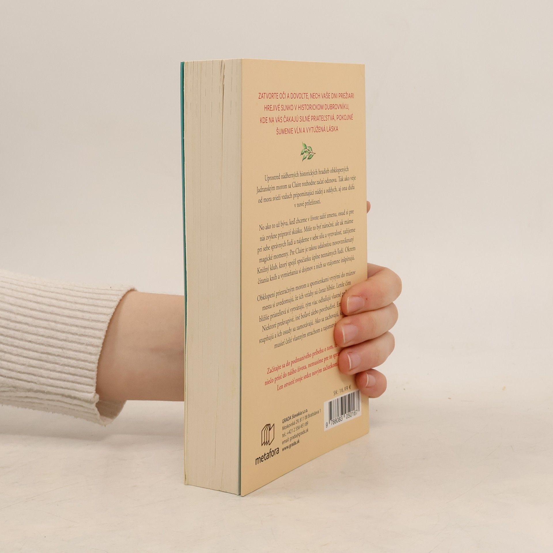 Uprostred nádherných historických hradieb obklopených Jadranským morom sa Claire rozhodne začať odznova. Tak ako veje od mora svieži vzduch pripomínajúci nádej a oddych, aj ona dúfa v nové príležitosti. No ako to už býva, keď chceme v živote zažiť zmenu, osud si pre nás zvykne pripraviť skúšku. Môže to byť náročné, ale ak máme pri sebe správnych ľudí a nájdeme v sebe silu a vytrvalosť, zažijeme magické momenty. Pre Claire je takou udalosťou novovzniknutý Knižný klub, ktorý spojil spočiatku úplne neznámych ľudí. Okrem čítania kníh a vymieňania si dojmov z nich sa vzájomne inšpirujú. Obklopení priezračným morom a spomienkami vrytými do múrov mesta si uvedomujú, že ich vzťahy sú čoraz hlbšie. Lenže čím bližšie priateľstvá si vytvárajú, tým viac odhaľujú vlastné príbehy. Niektoré prekvapivé, iné boľavé alebo povzbudivé. Emócie sa stupňujú a ich osudy sa zamotávajú. Ako sa zachovajú, keď budú musieť čeliť vlastným strachom a tajomstvám?