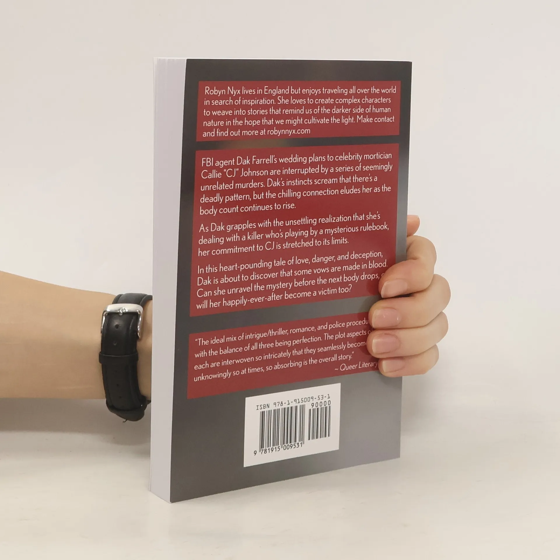 FBI agent Dak Farrell’s wedding plans to celebrity mortician Callie “CJ” Johnson are interrupted by a series of seemingly unrelated murders. Dak’s instincts scream that there’s a deadly pattern, but the chilling connection eludes her as the body count continues to rise.As Dak grapples with the unsettling realization that she's dealing with a killer who's playing by a mysterious rulebook, her commitment to CJ is stretched to its limits.In this heart-pounding tale of love, danger, and deception, Dak is about to discover that some vows are made in blood. Can she unravel the mystery before the next body drops, or will her happily-ever-after become a victim too?