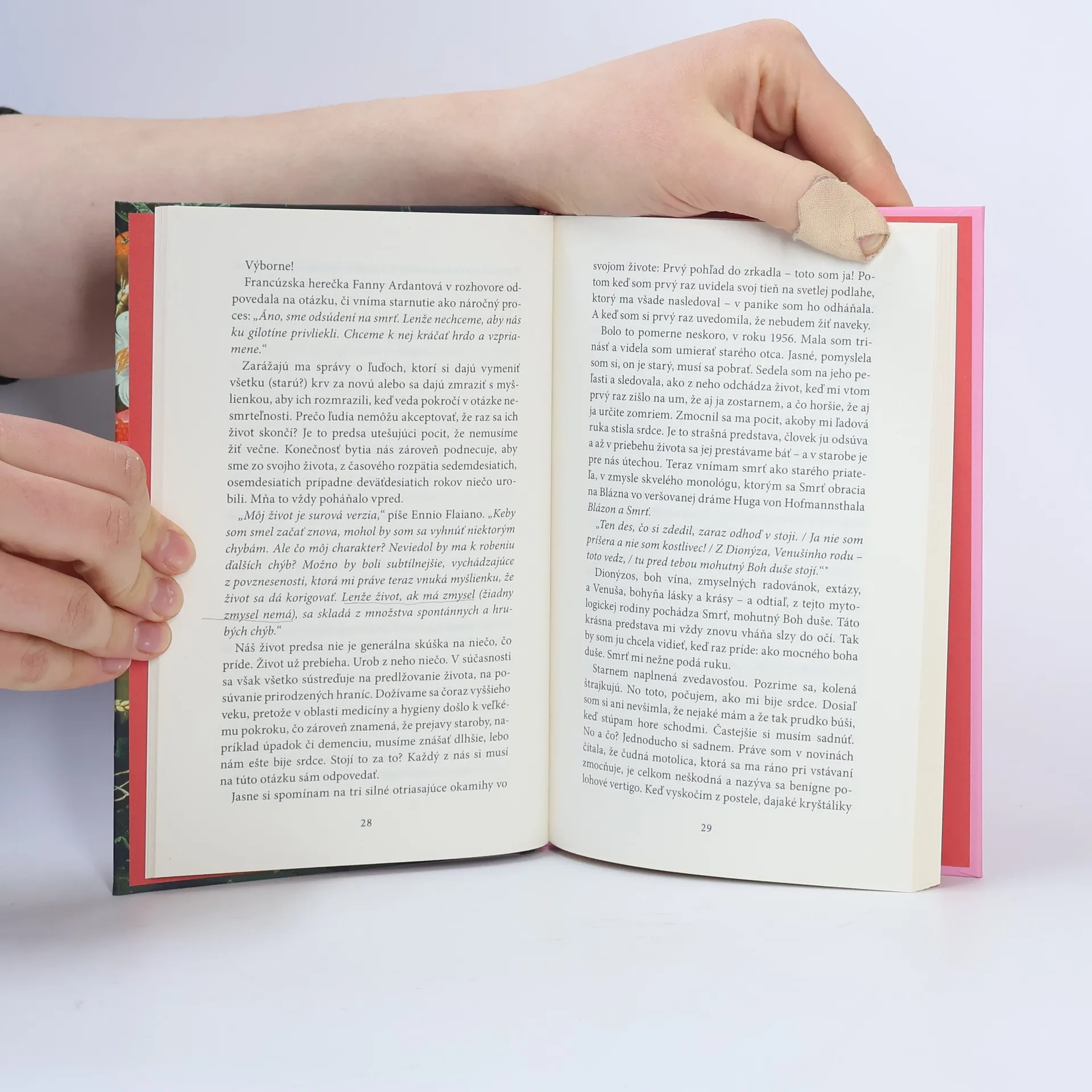 "Čo so mnou robí starnutie ? Netuším. Viem len jedno; stojím mu zoči-voči, nepopieram ho. Nesnažím sa pôsobiť mladšie , ako som. A už vôbec si nemyslím, že život v starobe má menšiu hodnotu ."