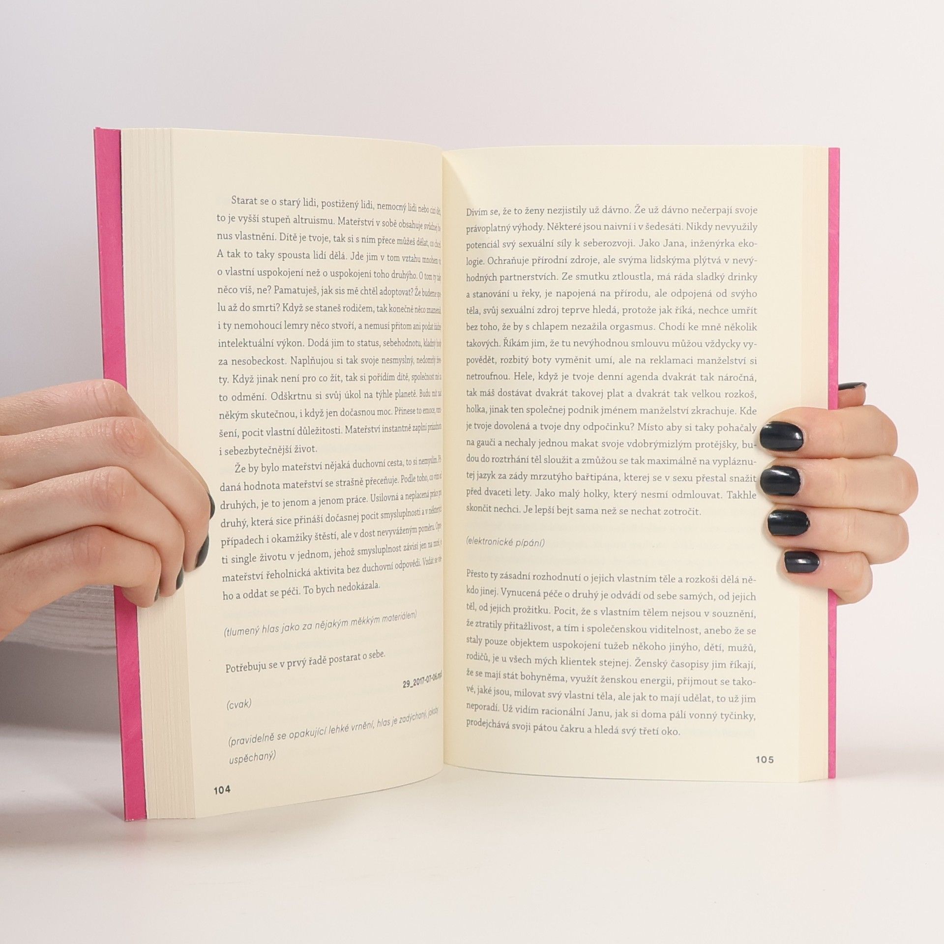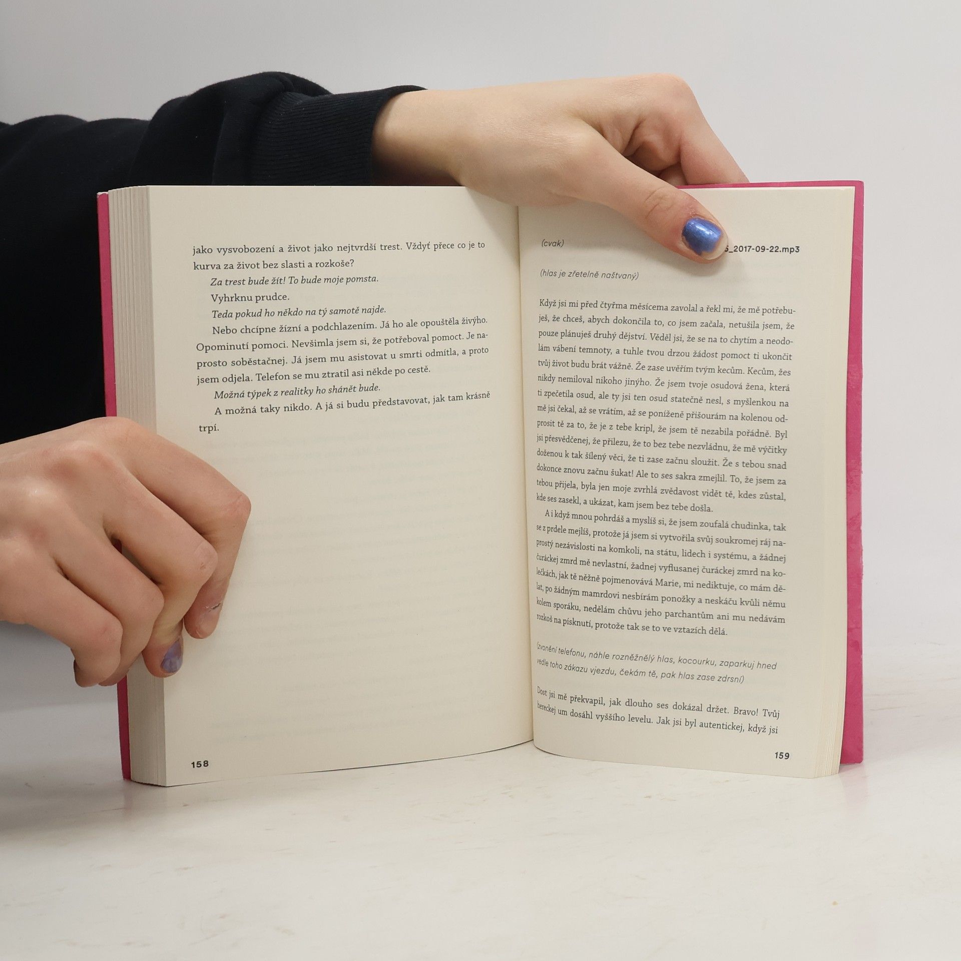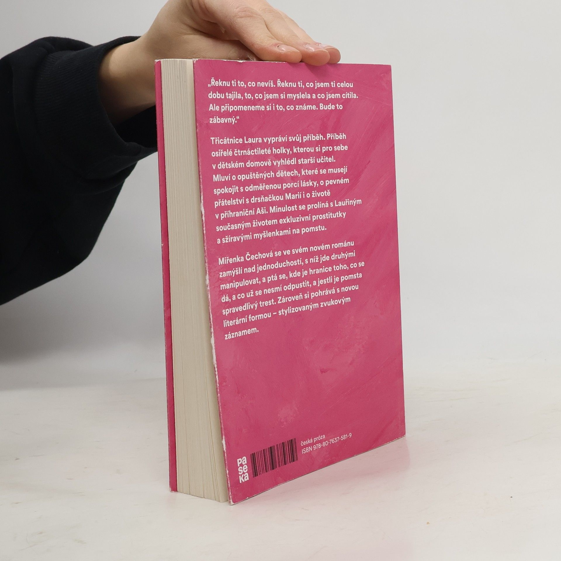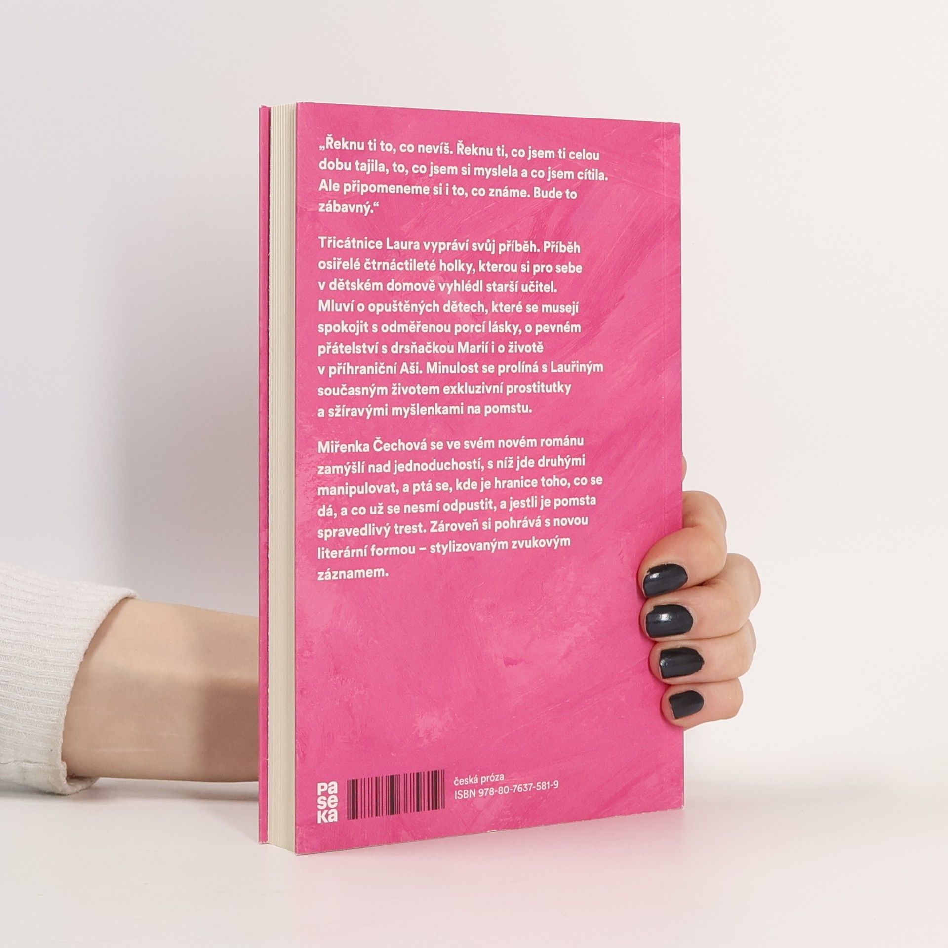 „Řeknu ti to, co nevíš. Řeknu ti, co jsem ti celou dobu tajila, to, co jsem si myslela a co jsem cítila. Ale připomeneme si i to, co známe. Bude to zábavný.“ Třicátnice Laura vypráví svůj příběh. Příběh osiřelé čtrnáctileté holky, kterou si pro sebe v dětském domově vyhlédl starší učitel. Mluví o opuštěných dětech, které se musejí spokojit s odměřenou porcí lásky, o pevném přátelství s drsňačkou Marií i o životě v příhraniční Aši. Minulost se prolíná s Lauřiným současným životem exkluzivní prostitutky a sžíravými myšlenkami na pomstu. Miřenka Čechová se ve svém novém románu zamýšlí nad jednoduchostí, s níž jde druhými manipulovat, a ptá se, kde je hranice toho, co se dá, a co už se nesmí odpustit, a jestli je pomsta spravedlivý trest. Zároveň si pohrává s novou literární formou – stylizovaným zvukovým záznamem.