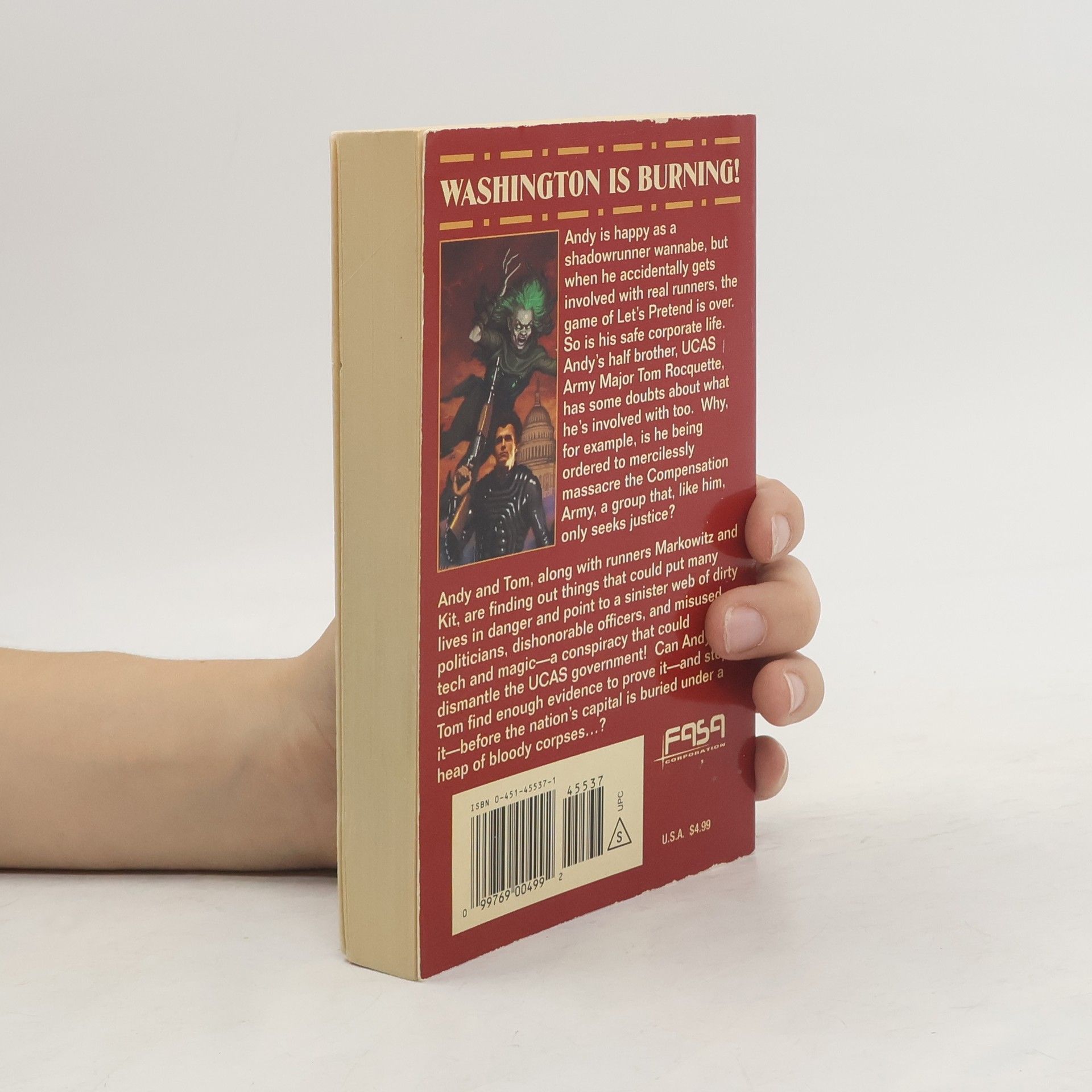 WASHINGTON IS BURNING! Andy is happy as a shadowrunner wannabe, but when he accidentally gets involved with real runners, the game of Let's Pretend is over. So is his safe corporate life. Andy's half brother, UCAS Army Major Tom Rocquette, has some doubts about what he's involved with too. Why, for example, is he being ordered to mercilessly massacre the Compensation Army, a group that, like him, only seeks justice? Andy and Tom, along with runners Markowitz and Kit, are finding out things that could put many lives in danger and point to a sinister web of dirty politicians, dishonorable officers, and misused tech and magic--a conspiracy that could dismantle the UCAS government! Can Andy and Tom find enough evidence to prove it--and stop it--before the nation's capital is buried under a heap of bloody corpses...?