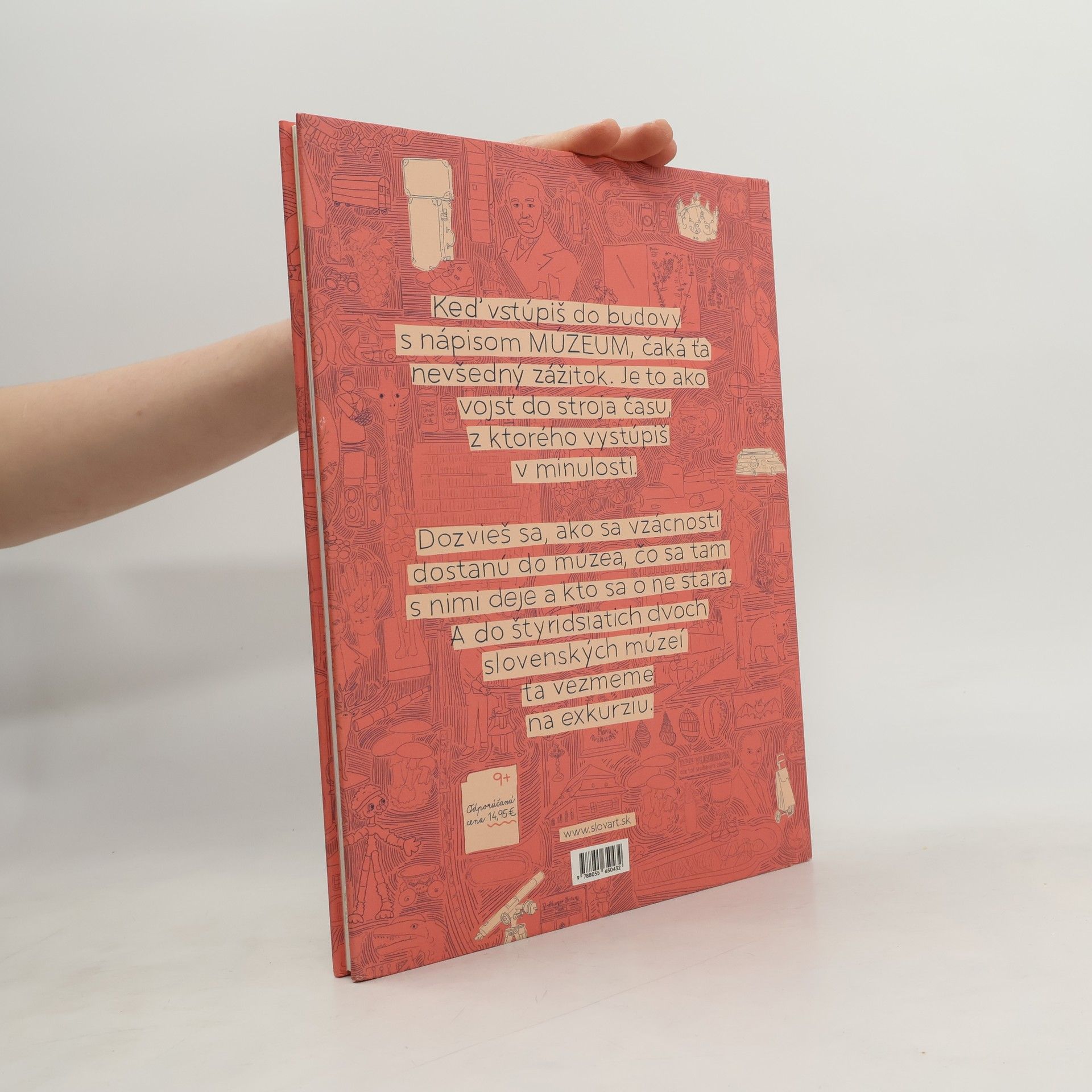 Dobrodružná výprava do slovenských múzeí Bohato ilustrovaná kniha o slovenských múzeách vysvetľuje, ako sa predmety dostanú do múzea, čo sa tam s nimi deje a kto sa o ne stará. Predstavuje približne 40 slovenských múzeí. Ako to kedysi vyzeralo v kláštore, kaštieli či na hrade? Ako ľudia nakupovali a pozorovali hviezdy? Čo sa deje v bani, v lese, v jaskyni či v kúpeľoch? Ako sa učia nevidiace deti, ako vznikajú známky a mince, aká je práca polície a ako vyzerá vojenská poľná kuchyňa?