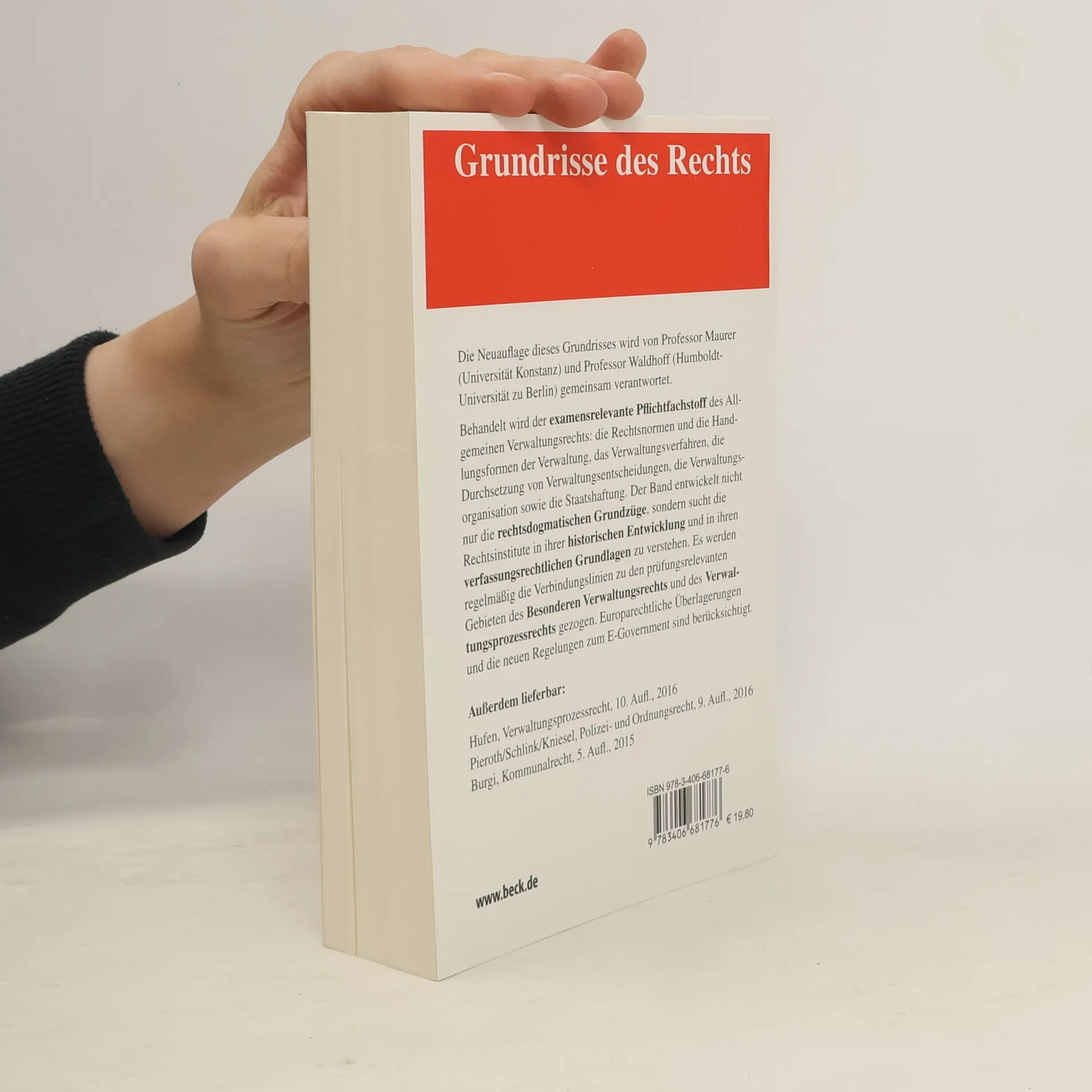 Die Neuauflage dieses Grundrisses wird von Professor Maurer (Universität Konstanz) und Professor Waldhoff (Humboldt-Universität zu Berlin) gemeinsam verantwortet. Behandelt wird der examensrelevante Pflichtfachstoff des Allgemeinen Verwaltungsrechts: die Rechtsnormen und die Handlungsformen der Verwaltung, das Verwaltungsverfahren, die Durchsetzung von Verwaltungsentscheidungen, die Verwaltungsorganisation sowie die Staatshaftung. Der Band entwickelt nicht nur die rechtsdogmatischen Grundzüge , sondern sucht die Rechtsinstitute in ihrer historischen Entwicklung und in ihren verfassungsrechtlichen Grundlagen zu verstehen. Es werden regelmäßig die Verbindungslinien zu den prüfungsrelevanten Gebieten des Besonderen Verwaltungsrechts und des Verwaltungsprozessrechts gezogen. Europarechtliche Überlagerungen und die neuen Regelungen zum E-Government sind berücksichtigt. Außerdem lieferbar: Hufen, Verwaltungsprozessrecht, 10. Aufl., 2016 Pieroth/Schlink/Kniesel, Polizei- und Ordnungsrecht, 9. Aufl., 2016 Burgi, Kommunalrecht, 5. Aufl., 2015